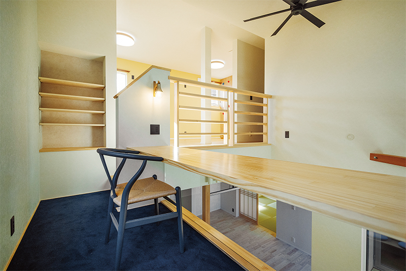 吹き抜けとスキップフロアのある家に憧れがあったので、プランに取り入れていただきました。特にスキップフロアはテーブルを造作したので、日常のいろんなシーンで活躍できています。