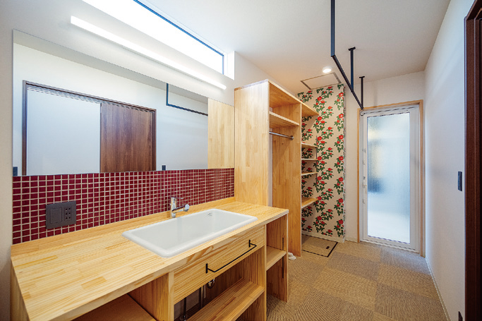 洗面兼ランドリー室はウォークインクローゼットやウッドデッキ(物干しスペース)も近く、家事ラクを実現。銭湯を思わせるタイル貼りもお気に入り。浴室は紅葉を眺めながら入浴できます。