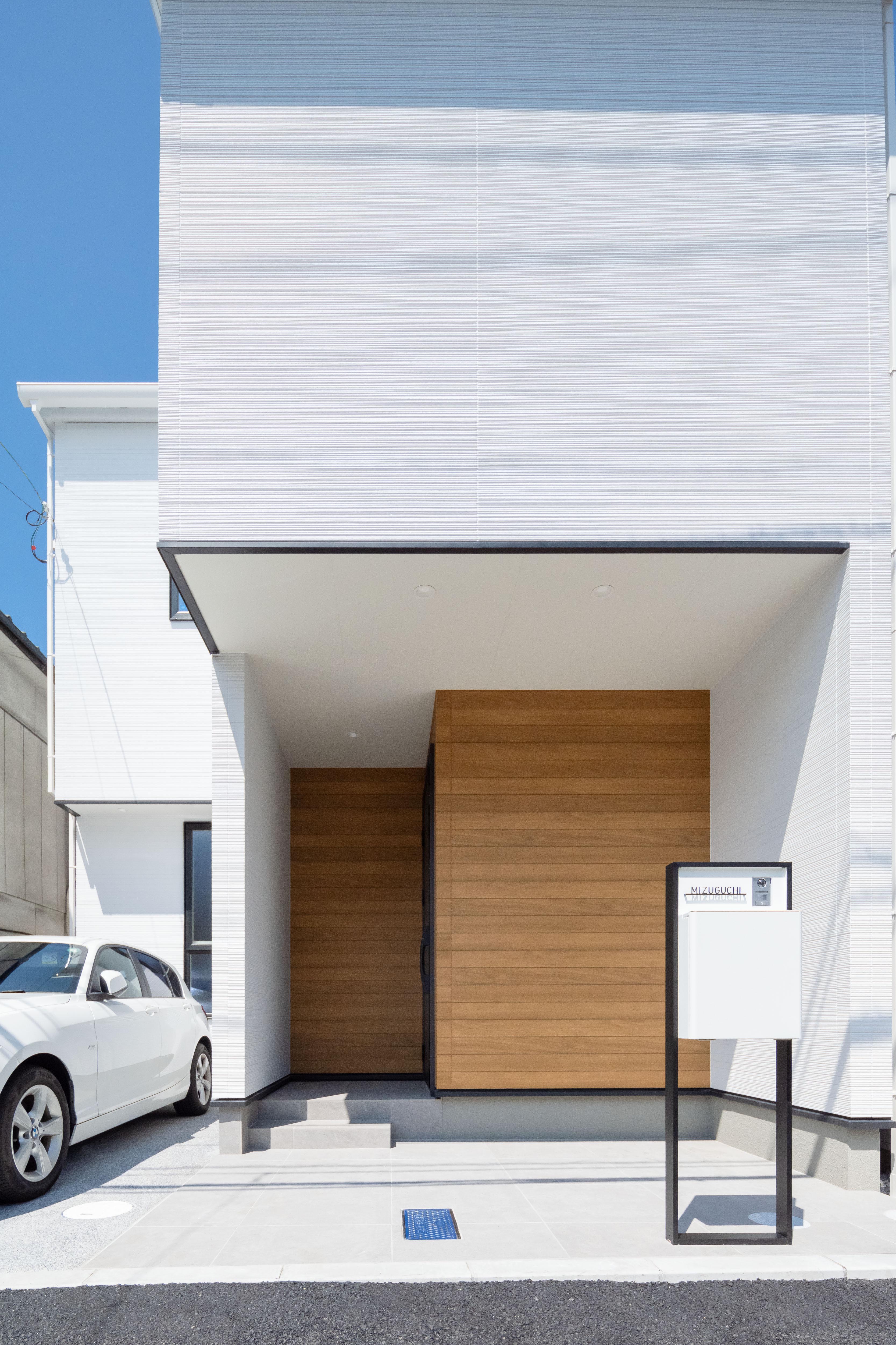 明るい色の外壁に映える木目が外観のアクセントに。軒が深いため、雨の日の出入りも快適です。