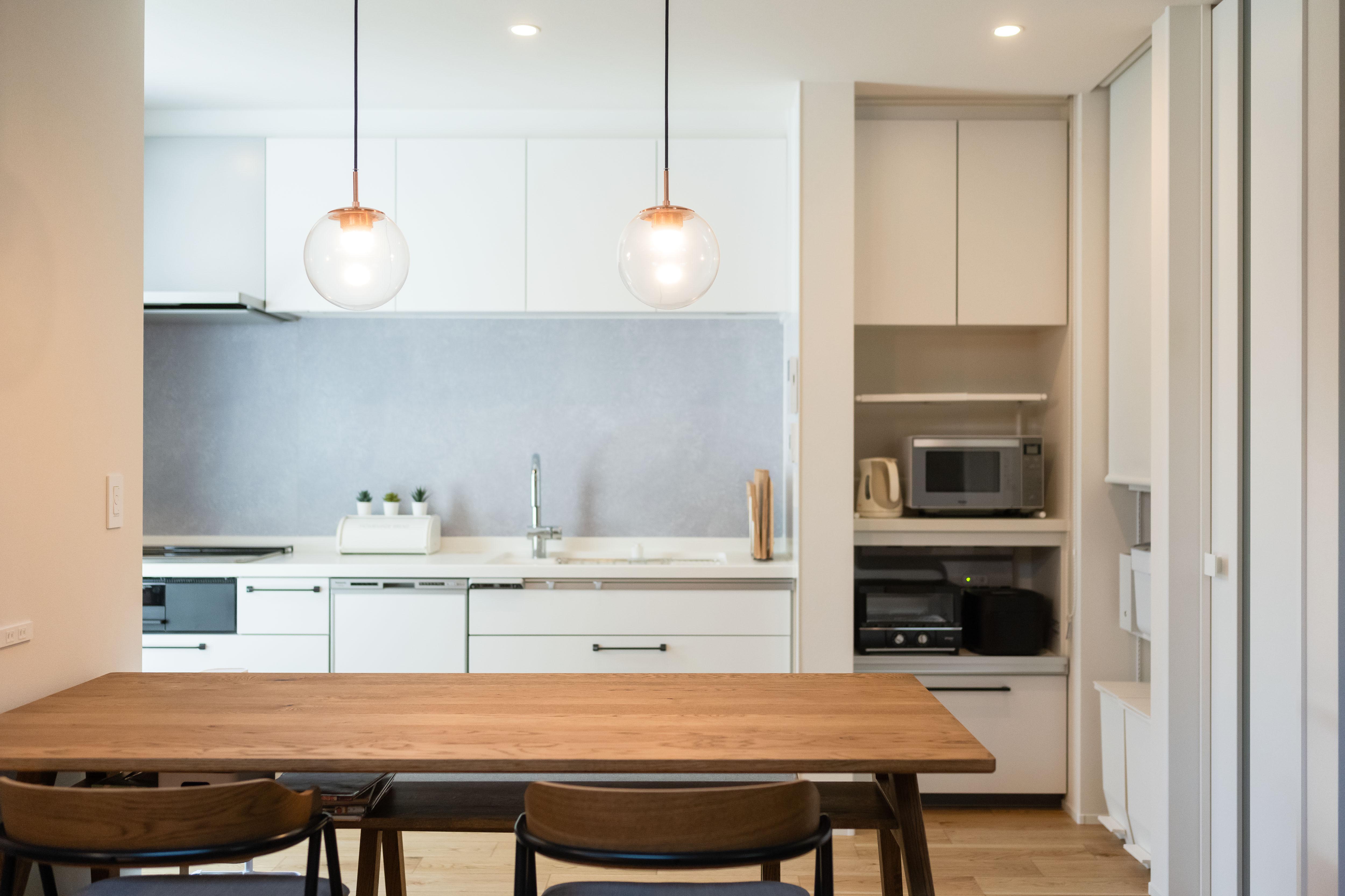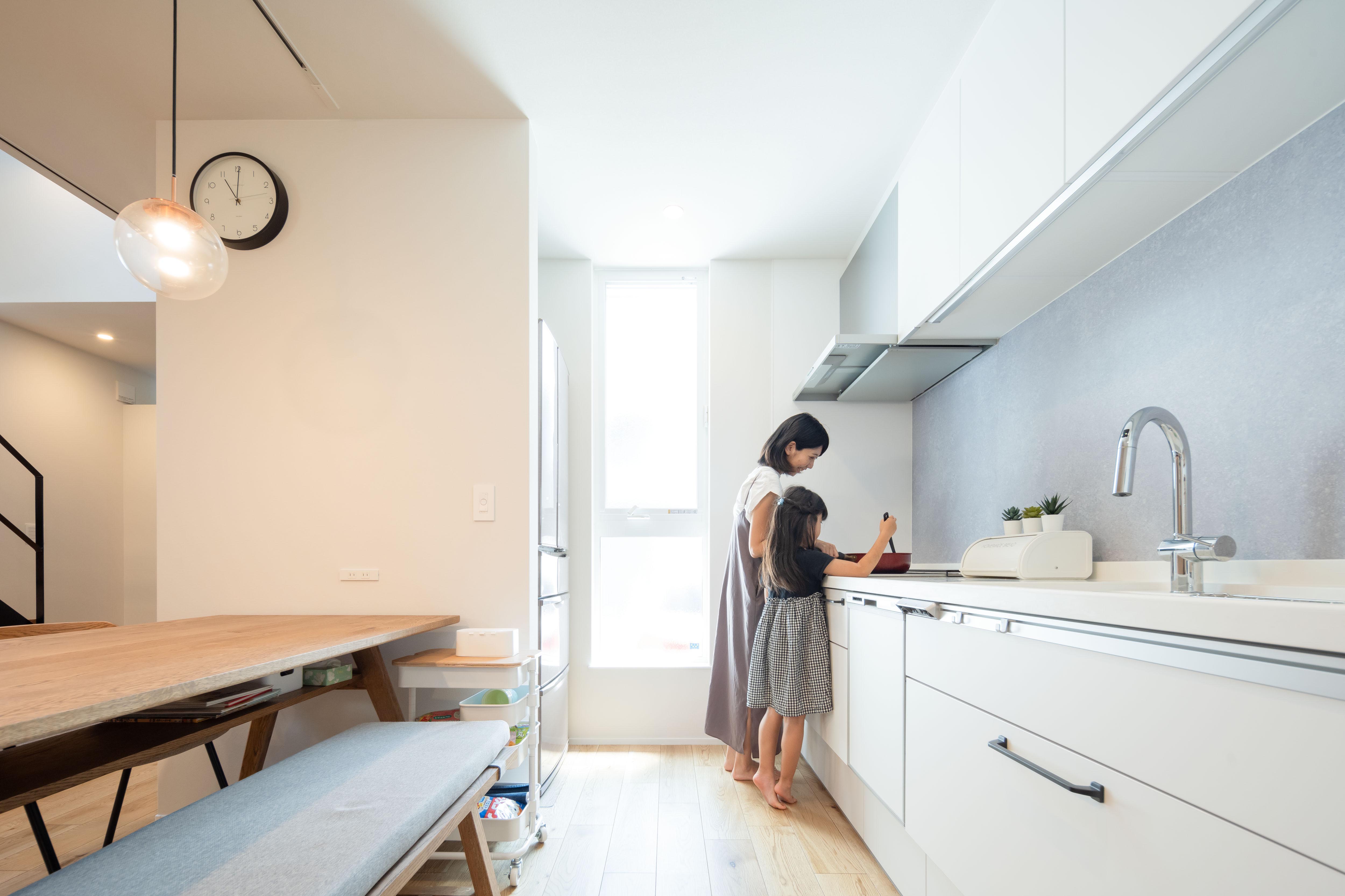 中の空間を完全に仕切らず、緩やかに繋がりを持たせることで視線が抜けて開放感を感じられます。大容量の収納を確保したキッチンは、作業スペースが広くて使いやすいのがうれしい。やさしくて可愛らしい色合いのキッチンパネルもこだわりの一つ。