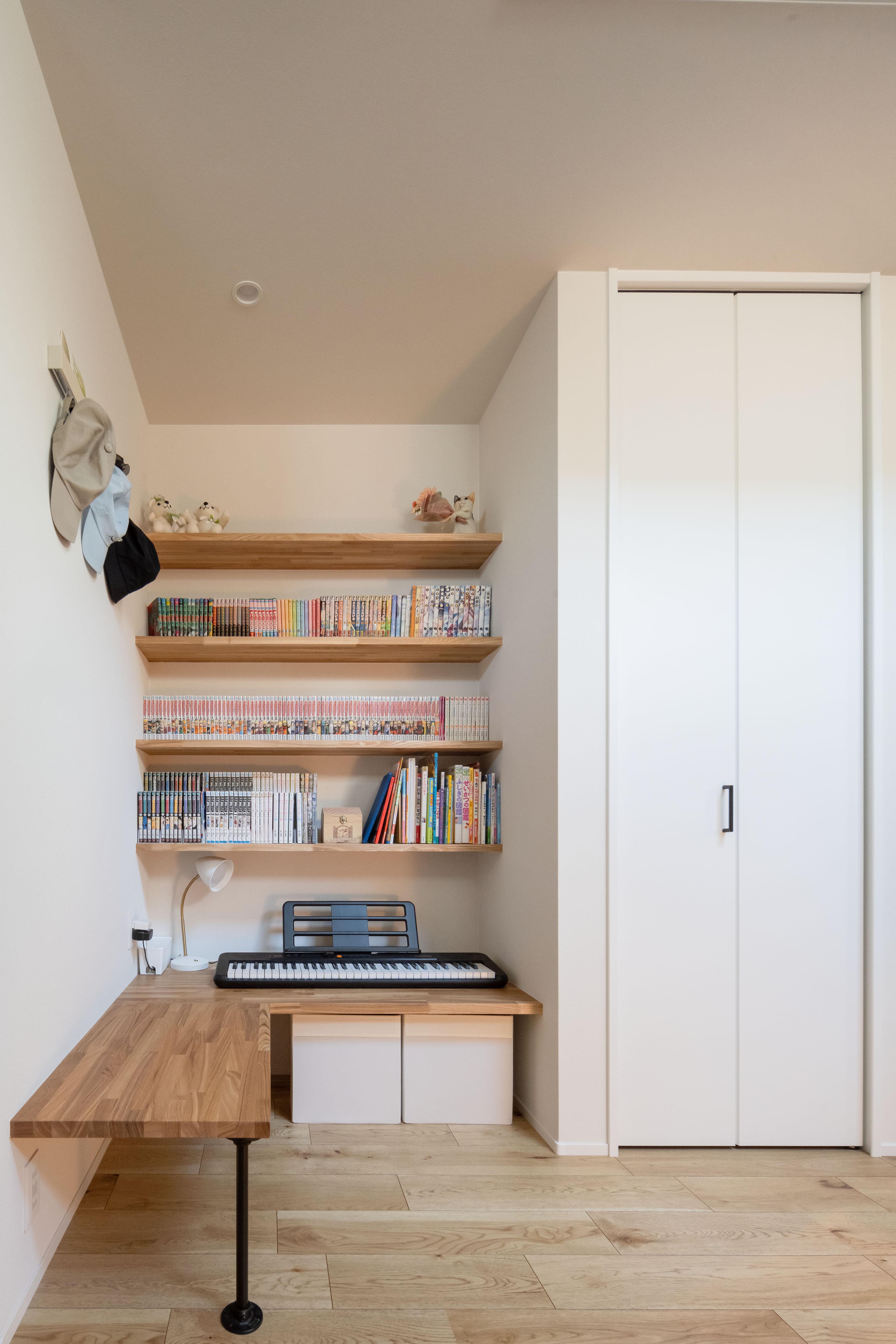 リビングは外からの目線を避けて高窓を設置。目線より上に視界を遮るものがないため、より一層広々と感じられます。リビングの一角にはピアノを弾いたり読書をするためのカウンターと本棚を造作。横の天板はベンチとしても使えます。