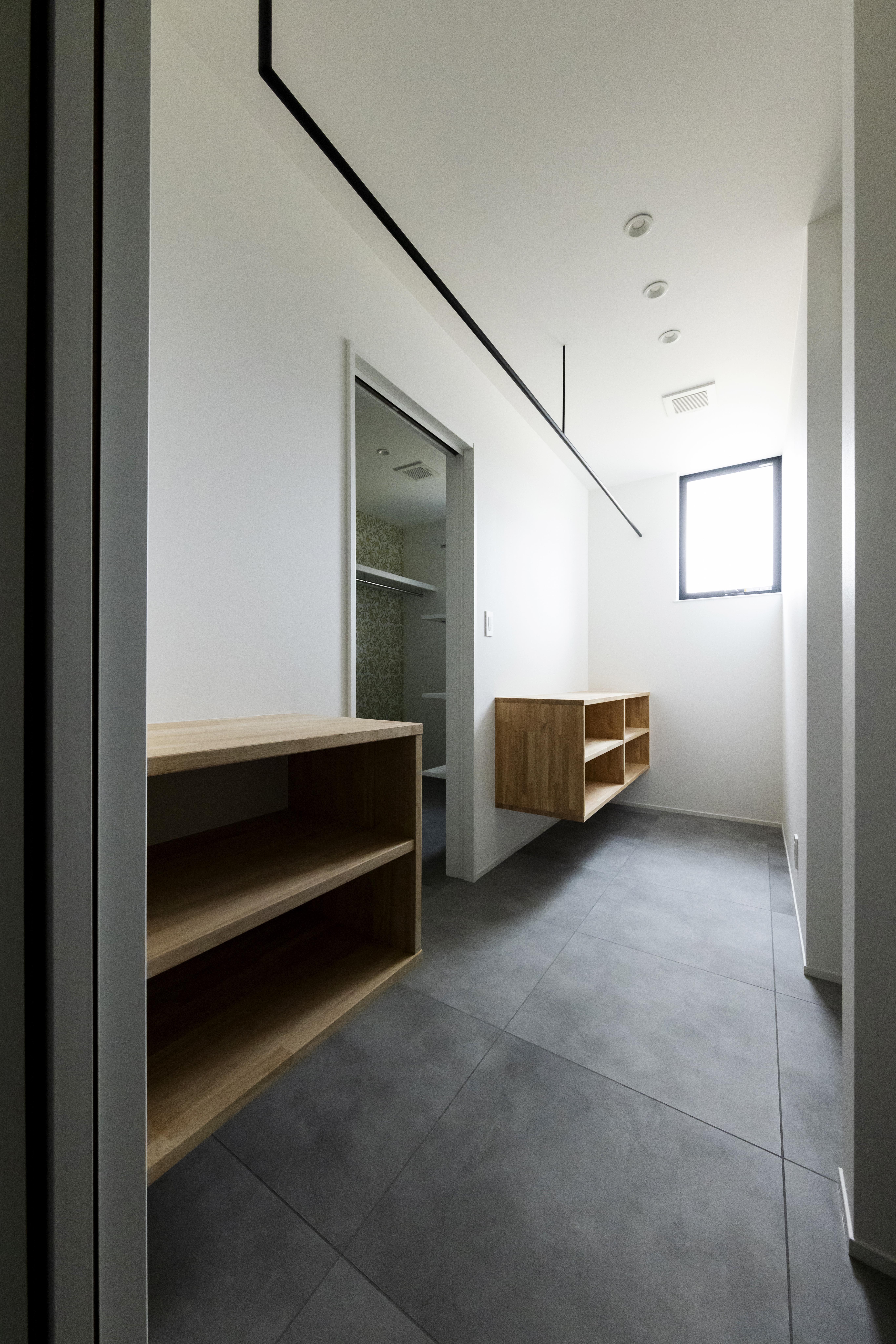 室内母子のできるランドリースペースにはファミリークローゼットを隣接させ、洗濯が終わったらすぐに収納できるようにしました。