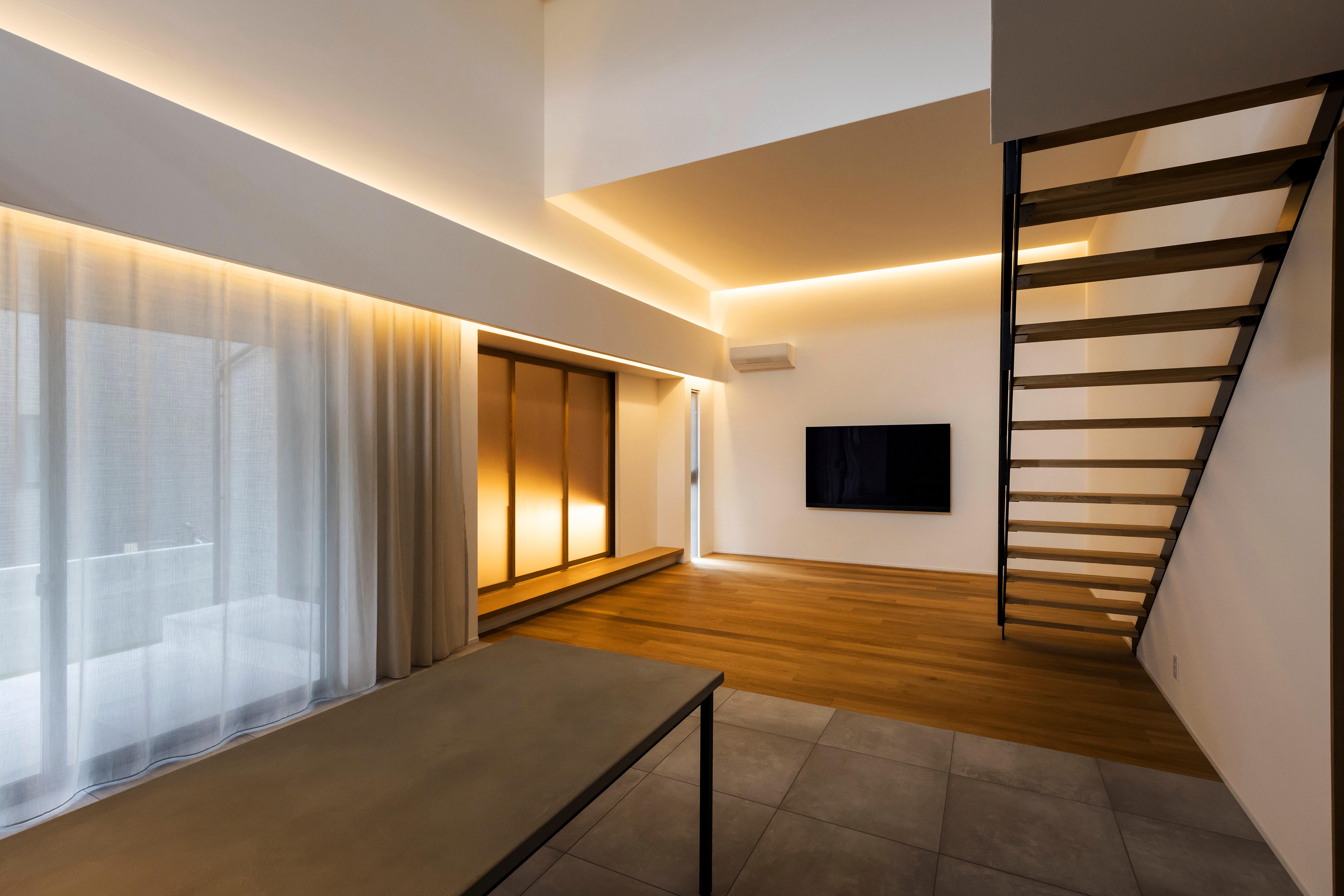 白とグレーに差し色の黒が効いた無機質な空間に木目が温もりを感じさせてくれるシンプルモダンなLDK。吹き抜けを介して2階とつながる大空間が広がり、夜になれば間接照明が壁にやわらかな光と影を描き出します。