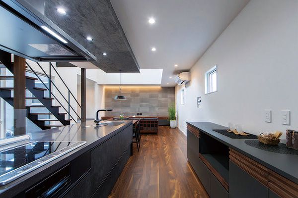 パブリック棟1階は、吹き抜けのリビングとダイニング、小上がりの畳コーナーが一体となった大空間。光が差し込む大窓に沿うストリップ階段が、インテリアとしても存在感を放っています。グレーを好まれるKご夫妻のために、スモーキーなグレーをモチーフカラーにし、キッチンの天井部や天板には、グレイッシュな石タイルや人造大理石を採用しました。キッチン収納やTVボード、ダイニングセットなどはオリジナルデザインによる造作。統一感を持たせながらも、天板部の色合いを変えるなどの工夫が施されました。2階にはそれぞれゆったりとしたクローゼットを持つ子ども部屋2室をレイアウト。LDKに居ても、ホールを介して子どもたちの気配を感じることができます。