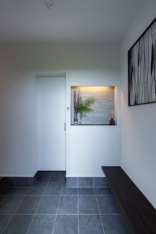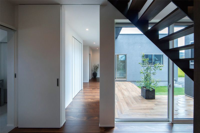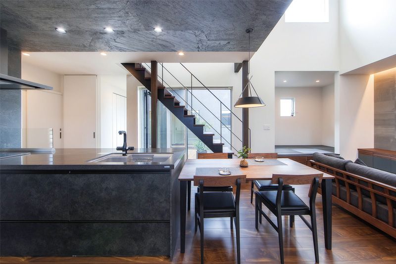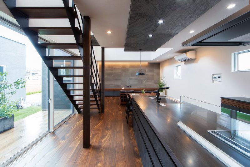高さの異なる2棟がウォルナット調の木部によって繋がったファサード。その洗練された雰囲気そのままに、邸内もホテルライクで上質なしつらえでコーディネートされている。間取りは玄関の左右に高さのあるパブリック棟と、落ち着いたたたずまいのプライベート棟を振り分け。中庭を包むコの字型に居室を配置した。パブリック棟1階は、吹き抜けのLDKと畳コーナーが一体となった大空間。大窓に沿うストリップ階段が、インテリアとしても存在感を放つ。スモーキーなグレーをモチーフカラーにし、キッチンの天井部や天板には、石タイルや人造大理石を採用した。キッチン収納やテレビボード、ダイニングセットなどはオリジナルデザインによる造作。主寝室との行き来には、玄関からとウッドデッキ越しの2ウェイの動線を確保し、家族それぞれの程よい距離感を尊重しながらも、つながりを意識することができる。