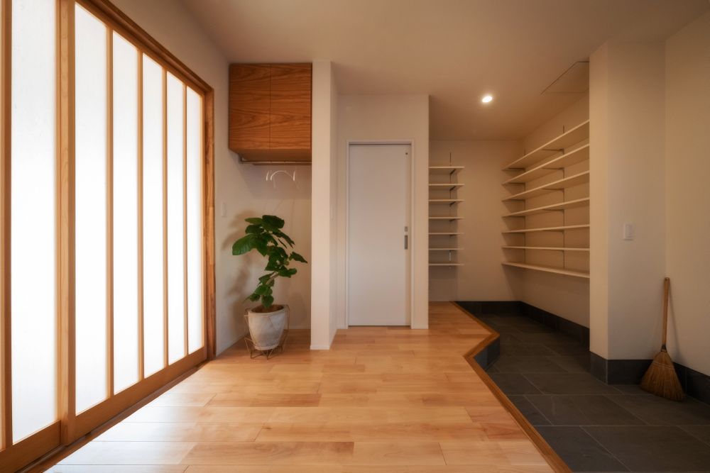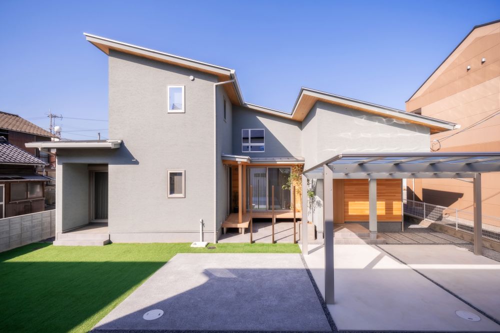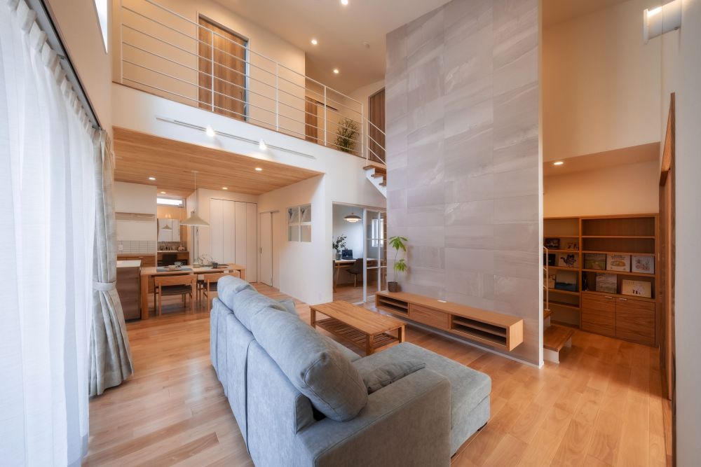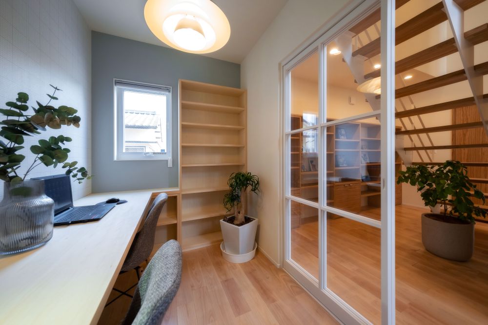 素敵、快適、適度。3つの「テキ」を叶えた家。吹き抜けリビングには立ち上がりの壁をつくり、その背後が階段ホールになっている。階段に沿うように、壁面には大容量のブックシェルフを造作。階段をベンチ代わりに読書を楽しむのも素敵。立ち上がりの壁によりリビング側からは資格になるので、おこもり気分も味わえる。天井高を抑えることで落ち着き感を演出したダイニングキッチンの横には、リモートワークにも対応する書斎コーナーをレイアウト。ガラス越しに家族の気配を感じながらも、集中することができるスペースだ。キッチンとリビングは中庭に面しており、南からの光がさんさんと降り注ぎ快適。どちらからもL字型の縁側に出やすいため、中庭の活用も広がる。奥行きを持たせた玄関土間は、オープンスタイルの収納もあり、収納量も適度。家族のための「テキ」が随所に散りばめられた住まいとなった。