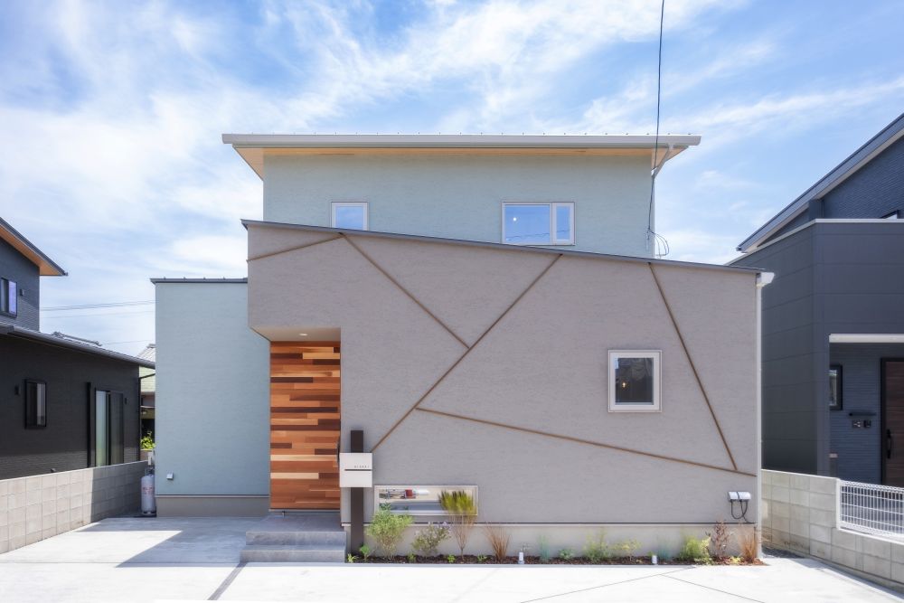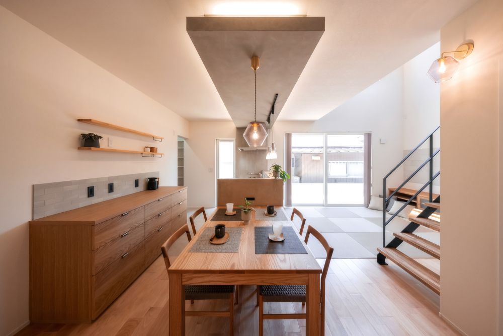 塗り壁に埋め込んだ真鍮のモールディングが、個性的でありながら上品な表情を生み出しているファサード。こだわったのは照明計画。ダウンライトを一切使わず、間接照明やスポットライト、ペンダントライトなどの照明器具と効果的に取った開口からの自然光で十分な採光を確保。ウッドを多用したナチュラル感のあるデザインテイストにしっかりと馴染んでいる。キッチンはモールテックスの立ち上げ壁で覆い、背面収納や調理中の手元を上手く隠している。1階は扉をあえてつくらず、デザインパネルで程よい死角を生み出し、緩やかにゾーニングした。