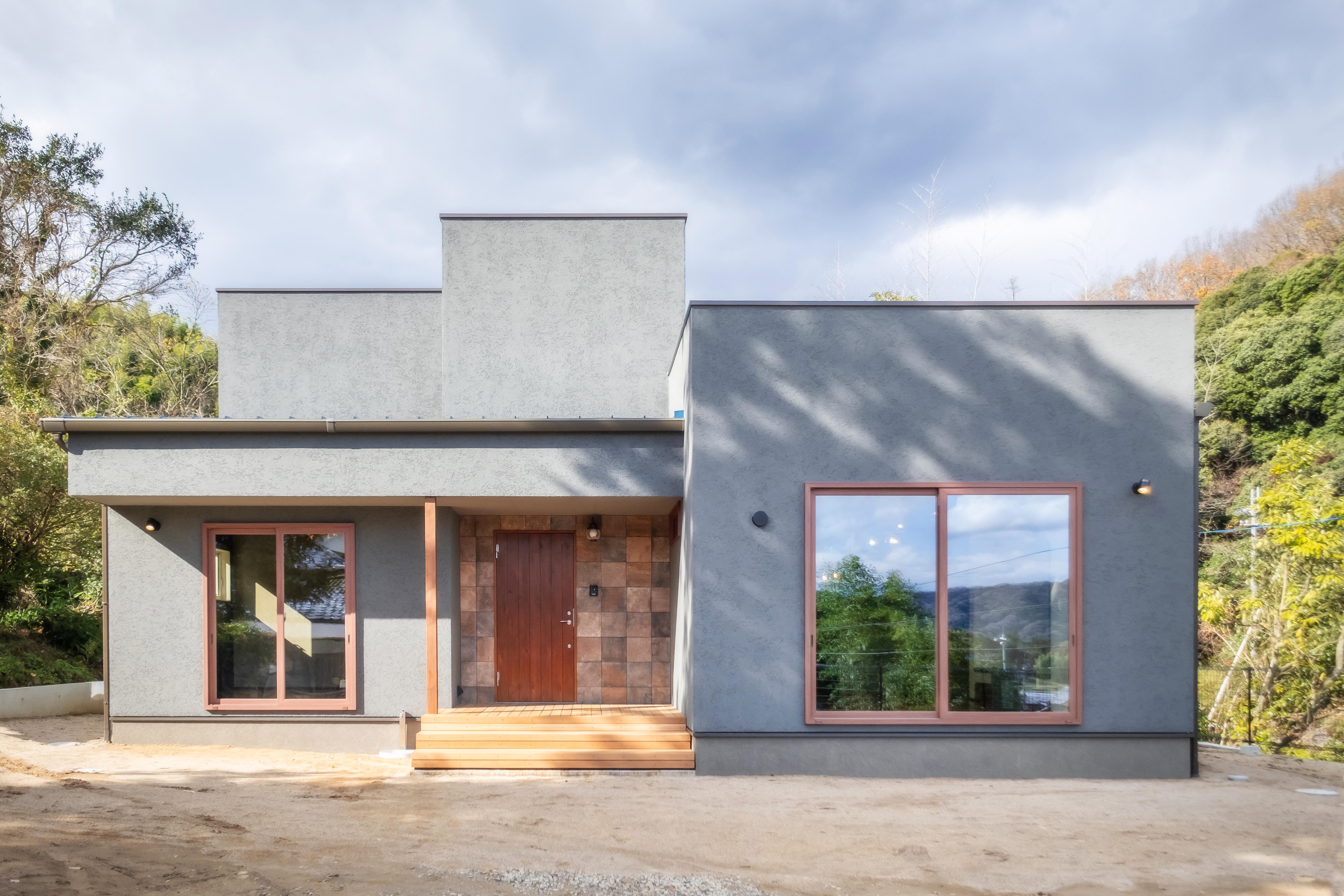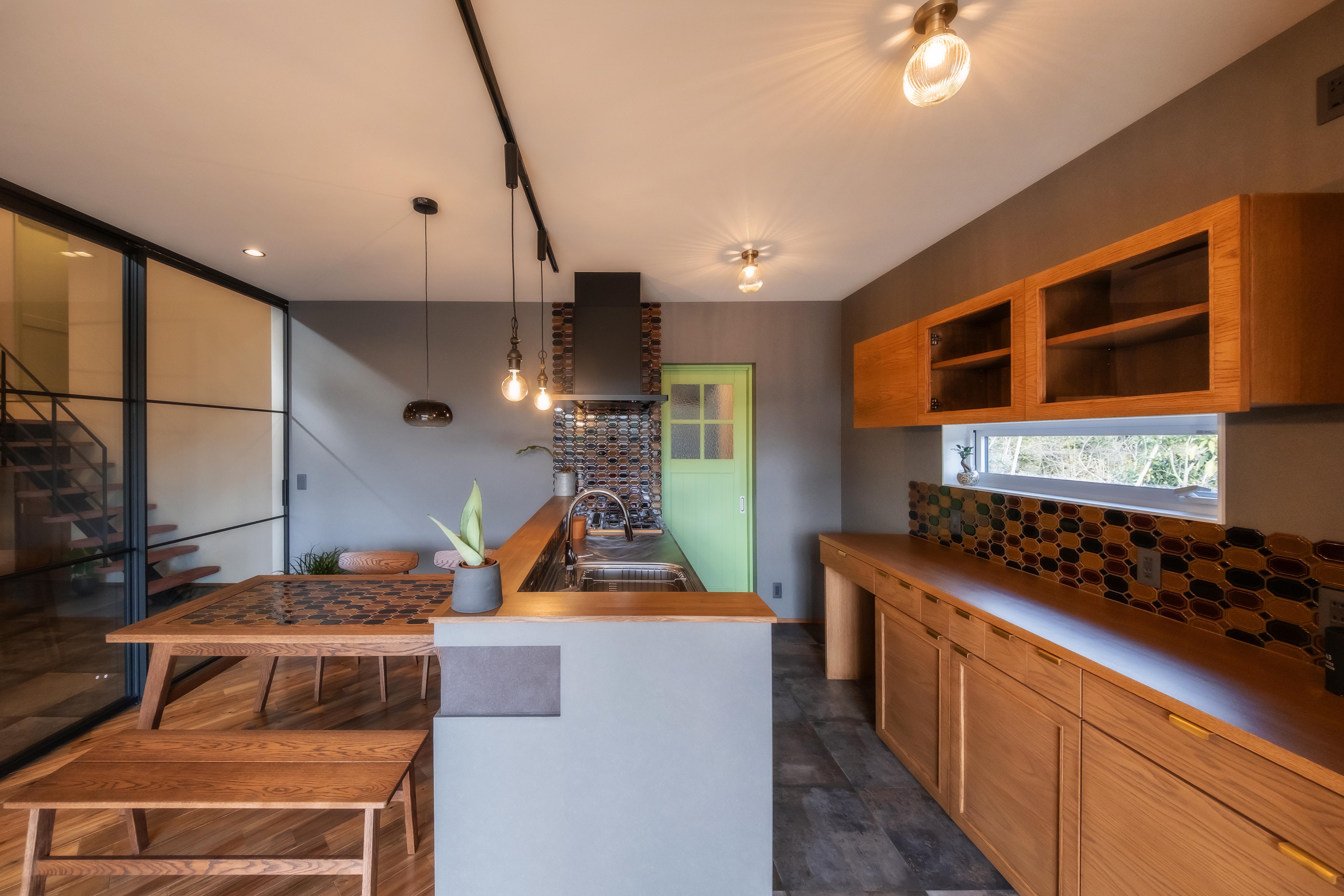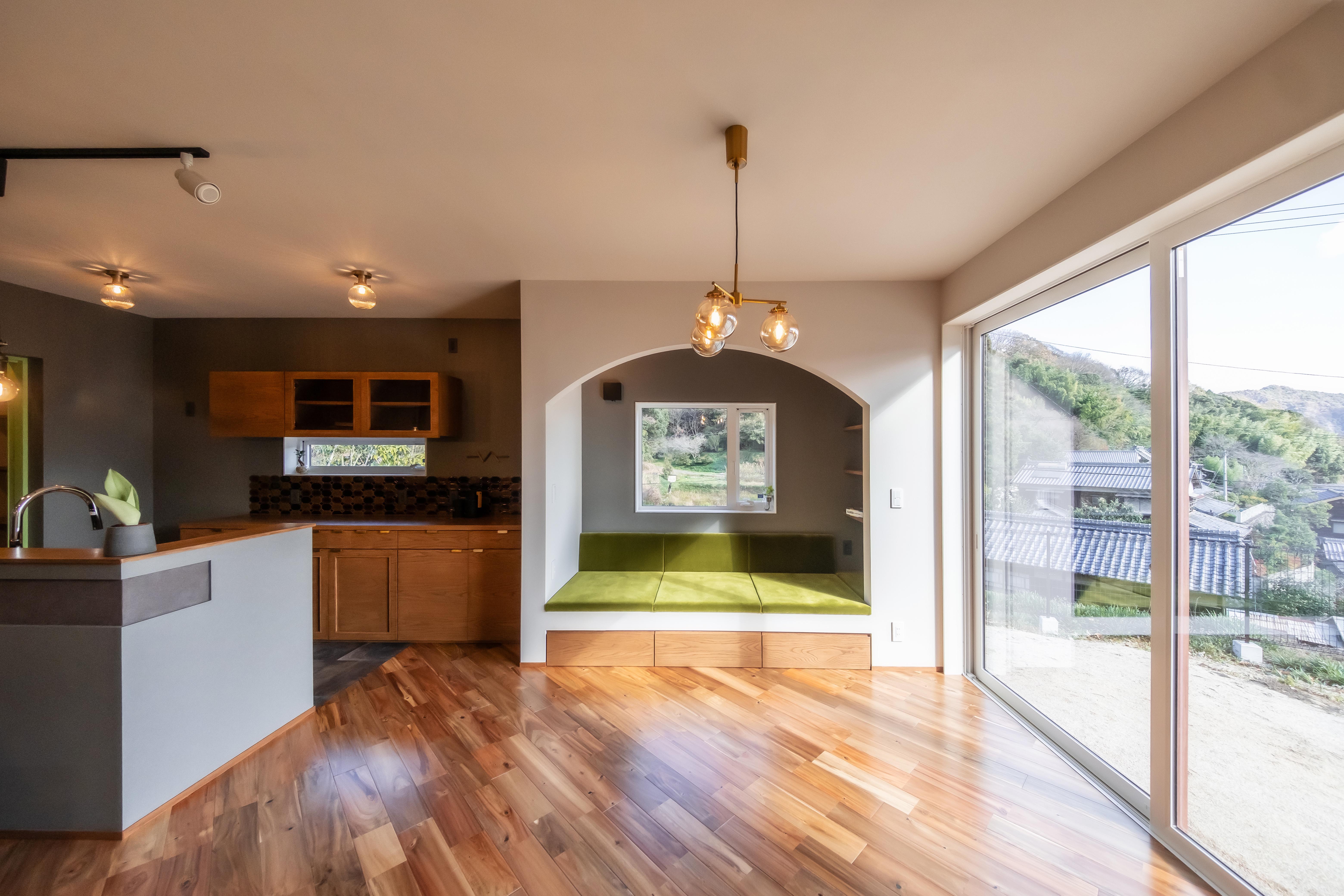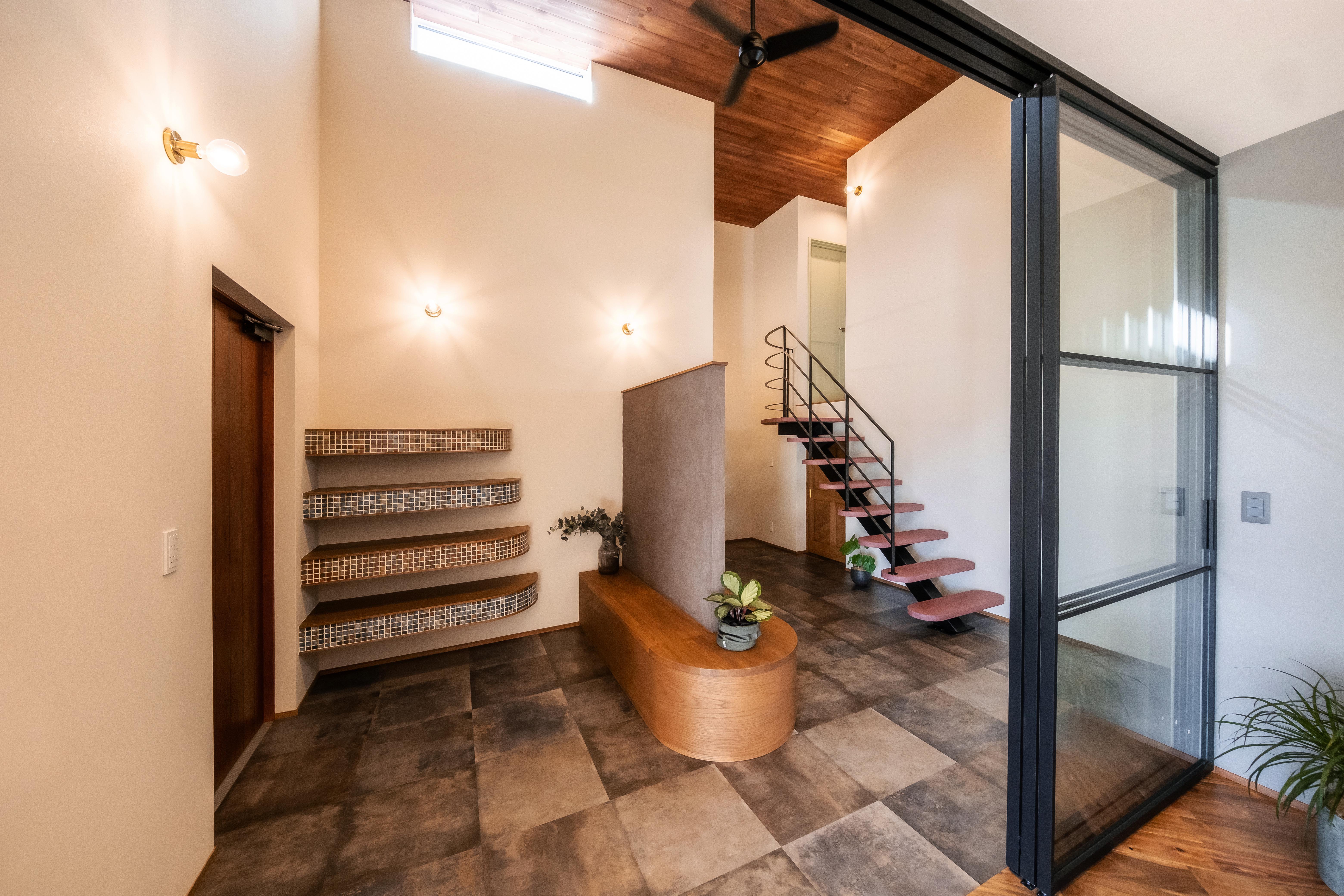 ヴィンテージやモダニズム、エキゾチックなど多様なデザインテイストをミックスした「Mountain Gallery」。インテリアに造詣の深い施主さまとワイズホームが、一つひとつ要素を組み合わせながらつくりあげた建物は、住宅の概念を覆すものとなり、ミッドセンチュリーの世界観にも通じている。玄関フロアは、居住空間と段差をつくらない大胆なつくり。Rを効かせたタイル貼りのシューズボックス、ベンチを兼ねた収納、階段の踏み板など、直線と曲線のバランスが絶妙なオリジナルデザインが圧巻。ガラスの引き戸を開け放てばLDKへとつながり、大窓からは邸名の由来ともなったロケーションが望める。片隅に設けたヌックは、多様な使い方ができる空間。山の稜線を眺めつつ、豊かな時間が紡がれていく。