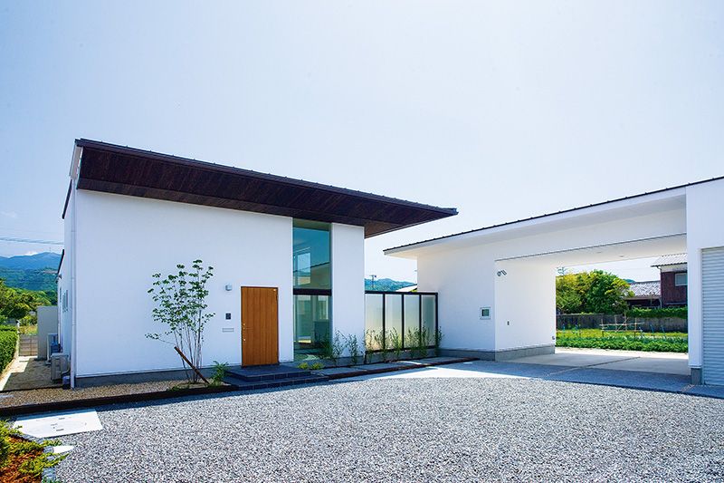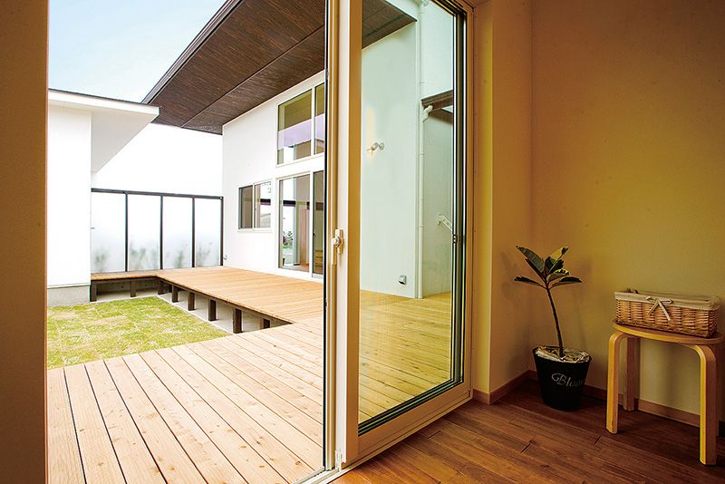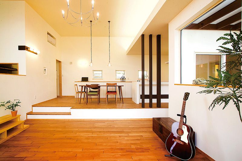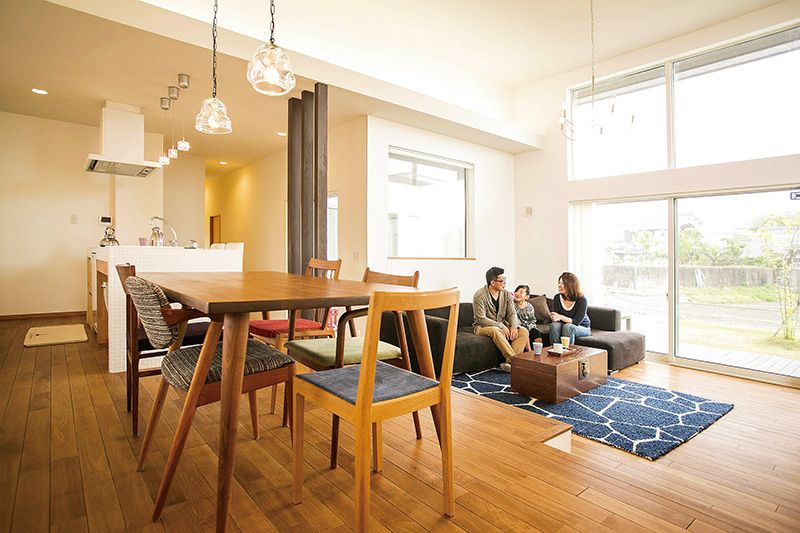 広い敷地を活かして平屋を選択したDさま邸は、来客が多いことから、LDKにボリュームをもたせた。より開放感を生み出すために、リビング部分はダイニングキッチンよりも床のレベルを下げ、掃き出し窓の大開口から庭への広がりと同時に高さも演出している。一方でレベルの上がったキッチンやダイニングから庭方向への見通しもよく、結果的に空間全体が大きな開放感を得られた。モザイクタイルで仕上げたアイランドキッチンは、大勢でキッチンに立てる充分な大きさに造作した。プライベートゾーンはパブリックと程よい距離感を保つようL字型に配置。防災面への配慮から各居室からも直接デッキや庭に出ることができるようにしている。パブリックから「見せない」レイアウトでありながら、大容量の収納も確保した。さらにメインの居住空間とウッドデッキで結ばれた離れの和室は、ユーテリティなスペースとして活用。アーキテクト工房Pureの基本性能である高い気密性と断熱性も実現している。