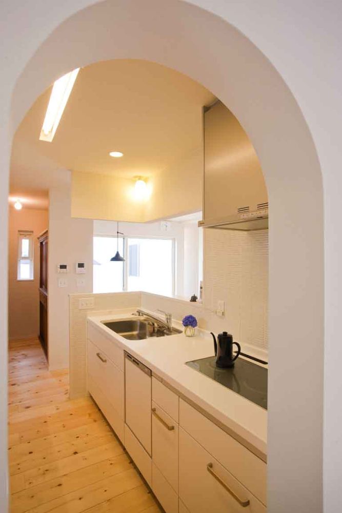 間口に対して奥行きのある敷地に建つK様邸は、玄関を入るとまずLDK、中庭をはさんだ奥に主寝室やバスルームをレイアウト。パブリックとプライベートをコリドーで結んでいる。LDKはもちろん、そこにある小上がりの畳コーナーも、主寝室も、部屋としての仕切りは一切なし。1階全体がひとつの大きな空間としてつながっている。大空間ではあるが、建物全体を高断熱化することで建物内の温度変化を最小限に。さらに上昇する暖気の性質を応用した換気システムで、夏は換気をしながら温度上昇を抑えるという。邸内全体が一年中心地よい空気で満たされる。建物全体の環境をコントロールすることにより、住む人の希望する大空間のドラスティックなデザインが可能になるのだ。