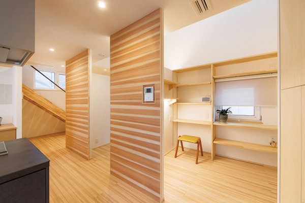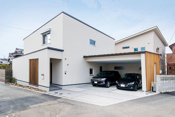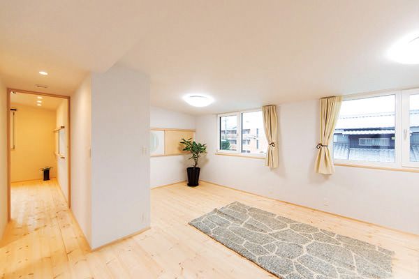ゆとりある敷地にホワイトを基調とした、美しいファサードが目をひくFさま邸。圧巻の吹き抜けリビングは、ドイツ製の木製トリプルアルミクラッドサッシ・樹脂トリプルサッシ、外付ブラインドを施した大窓があり、効率的に太陽光や太陽熱などの自然エネルギーを活用できる。床は1・2階ともに無垢材を使用し、キッチン部分のみリノリウムを張っている。リノリウムは亜麻仁油や石灰岩、木片、コルク片などの成分で構成された天然素材で、有害物質が発生しないという特性がある。さらに亜麻仁油の抗菌作用、高い耐火性能をもつこともメリット。このほか、家事室やキッズルームなどの居室も、仕切りを最小限として開放感をもたせているが、高い断熱性・気密性のにより、温度管理は万全。また太陽光で電気を、太陽熱で給湯をまかない、外気清浄機+24時間換気システム+アメニティーエアコンにより、新鮮でクリーンな空気で全館空調を行っている。
