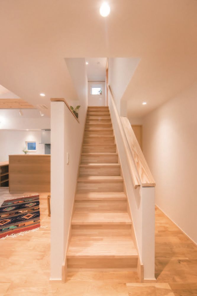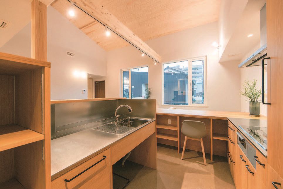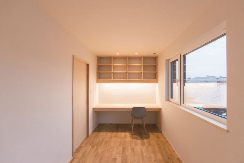 注目はダイニングキッチン。キッチン、ダイニングテーブル、キッチン収納をコの字型に配置し、ゆったりとった作業スペースは床を一段下げています。これにより程よいおこもり感があり、畳敷の造作ベンチはそのままゴロンと横になってもOK。吹き抜けが心地よいリビング部にも造作の収納やニッチの棚をつくり、壁付の収納は玄関へと連続させています。スタディデスクやブックシェルフを造作した書斎もあり、使い心地にとことんこだわった住まいとなっています。