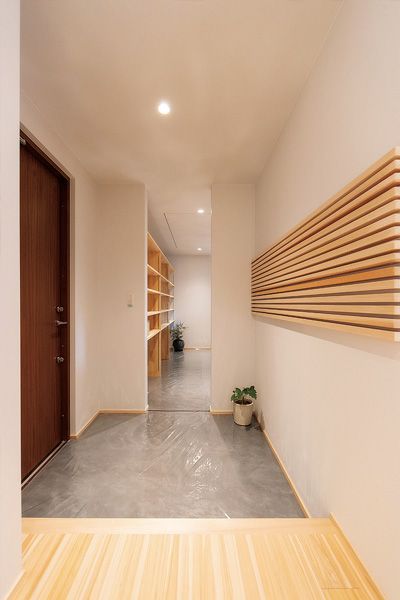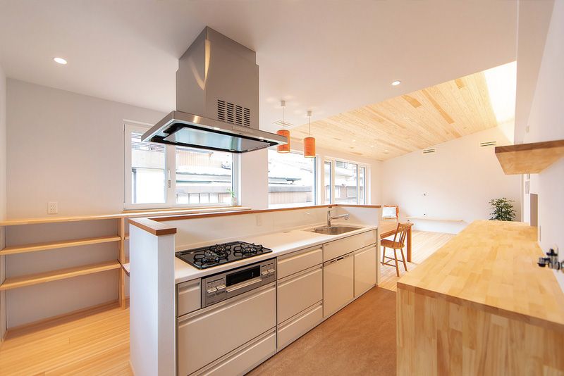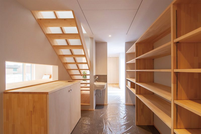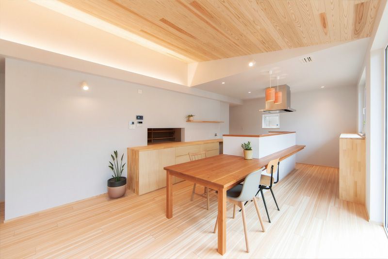1階にLDKと水まわり、主寝室、2階に子ども部屋をレイアウトし、玄関を入ると2つの動線が描かれている。上がり框側はリビングへとつながり、反対側は長い通り土間が続く。通り土間はキッチンの裏側にあたり、造作の収納や手洗いを経て、ダイニングキッチンへと回遊する。キッチン背面収納と土間の靴箱の上部には、趣味のアクアリウムの水槽を置くスペースを設けた。Kさま邸には全館空調として24時間換気、温度湿度のコントロールをする空調を1台でこなすヒートポンプ式全熱交換換気システム(Zehnder Comfohome)を初導入。その効果により、邸内には1年中健やかな環境が生み出されている。