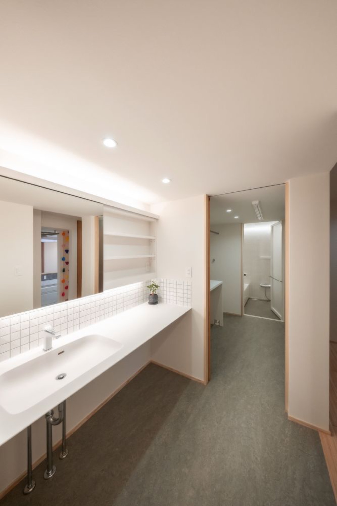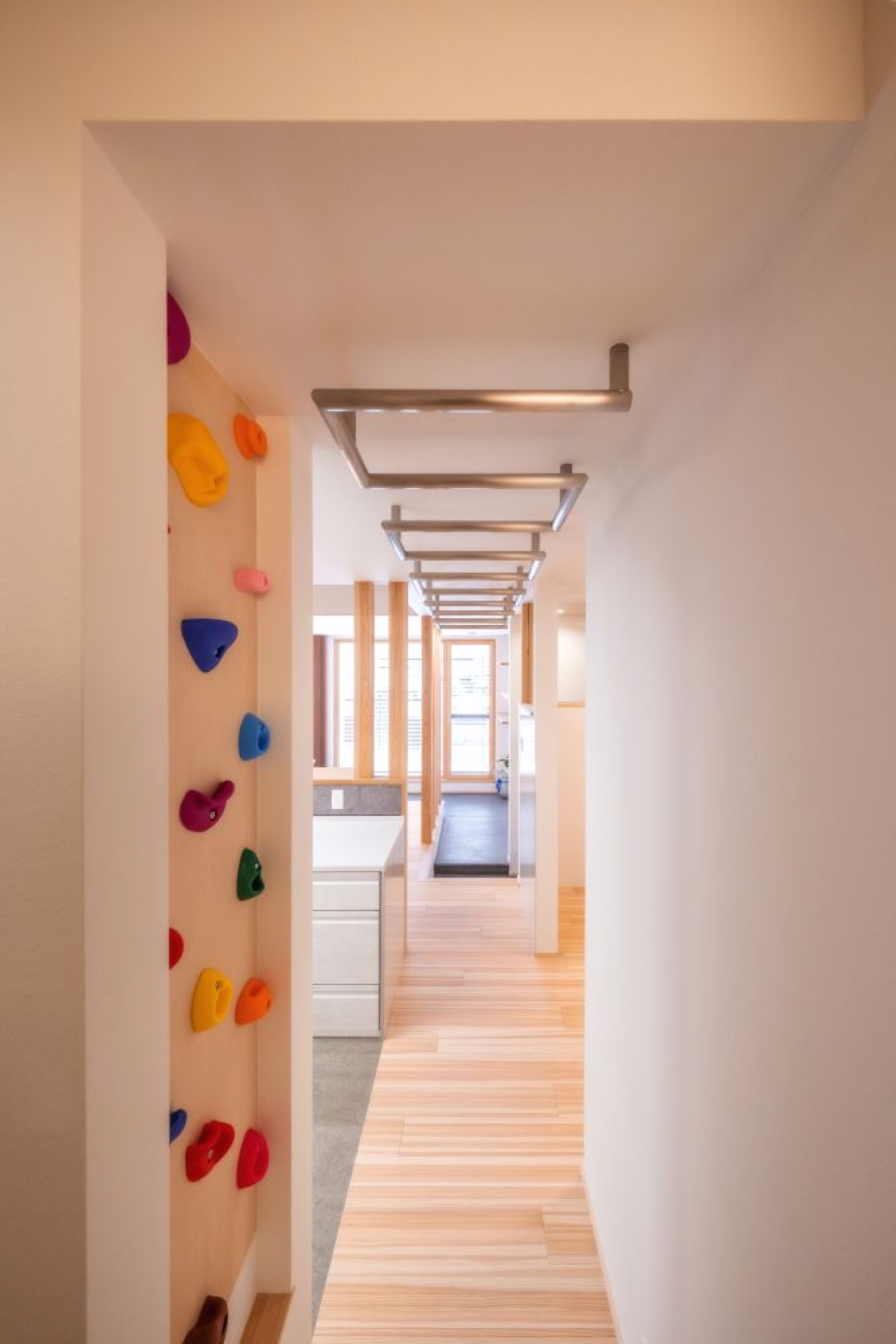 準防火地域ということで、防火シャッターを採用。さらに、日射をコントロールする外付けブラインドも設置したため、袖壁を出してスマートなデザインに仕上げました。また、内部にもこだわりは多くあり、造作家具や、格子貼りの天井。そして、アクティブに体を動かせるように、ボルダリングや雲梯もあり、遊び心も満載なお家となっています。