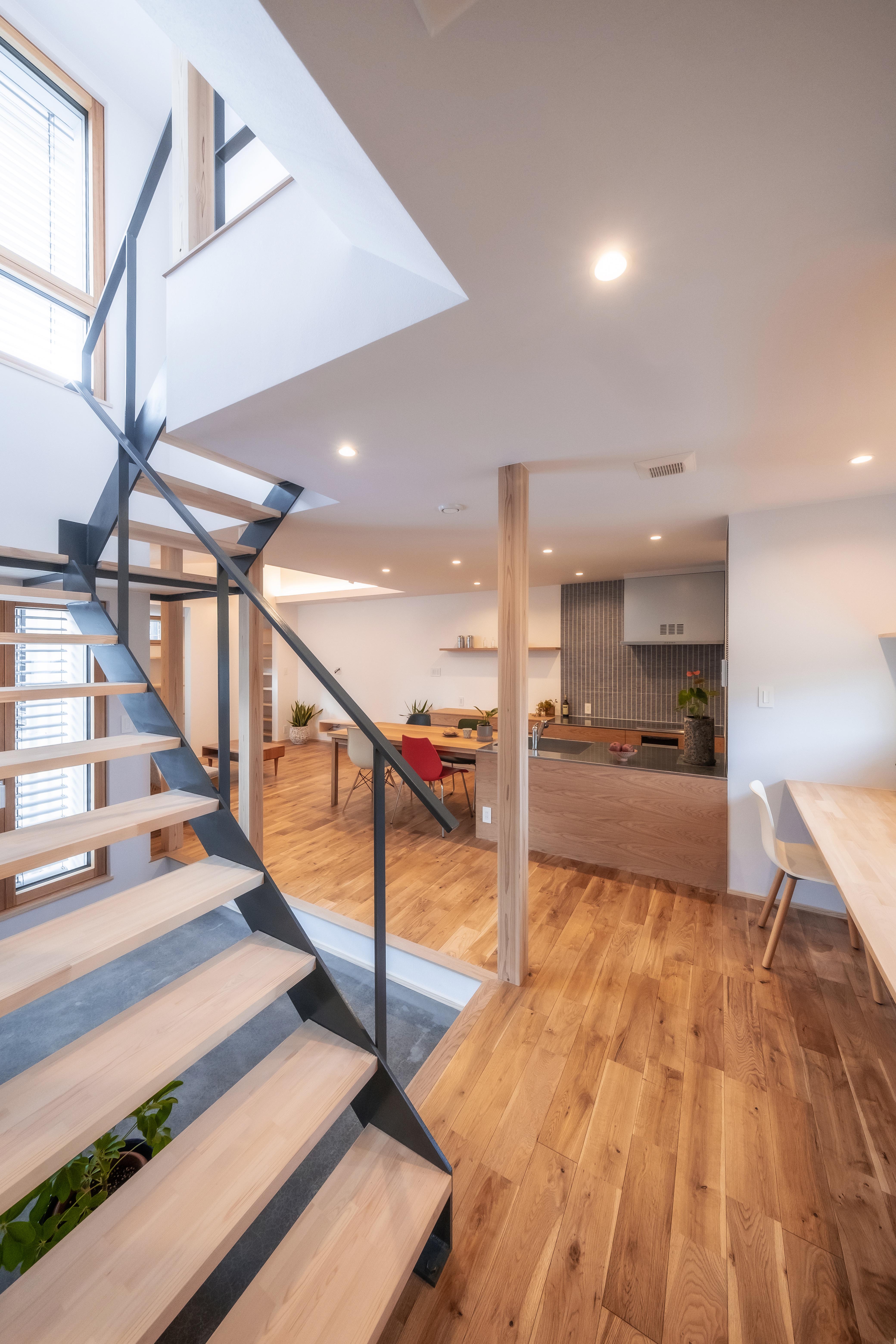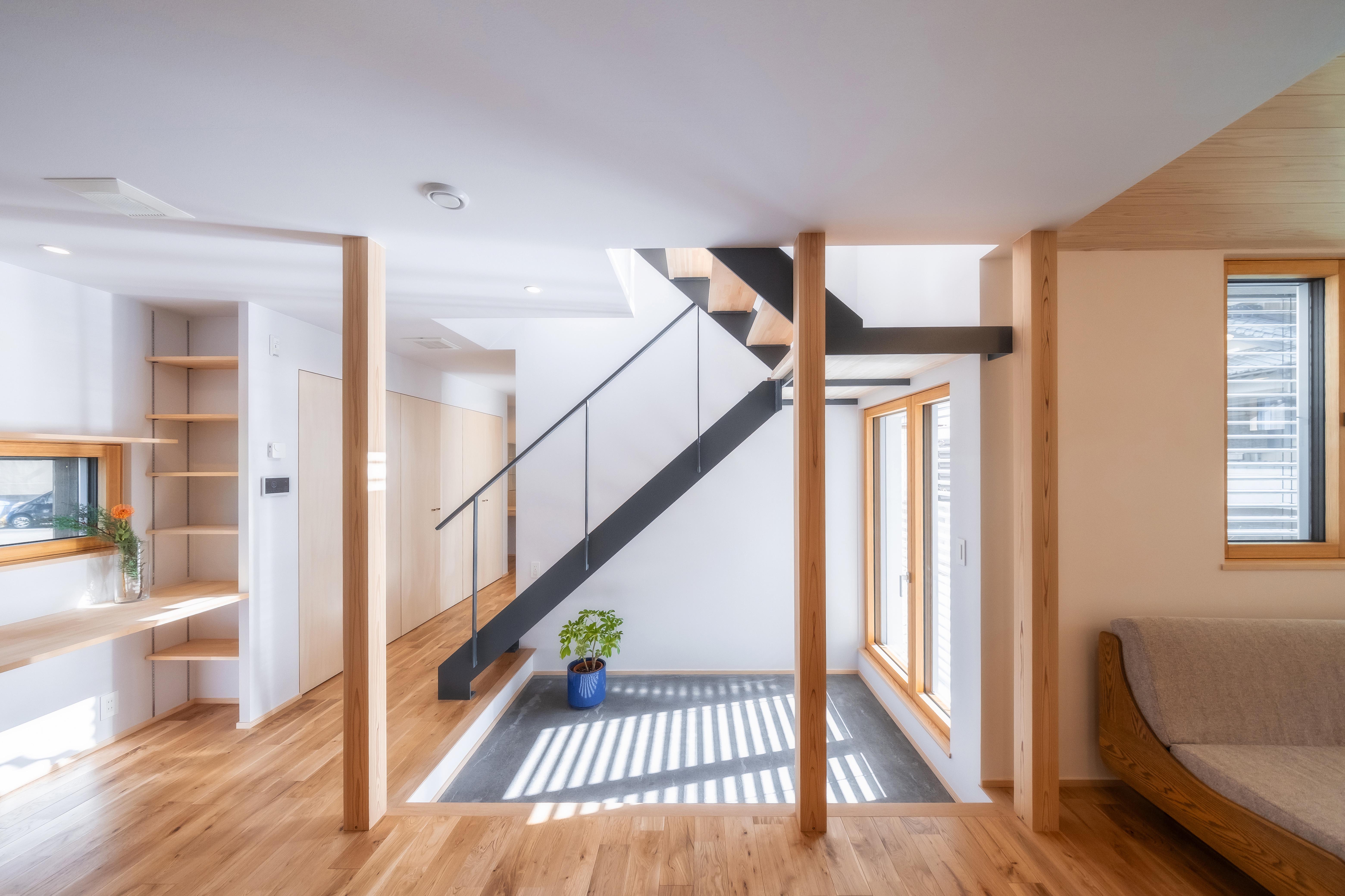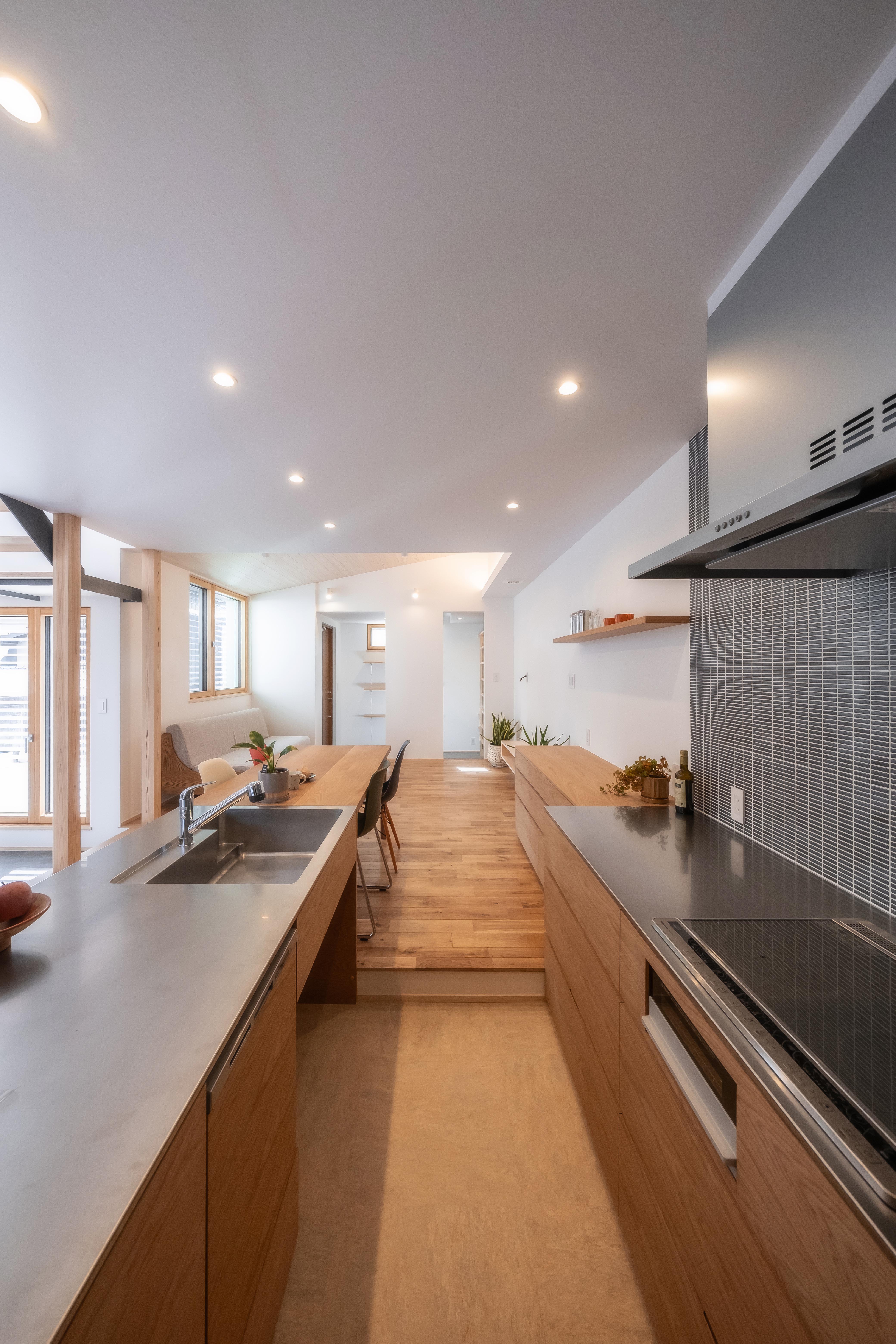 暮らしを豊かにする仕掛けとして、1階に取り入れたのは階段下スペースを活用した土間。光や風を効果的に取り込み、各所に心地良さを拡散してくれる。加えて自転車の保管・メンテナンスの場所としても重宝。使いやすいⅡ型の造作キッチンには、無垢のナラ材を施した。シンクから延長させたダイニングテーブルで、家事効率を向上させる。漆喰の塗り壁や紙クロス、ナラや杉柾目材など随所に自然素材を使用。高い性能に全館空調をプラスした、パッシブハウスとしての機能を満たした住まいとなっている。