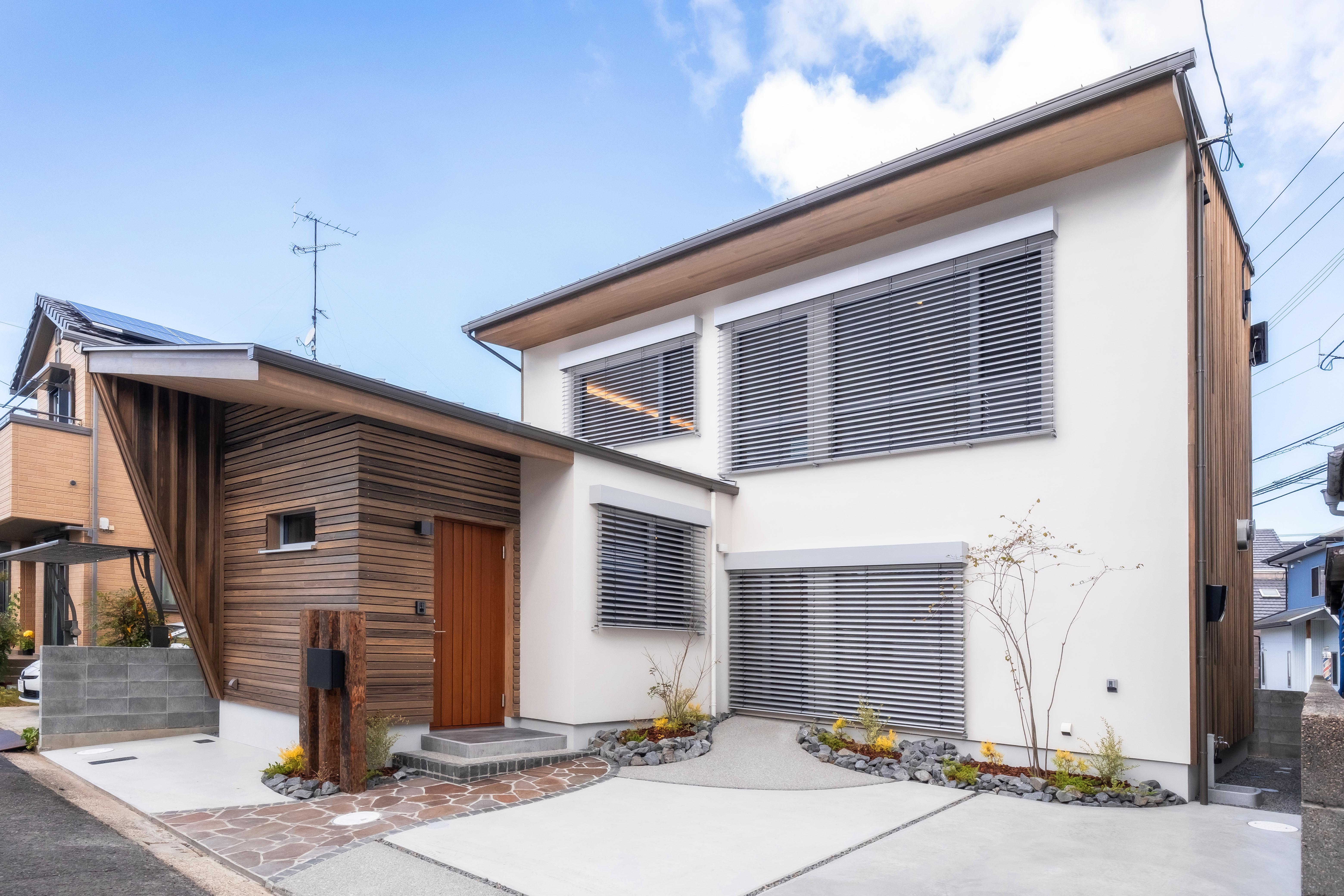 塗り壁と杉板張りで仕上げた外観。敷地は西に45度も振っており、隣家も迫っていることから、日射取得できる範囲は限られている。効率よく日射を受け止めるために、高性能トリプルサッシのスマートウィン「佐藤の窓」を採用。夏は日射を遮蔽するために、5つの窓には外付けブラインドを設置した。