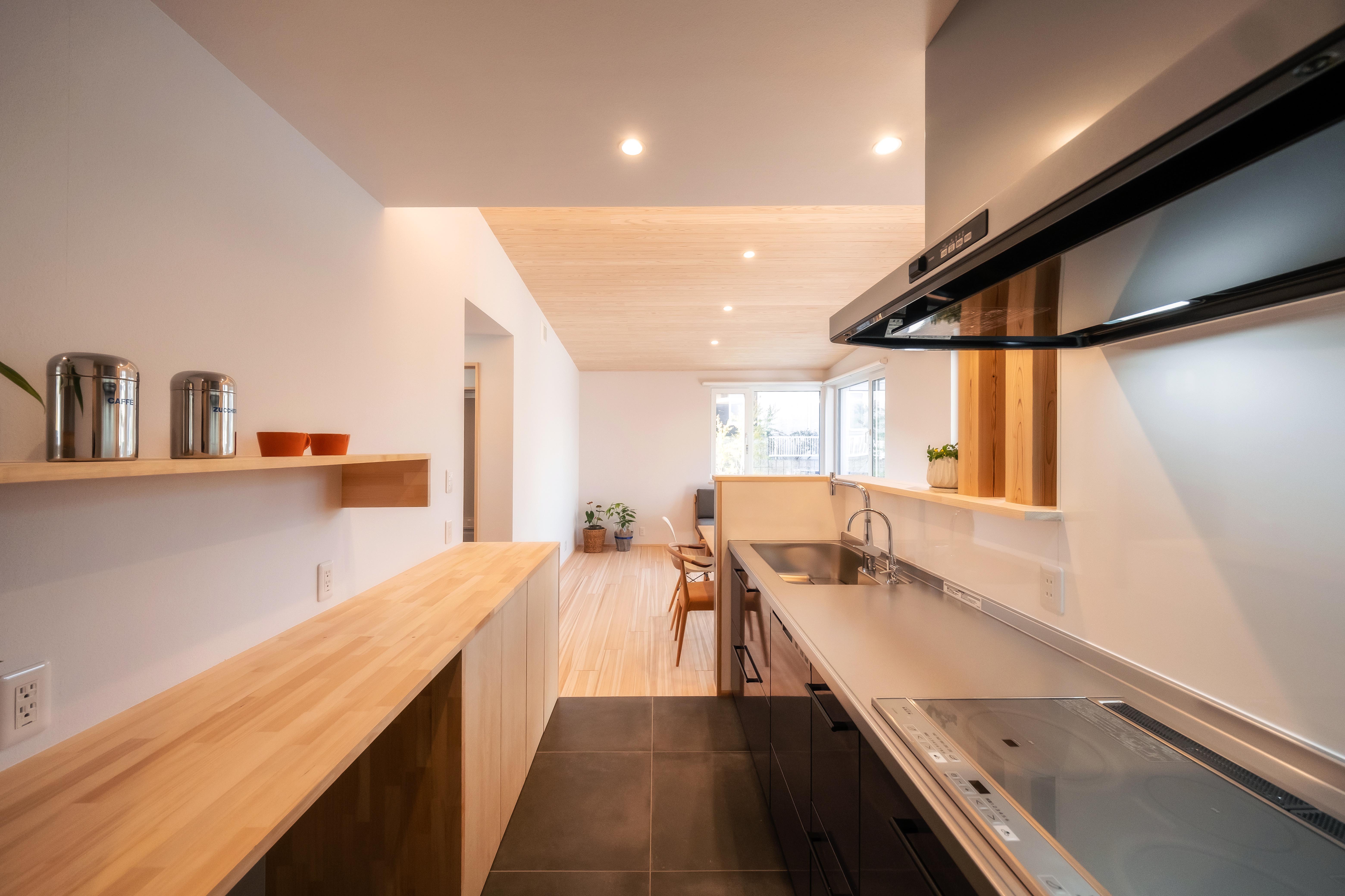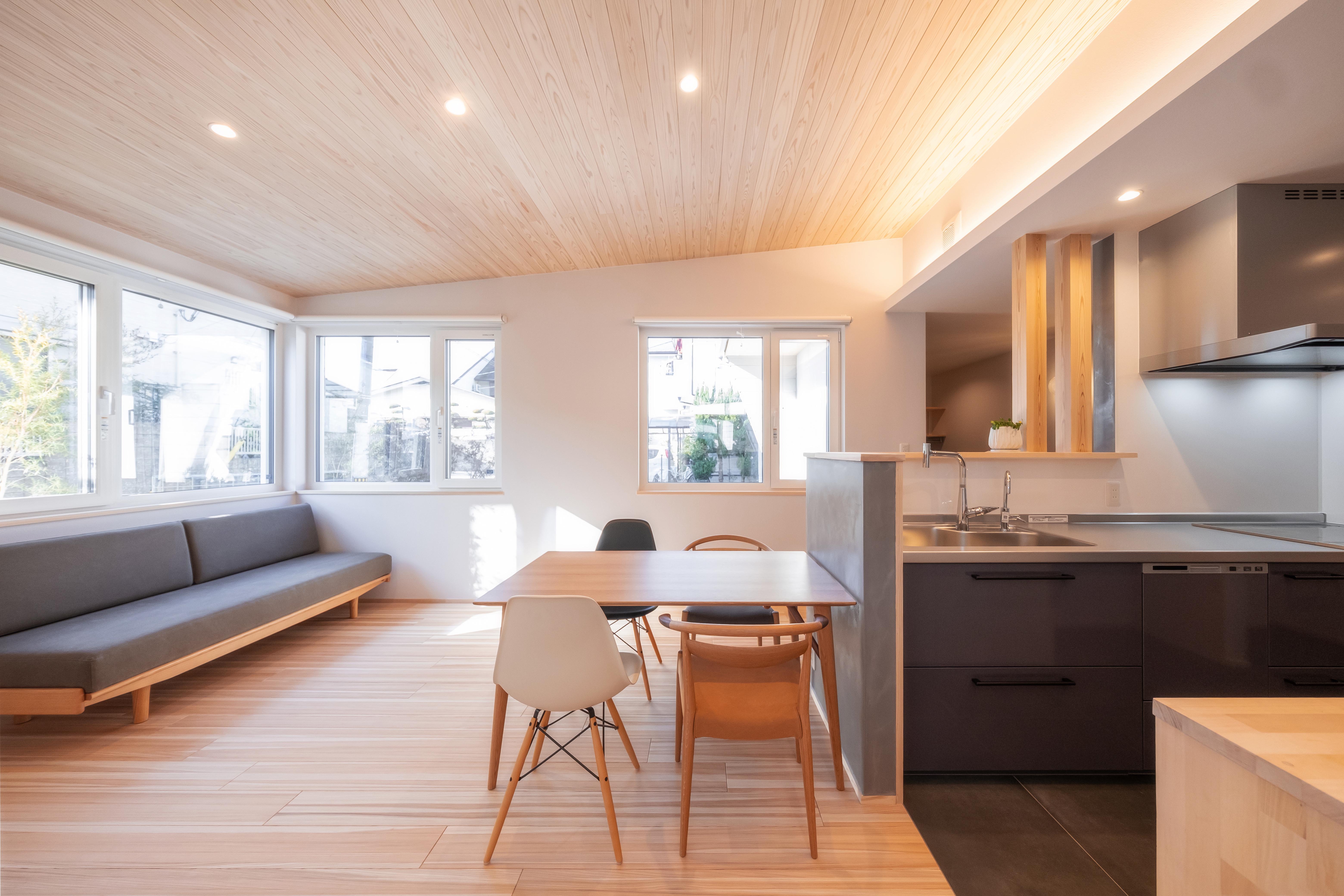 ガルバリウム鋼板とガルデ塗り壁、無塗装の杉板張りの3つのマテリアルで個性的な外観を構成している建物。無塗装の杉板はやわらかな表情を生み出し、経年美化も楽しむことができる。敷地はややコンパクトで、南側に背の高い建物があるため、1階部分は冬の日射が取り込みにくい面がある。そこで抜けのある西側に開口を設け、その対策とした。1階はLDKと主寝室、水まわりを配置し、キッチンを中心に回遊が可能。2階はキッズルームと書斎を配置しており、リモートワークにも心地よく取り組める。