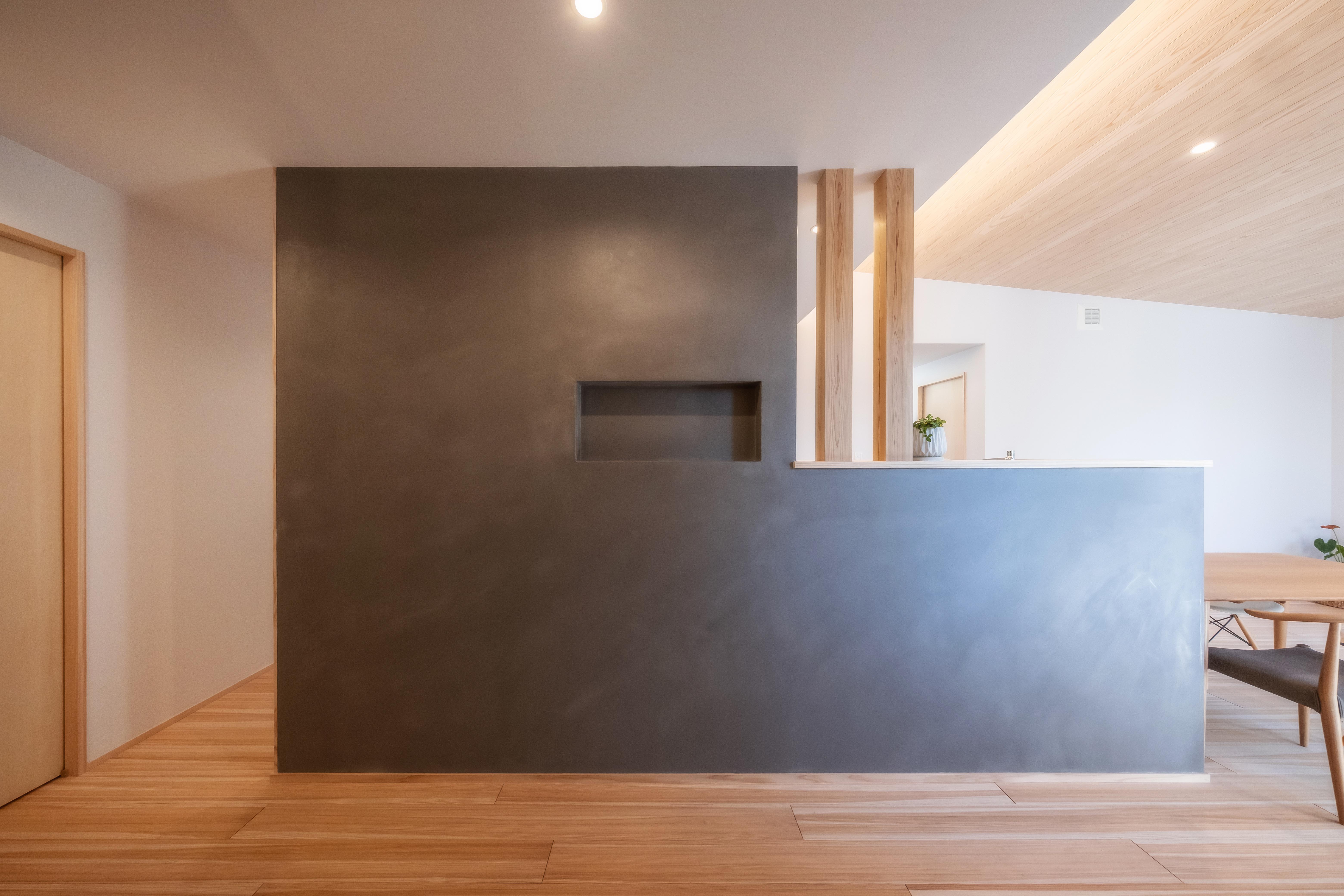 玄関から入ってまず目に入るキッチンの腰壁には、ハイブリドベトン(高耐久薄塗コンクリート調漆喰)を採用した。アクセントカラーの役目も果たす、個性的な仕掛けとなった。