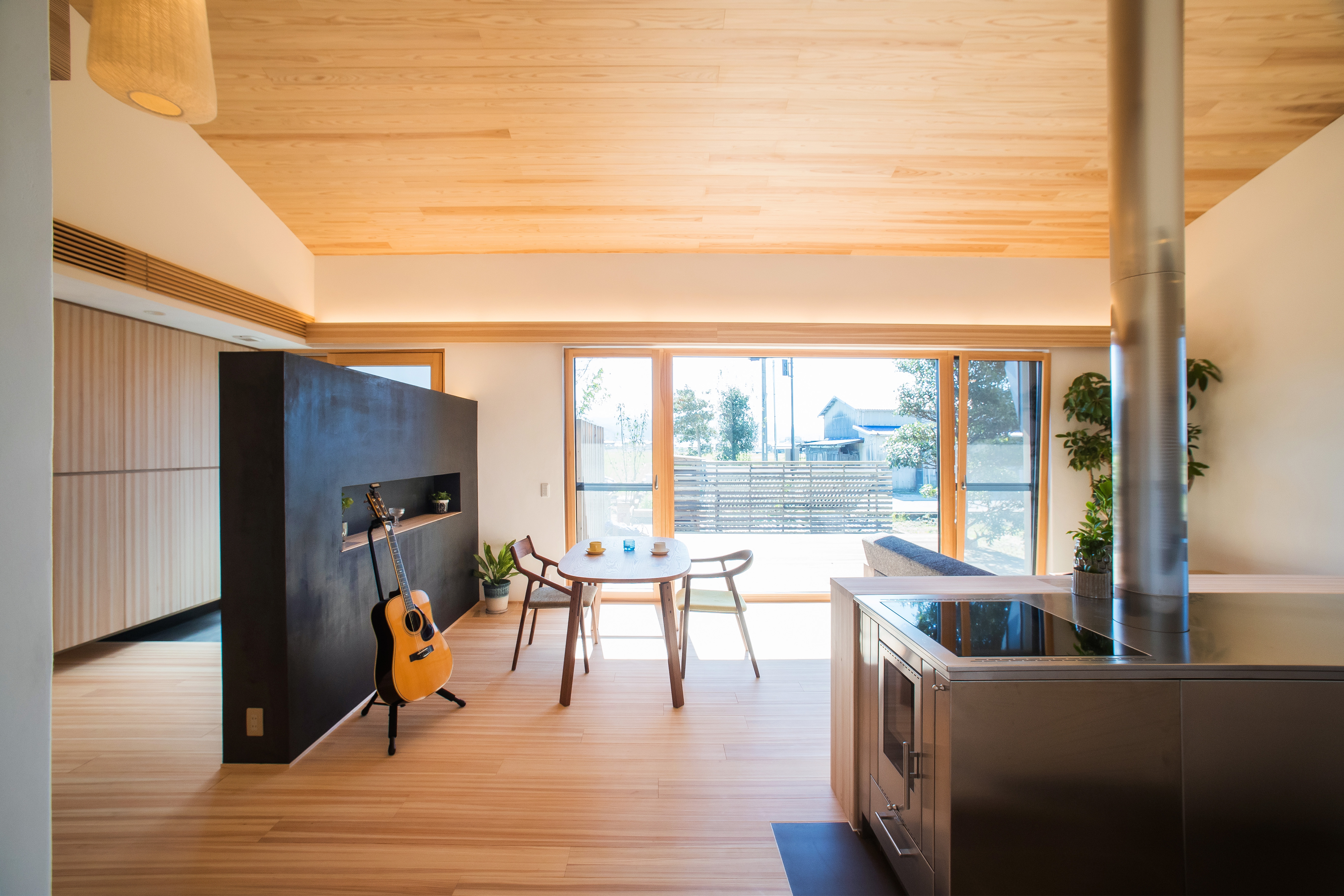 子世帯のLDKはウッドデッキを介して庭へとつながり、アウトドア好きの髙岡さんはいつでも自然の息遣いを感じてリラックス。のびやかな周辺の景色も借景として楽しんでいます。