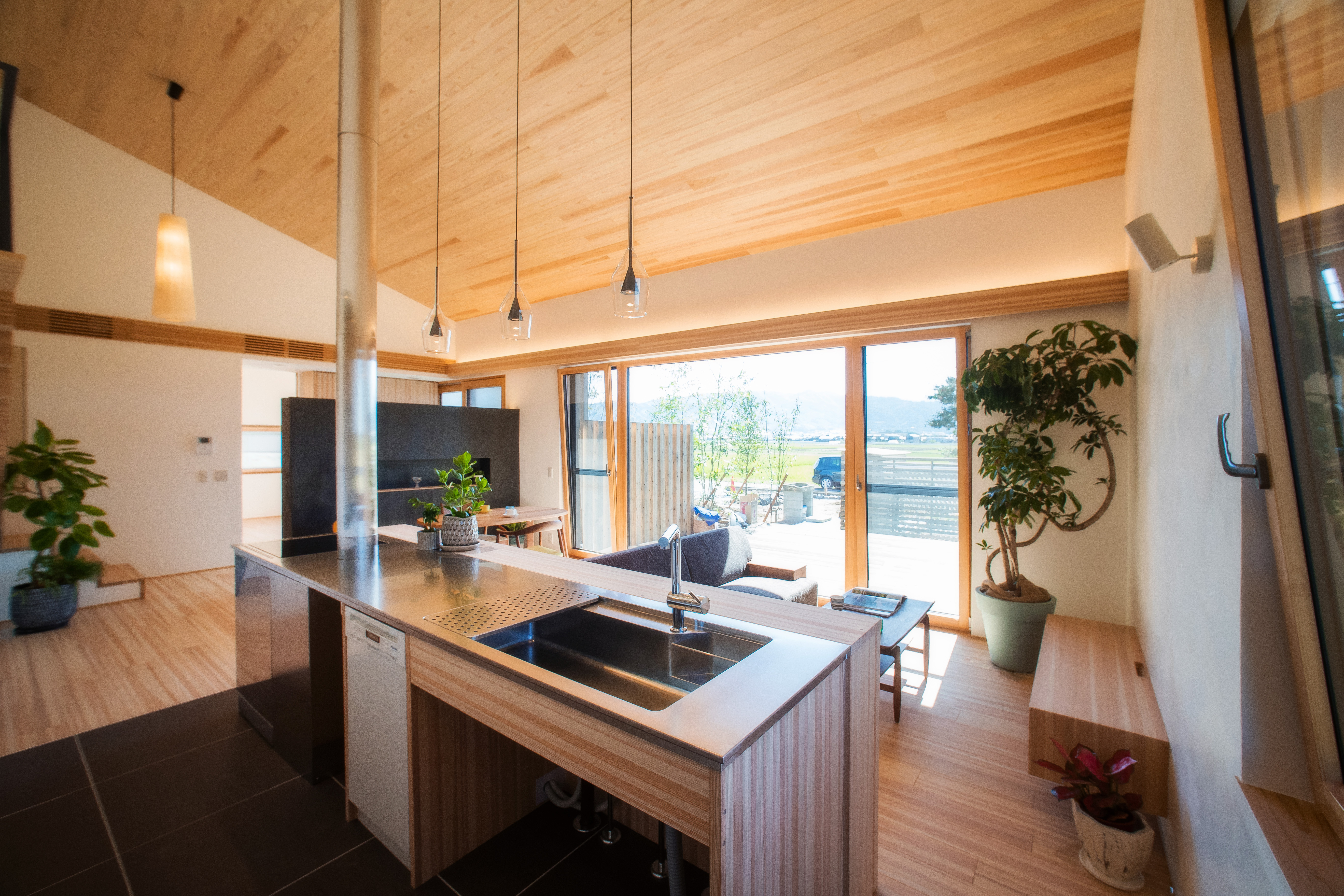 庭の景色を眺めながら作業できるように配置した、スタイリッシュな造作キッチン。キッチンに薪調理器を内蔵させることで機能面もさることながら、炎の癒しを感じることもできます。