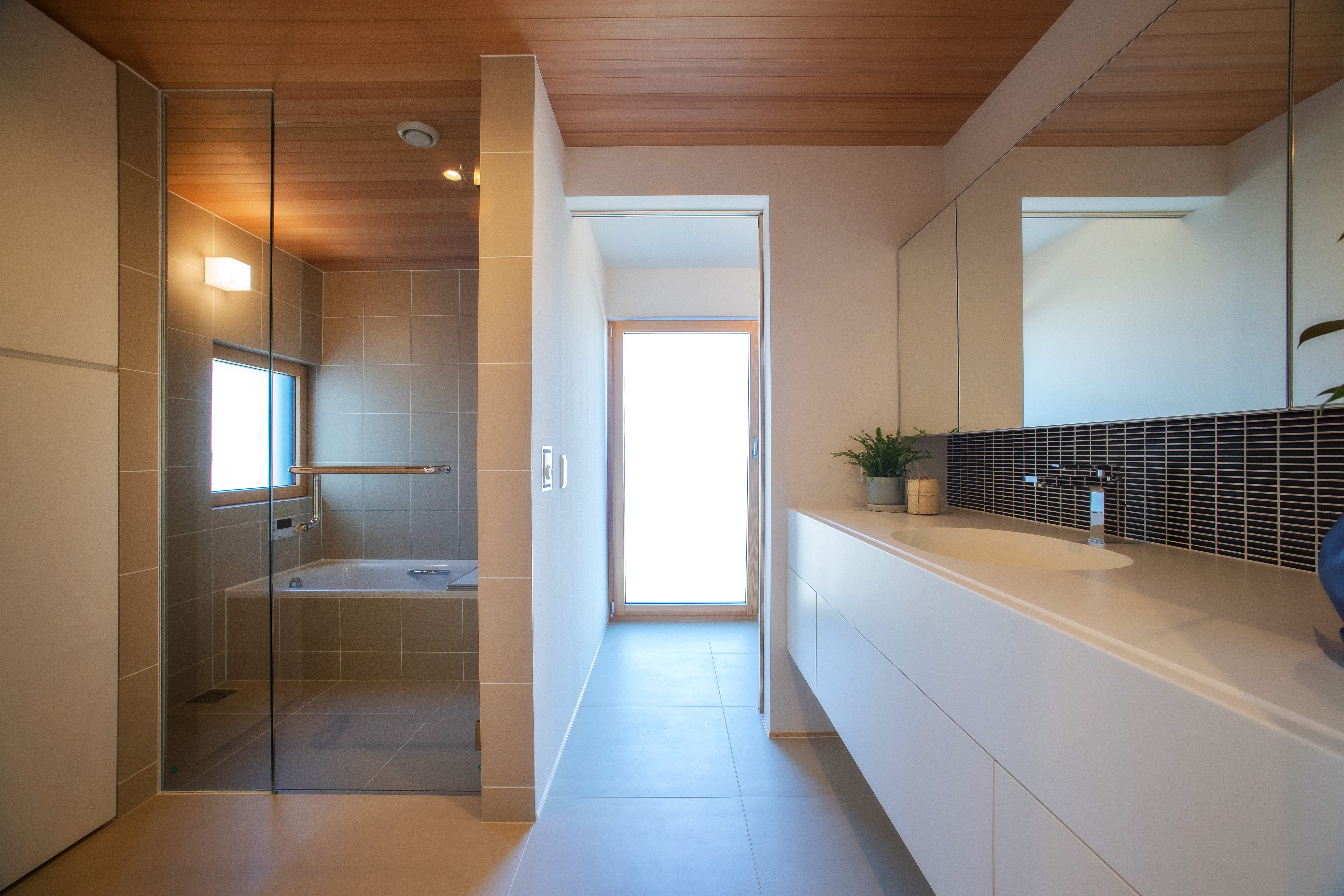 バスルームなどの水まわりは、敷地の北側に配置。脱衣所のタイル床に、薪調理器で沸かした温水を活用した床暖房が敷設。入浴時に多いとされるヒートショックを予防することができます。