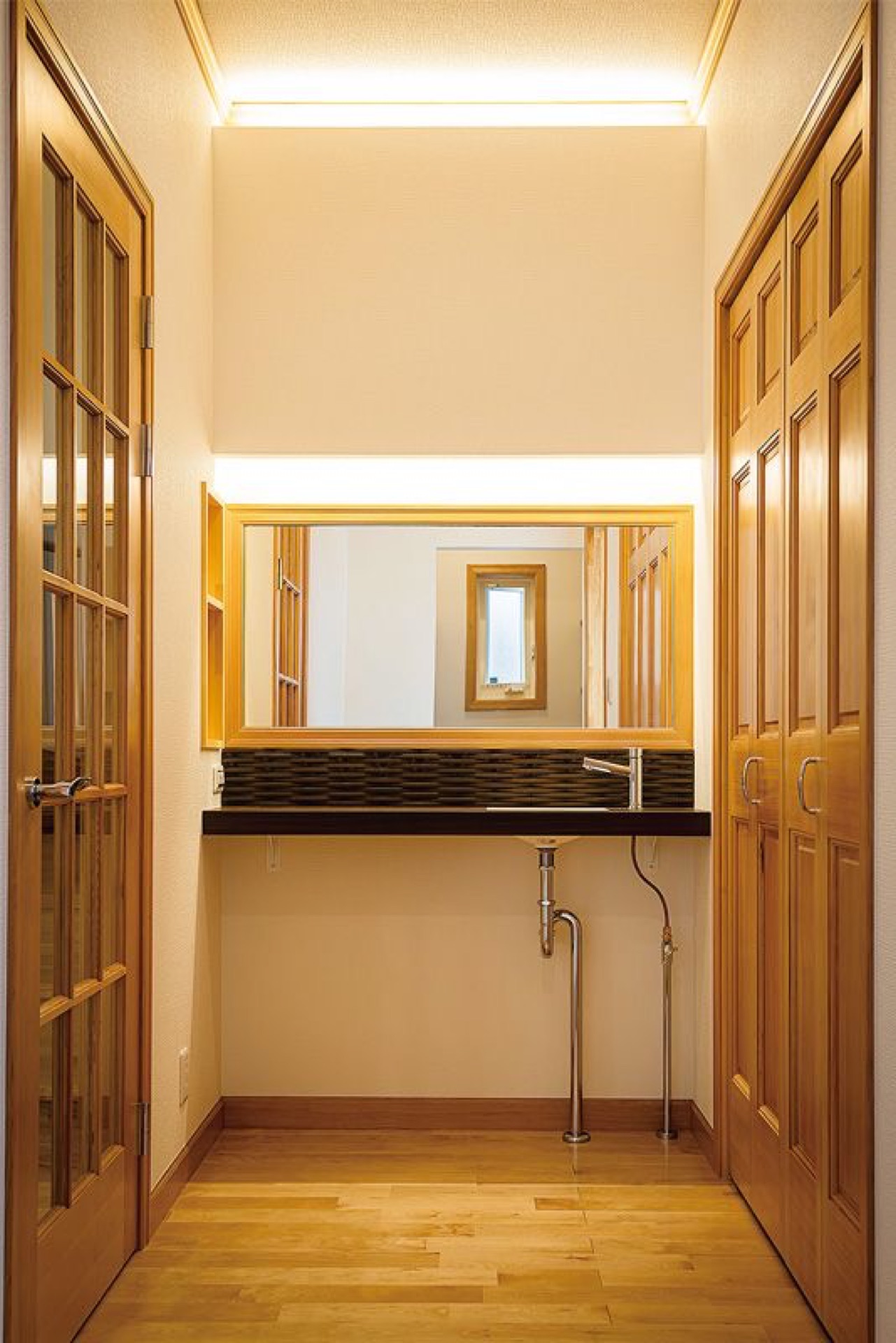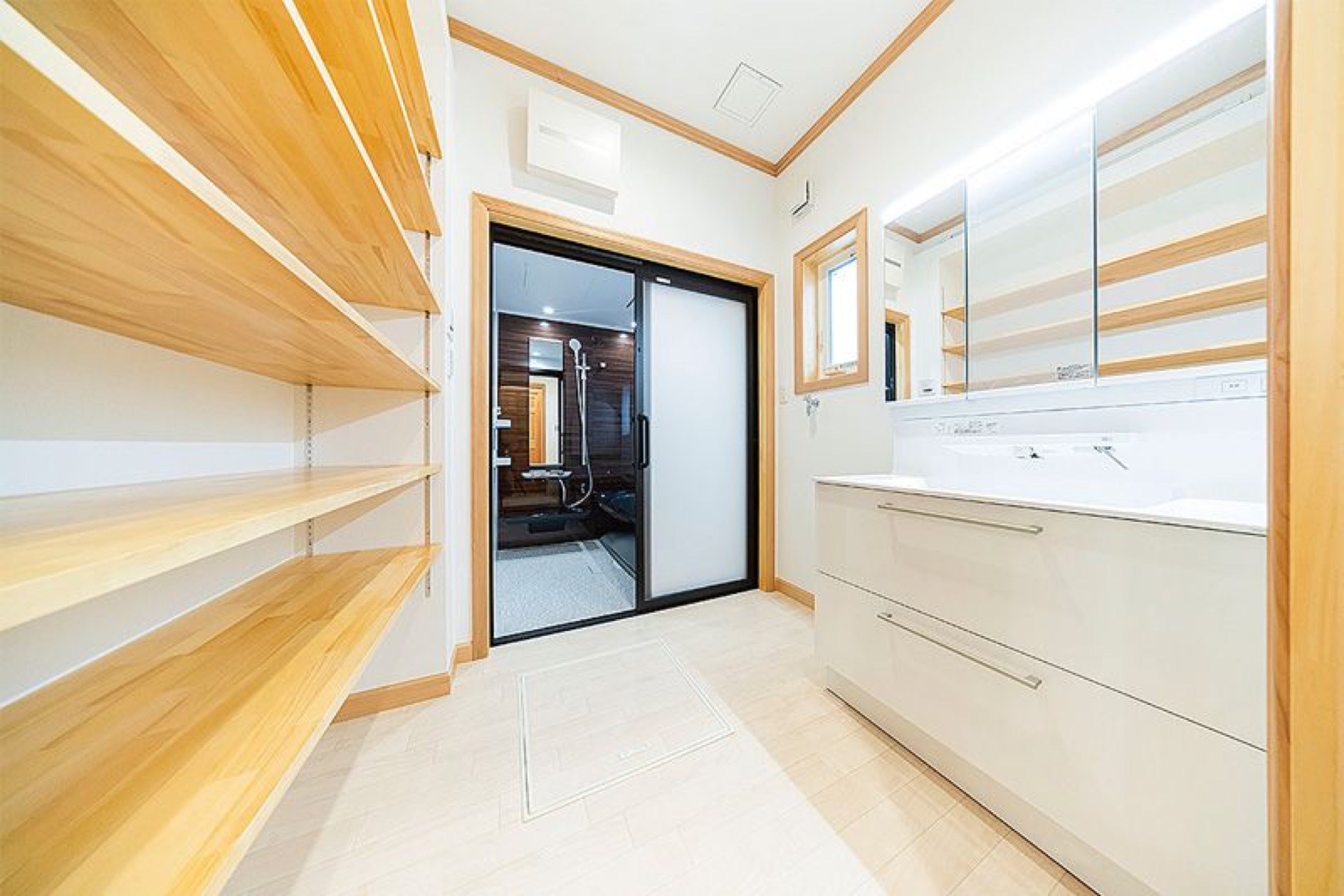 ウッド感と純白の洗練さが調和しまとまった雰囲気でありながらも丁寧に仕上げられた造作が個性を演出。建築する側の意図を反映させながら暮らしに寄り添った快適動線も叶えるアースのコーディネート力が光ります。
