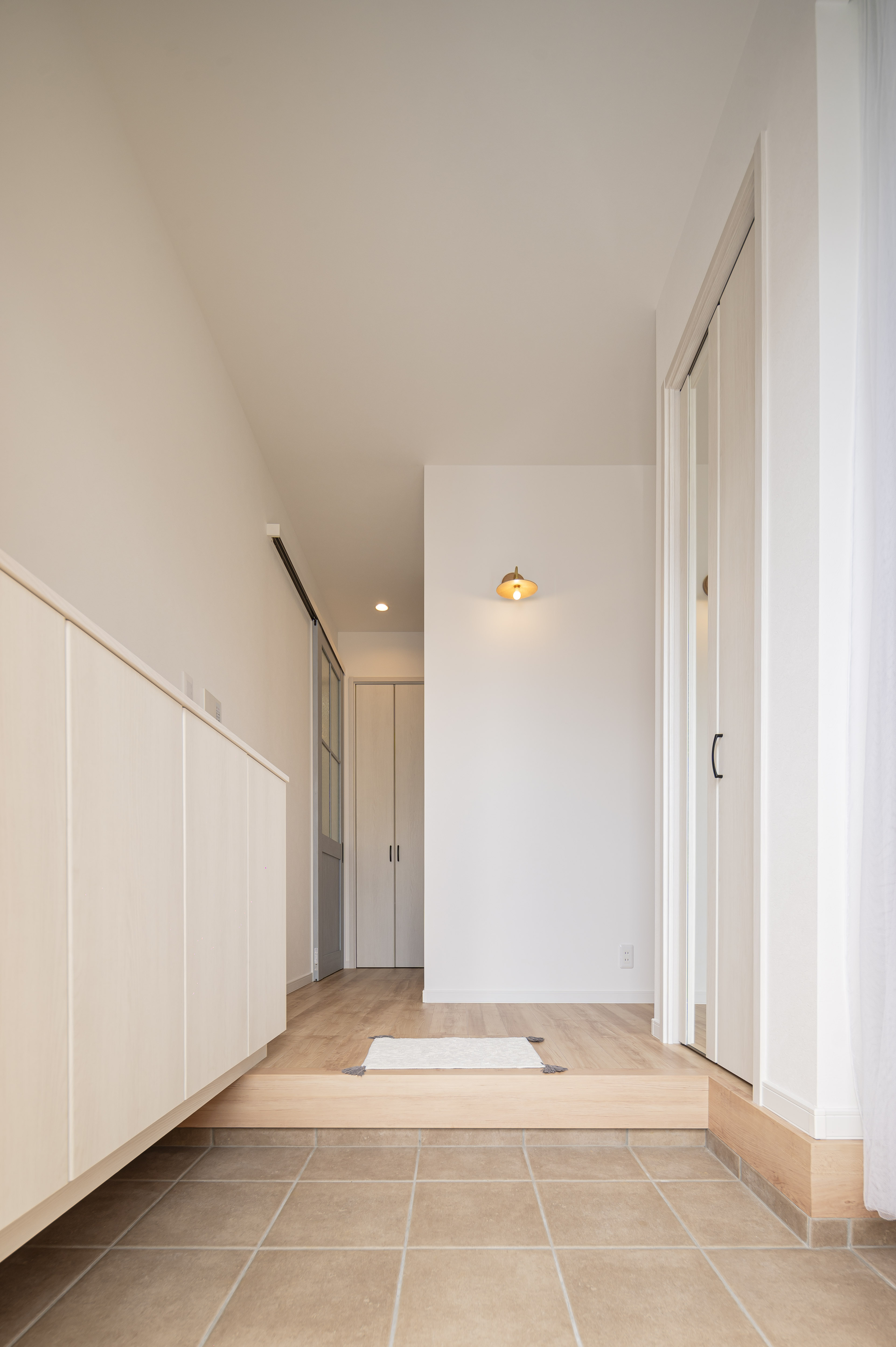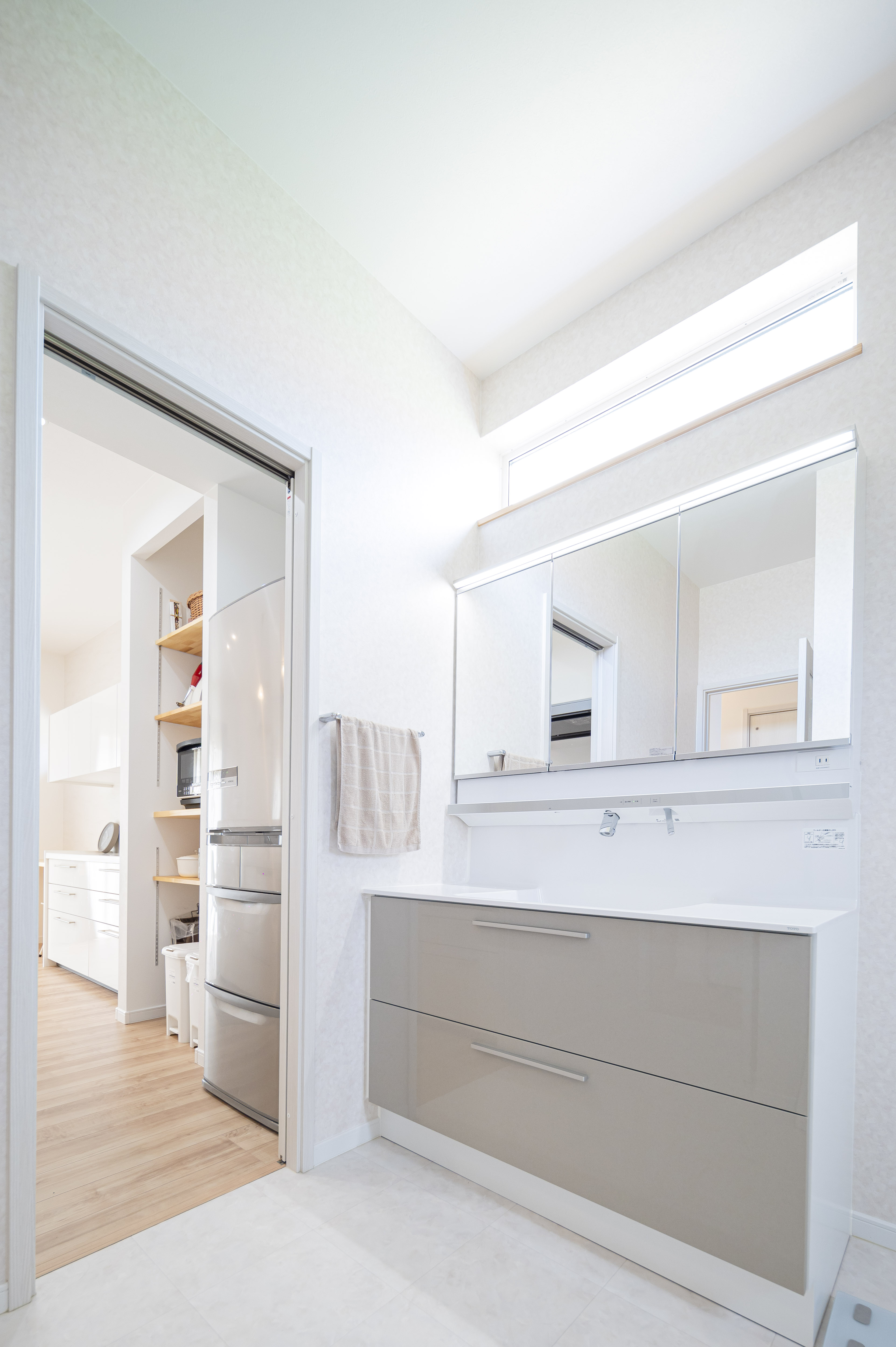 造作の質に定評のあるアーススウィートホームですが、洗面室からキッチンに直接つながる家事ラク動線、玄関正面には壁を配置するなどの生活感を感じさせない工夫など、生活に寄り添っている点も見どころです。