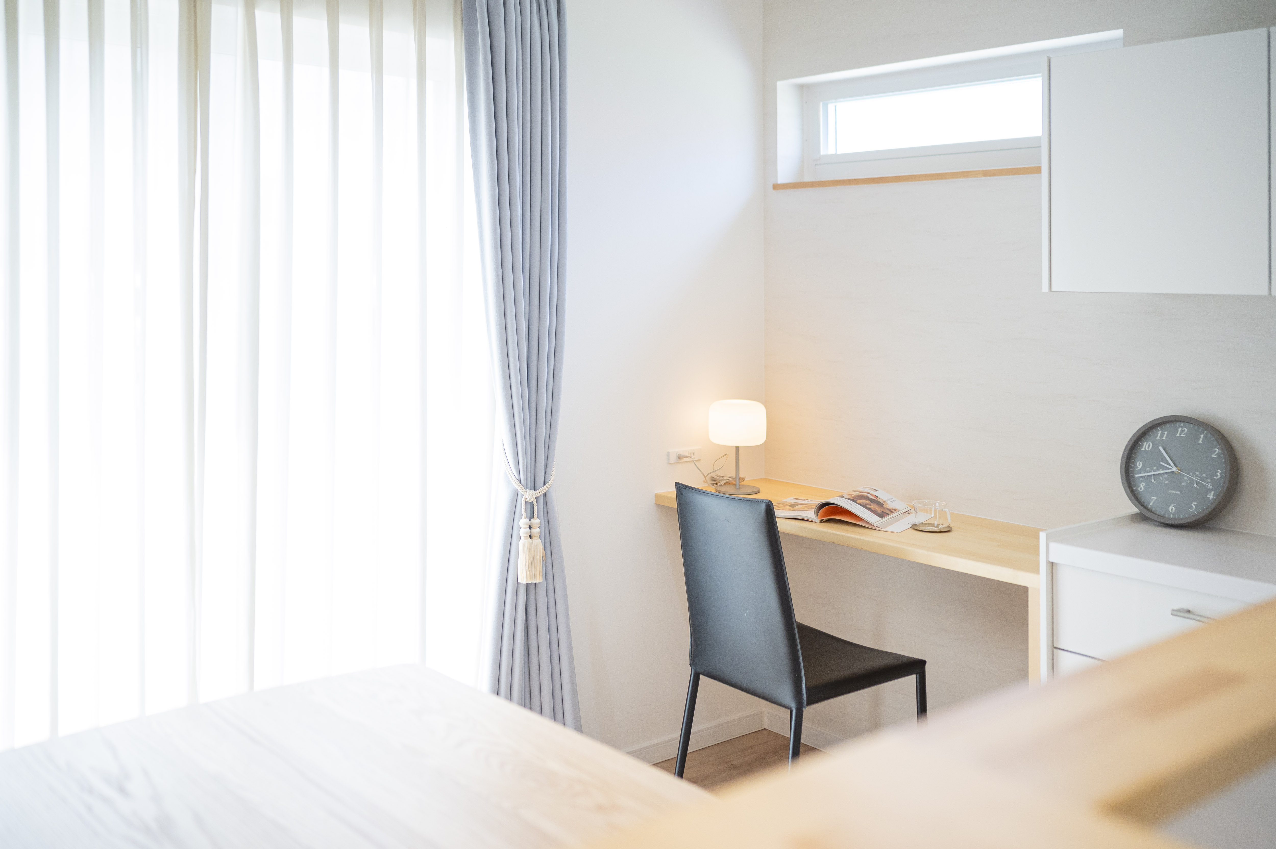 無垢材とカーテンや扉の水色の風合いが、居心地のよい空気感を演出。質感はもちろん、視覚的にもやさしさを表現しています。