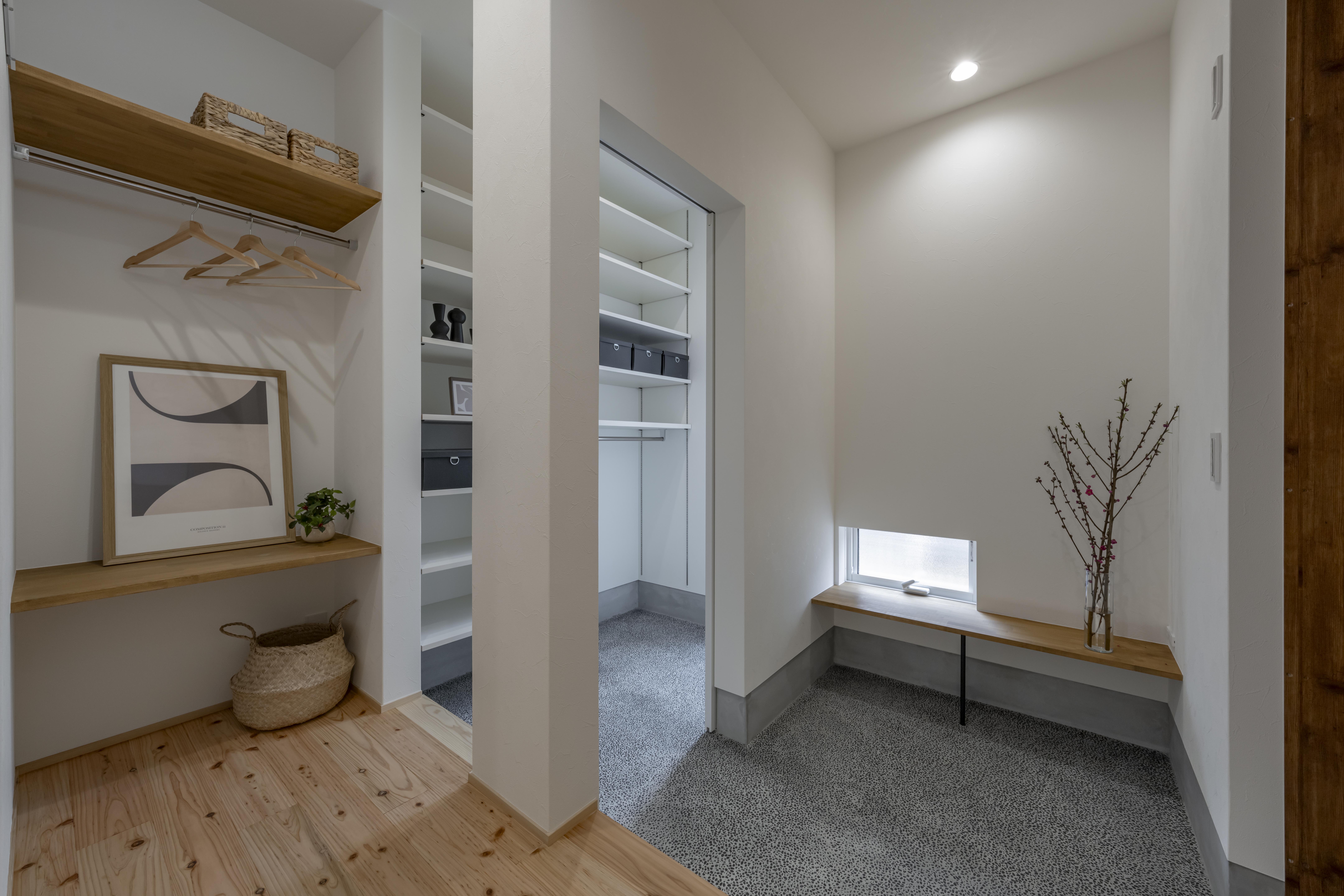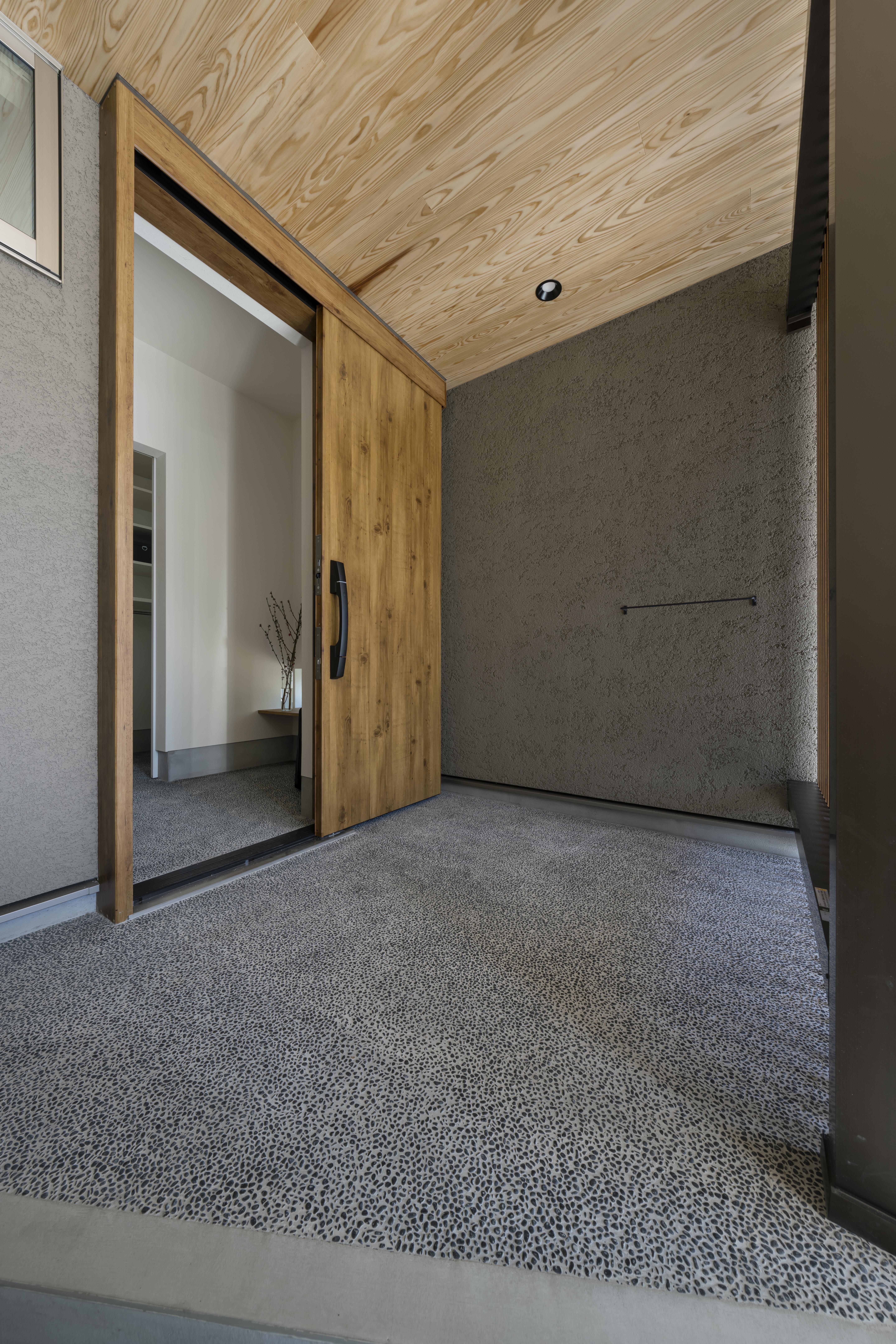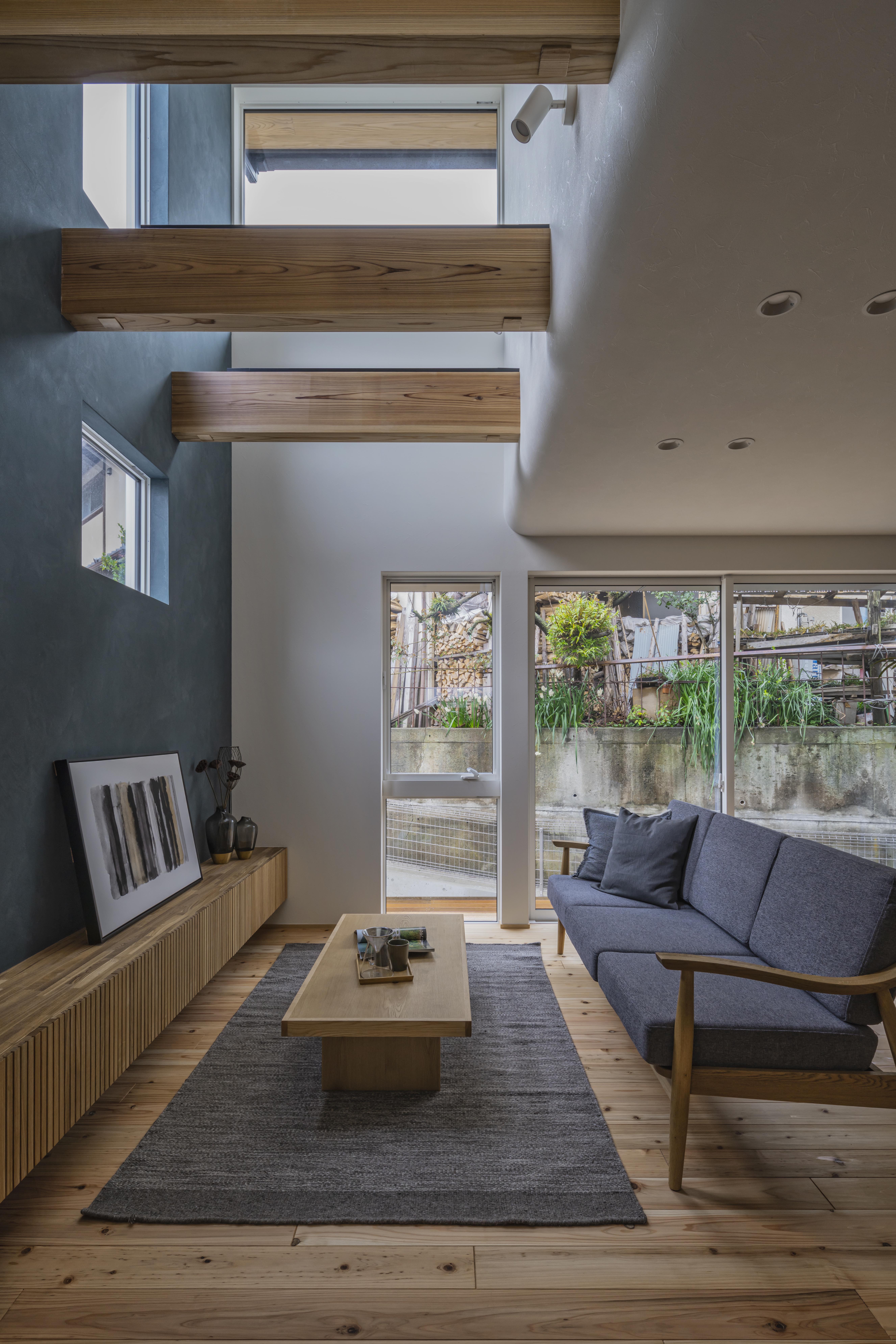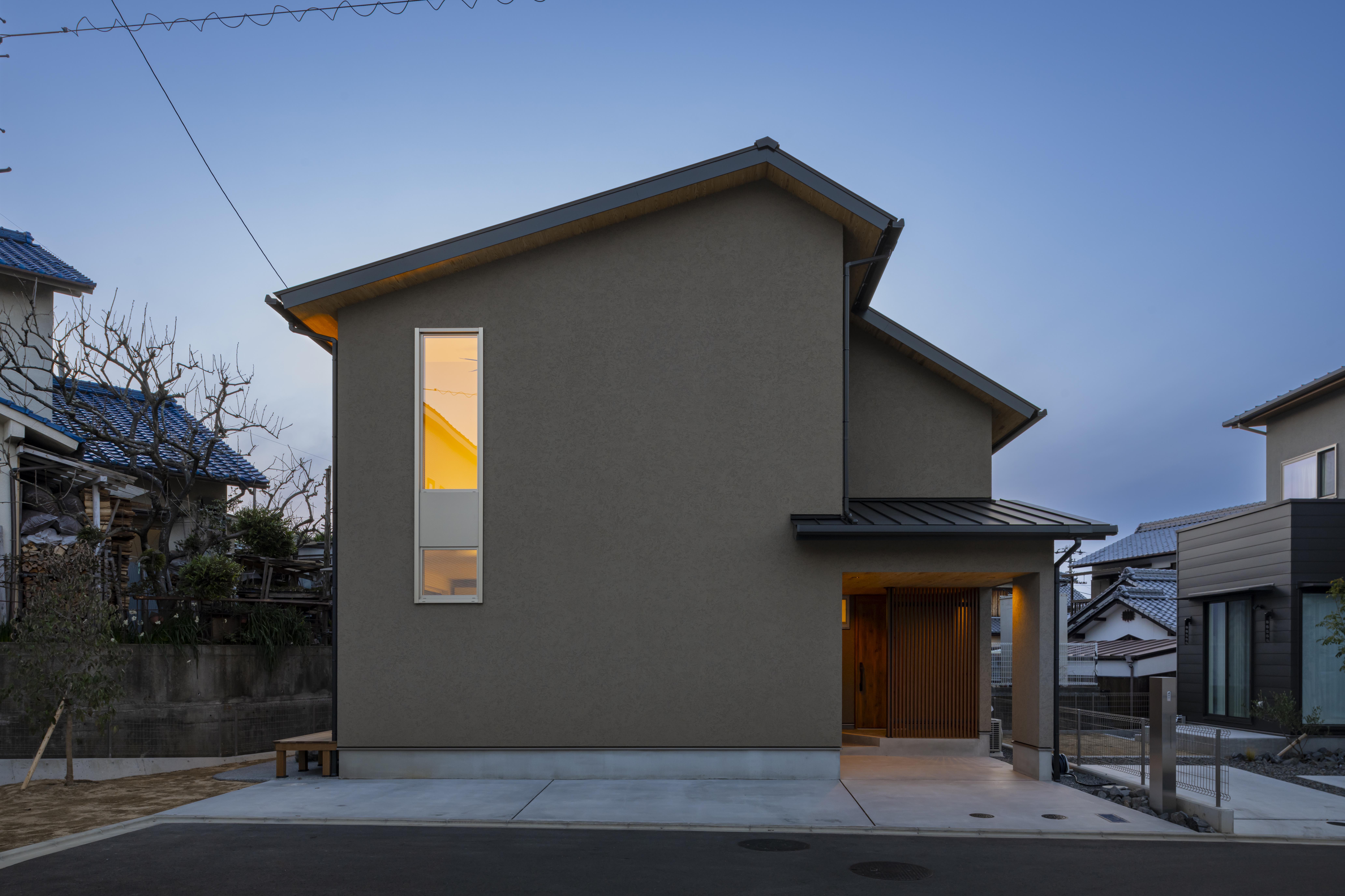 施主さまが望んだのは、「和を感じる落ち着く空間」。ようやく歩き始めたお子さんの健やかな成長を願って、自然素材をふんだんに使った建物を計画した。18畳の吹き抜けLDKは、深緑の塗り壁が圧巻。3本の化粧梁が心地よいリズムを刻み、高窓から差し込む自然光が塗り壁に映り、美しい陰影を生み出している。壁面の造作収納は、十分な容量をもちつつ、繊細なデザインが上質感を醸し出している。LDKに隣接させたのは“小下がり”の和室。床のレベルを下げることで程よいおこもり感を生み出した。洗い出しにした玄関土間、アイアンを施して造作したベンチなど、和を感じさせる工夫は随所に。土間収納から直接入ることもできる2way動線、洗面・脱衣・ランドリー・ファミリクローゼットを集約した時短家事動線により、日々の暮らしの利便性も追求している。