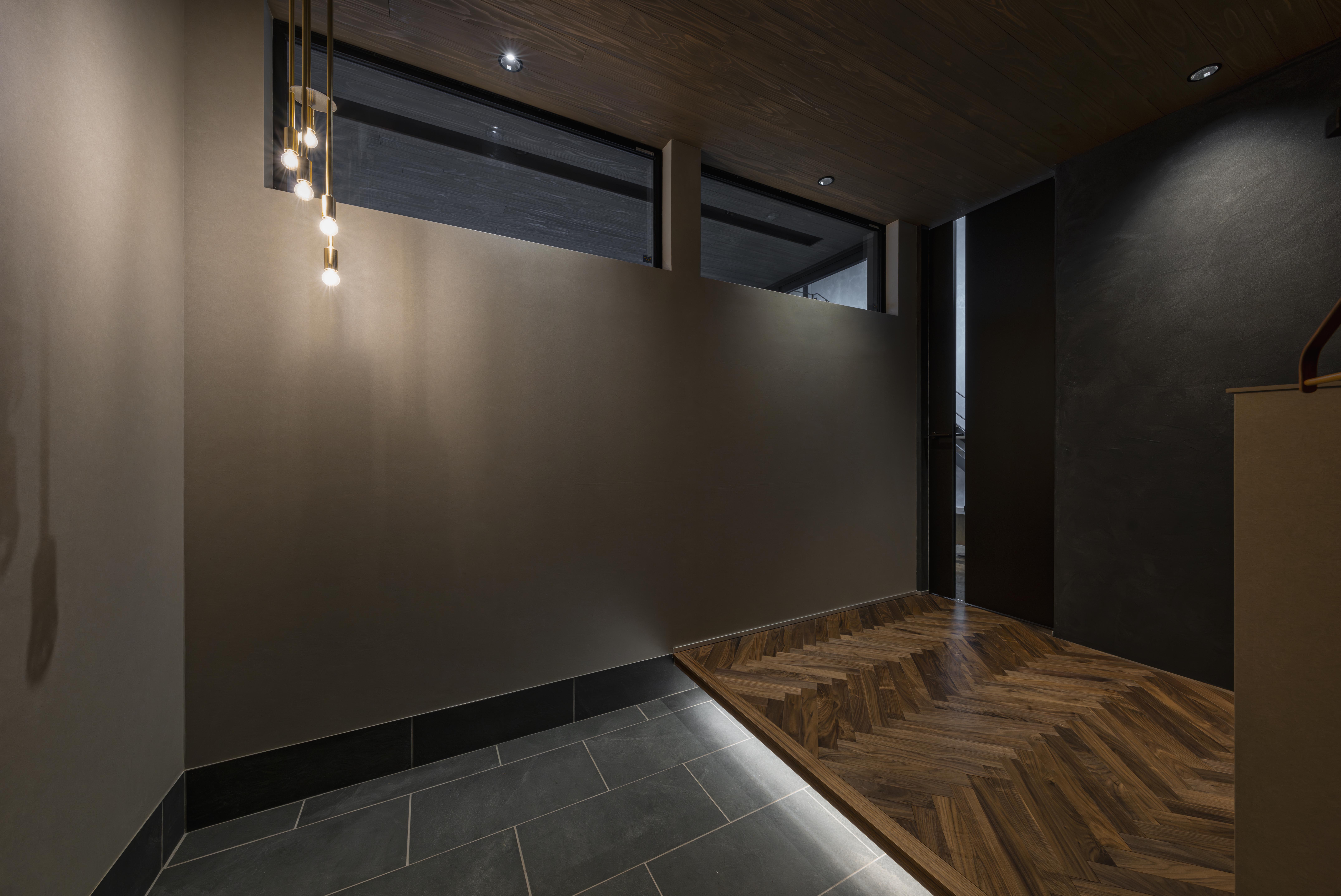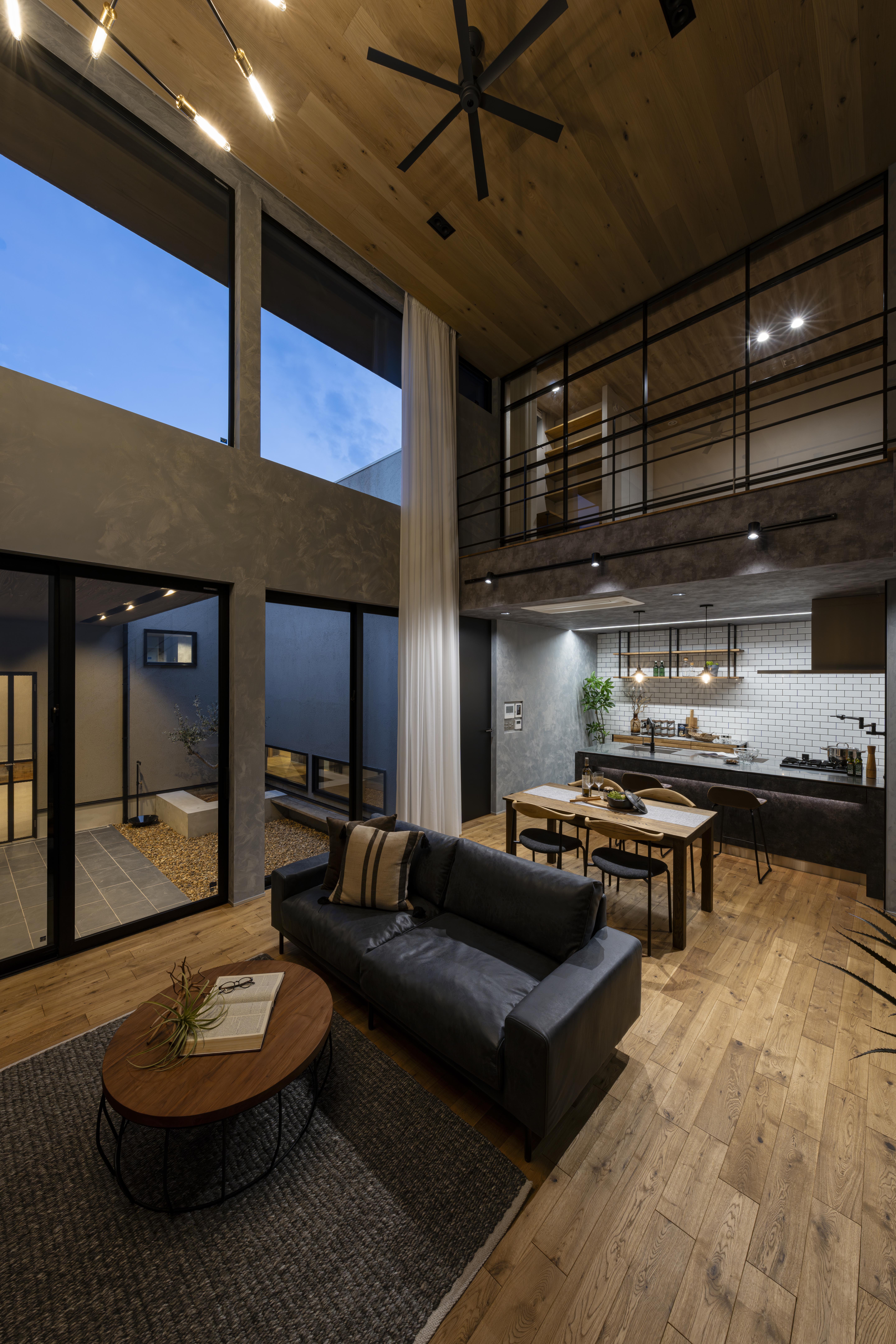 外に向けては閉じた建物だが、邸内ではそれが一変。高い塀に囲われたインナーコートに向け、全面開口の大窓があり、空に向けての眺望、差し込む光が各空間に拡散される。見せ場ともいえるリビングは、一面に塗りムラが味わいとなっている左官仕上げの壁、さらにテレビ裏には古木タイルによる立ち上がりの壁を。適所に採用した杉材などの自然素材、視線の抜けを意識した開口、計算された動線など、クライアントの要望を最大限に満たした建物となった。