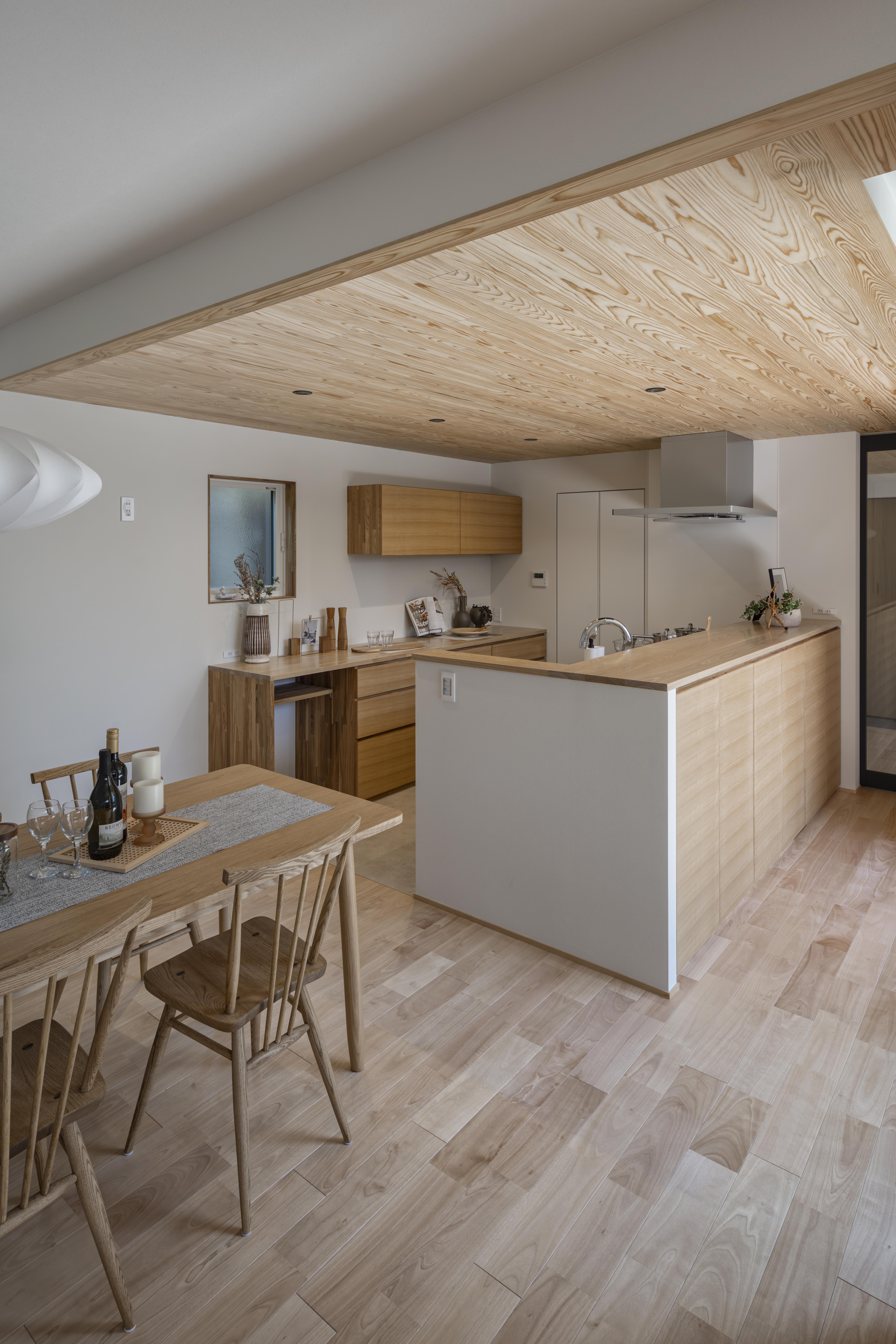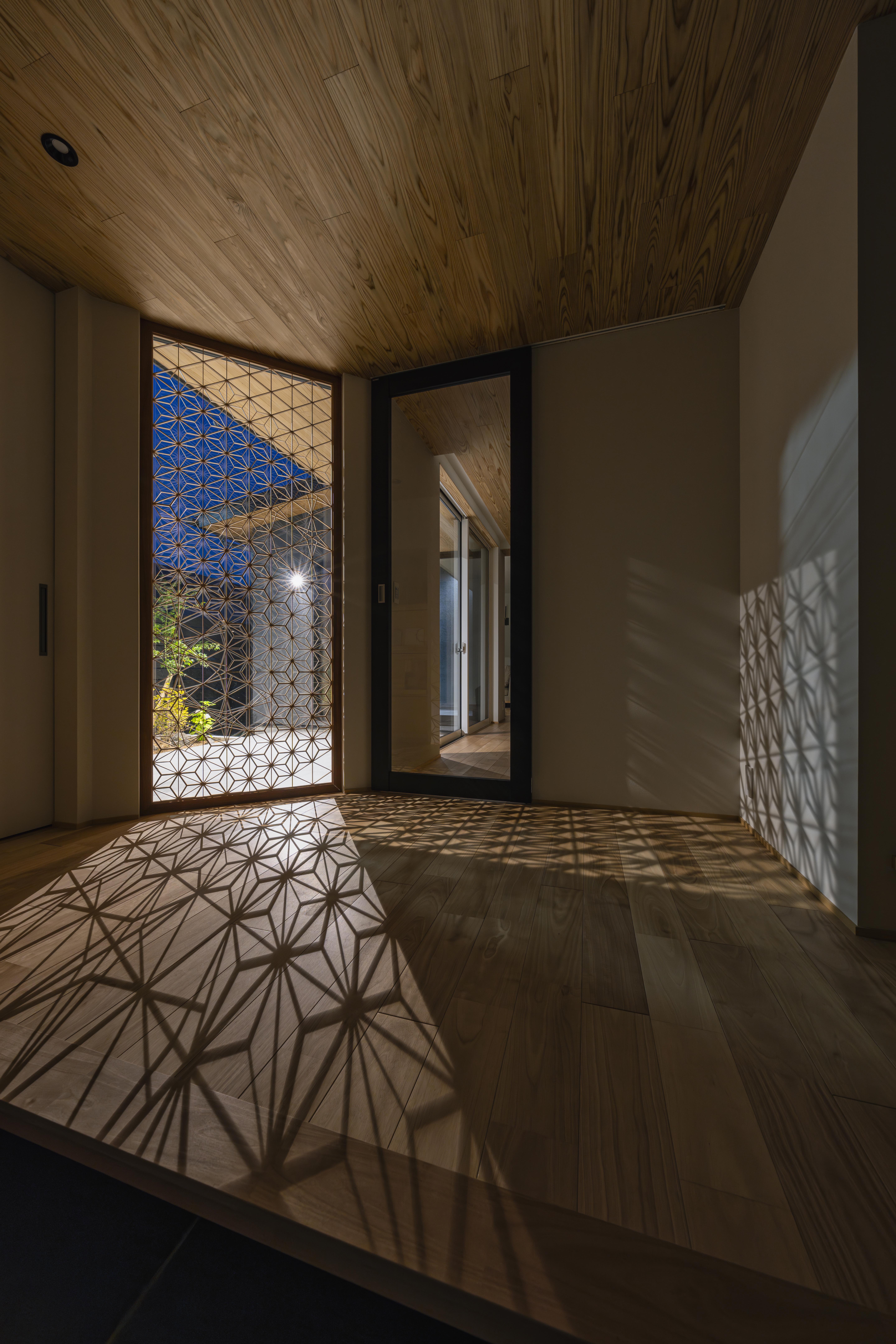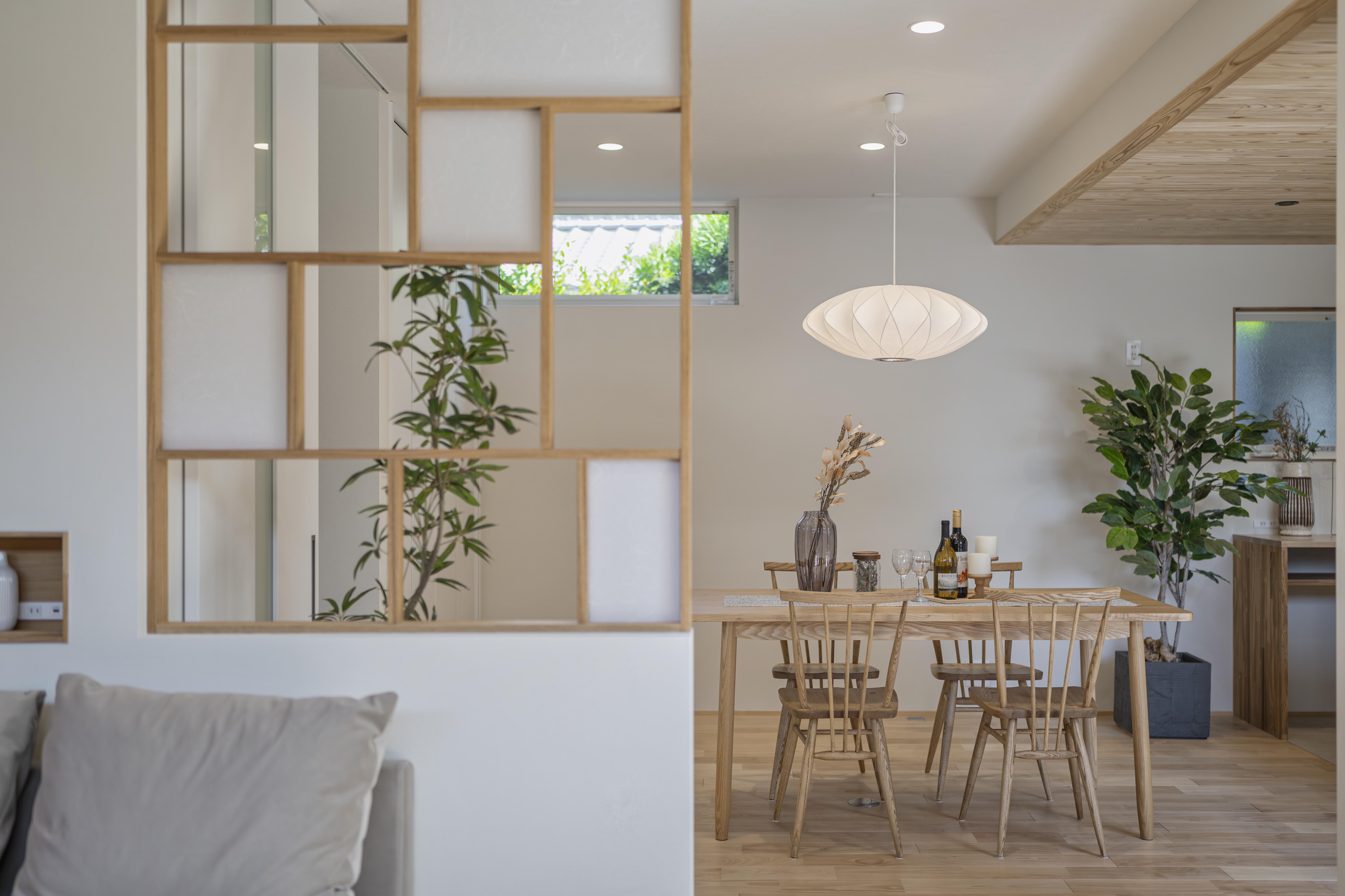 日本の伝統建築が持つ穏やかさや凜とした美しさ。Mさま邸はそんな和の繊細さに、現代的な解釈を加えてデザインされた和モダンの家だ。中庭を中心に配置された居室は、各空間がつながりながらも天井の高さの違いなどでゆるやかにゾーニングされている。玄関から続くキッチンは落ち着いて作業できる段下がり天井にし、ダイニングは壁も天井も白で統一。ハイサイドから臨む借景のグリーンをアクセントとした。リビングはさらに高い勾配天井で、無垢材を多用することにより落ち着きを生み出している。玄関には組子のデザイン、ダイニングとリビングの間の腰壁にはアクリル装飾板を使った障子風の建具を施している。