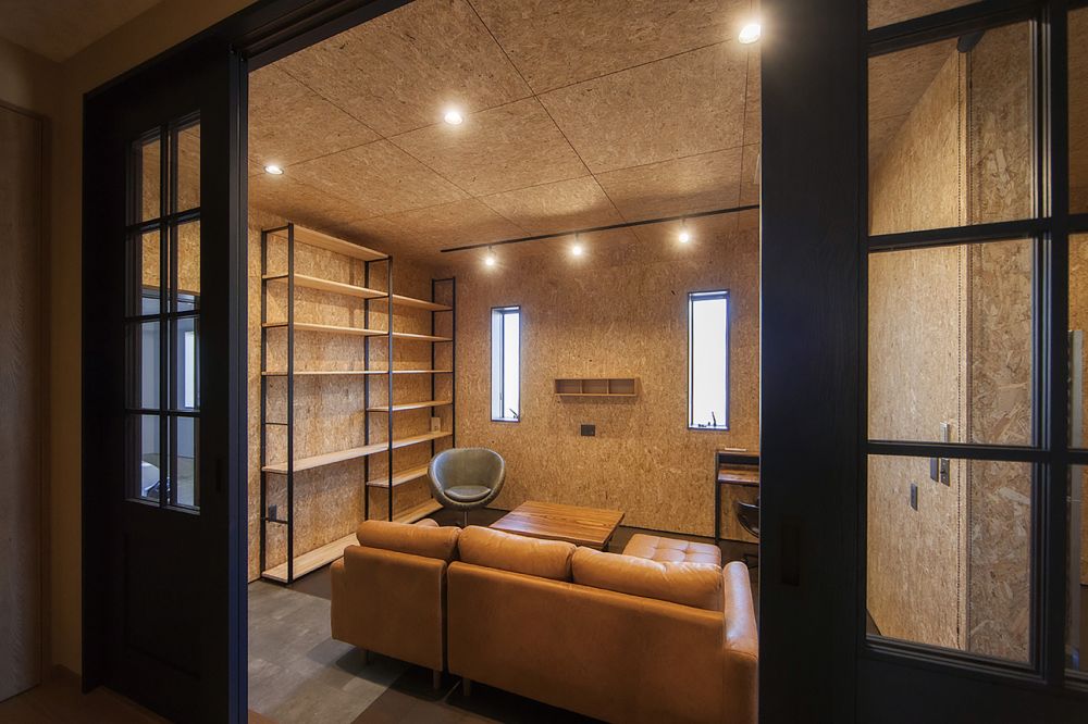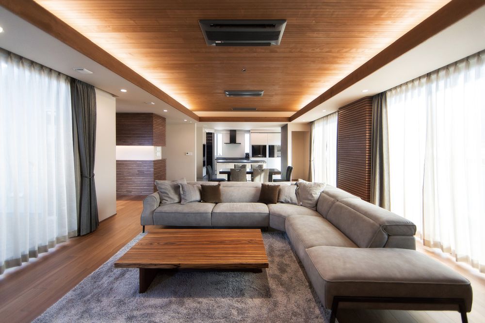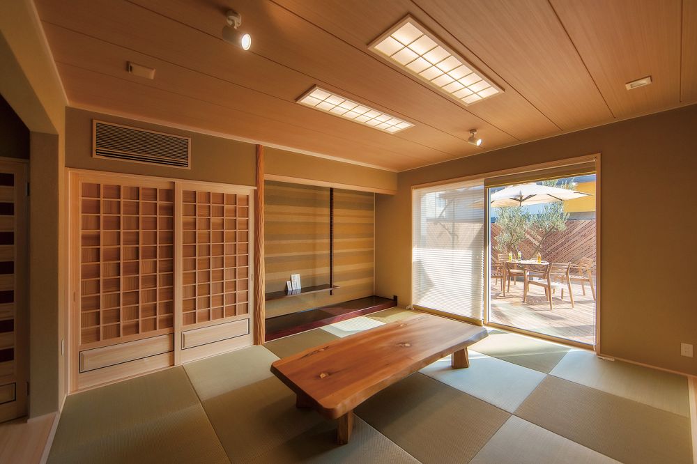 日常的にゲストを家に招くことが多いという施主さまが、新しい家に求めたのは、おおらかで開放的なもてなしの空間。そこで久門さんと担当設計士は、1階をパブリックスペース、2階を家族のプライベートな居住空間にするというゾーニングを提案した。通りに面したファサードはプライバシー保護のため開口を控えているが、内に入るとその印象は一転する。門扉を開いた瞬間、目の前には青空広がるガーデンテラス。家にいながらにして、自然の心地よさを体感できる。美しいカーブを描いたウッドデッキからフラットにゲストルームの和室に入れるという動線も秀逸。和室は格子や床の間の塗り壁などの意匠に、職人の心意気を感じる。また愛車を収めたビルトインガレージの奥には、土間のプライベートルームを設えた。大人の秘密基地のようなこの場所で、ご主人は愛車を眺めながら趣味の時間を過ごしている。家族のプライベート空間と位置付けた2階は、インナーバルコニーの周囲にLDKや和室、主寝室、子ども部屋をレイアウト。リビング、ダイニング、キッチンをストレートにつなげた大空間は、インナーバルコニーと外のバルコニーに面した開口から採光を得て明るく開放的に。これだけの広さがありながら間延びしないのは、木目を生かしたオーダーメイドの設えを取り入れてアクセントとしているから。無垢材の天井や床の落ち着いた色味もあいまって、洗練された上質な空気を醸し出している。リビングでゆったりとくつろいだり、バルコニーへ出て日光浴をしたり、子どもと遊んだり…。家での楽しみ方ををもっと自由に、そんな家族のライフスタイルが垣間見える住まいだ。
