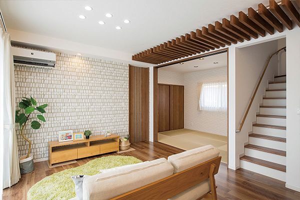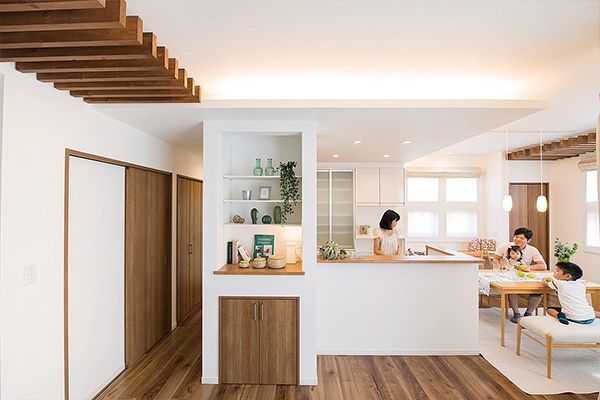 「食事中は家族の会話を楽しみたい」というご夫妻の願いから、ダイニングとリビングを緩やかに隔てる間取りを実現。食事場所とくつろぐ場所を明確に分けることで、お子さんの生活にもメリハリが生まれる住まいになりました。