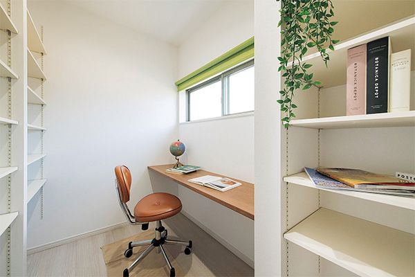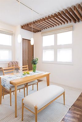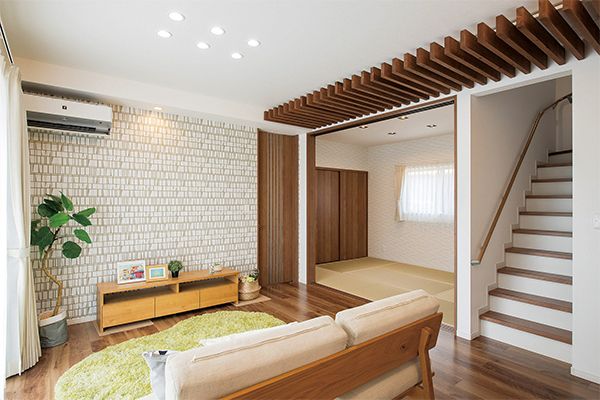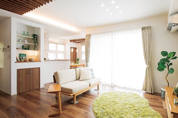 新居浜市内でマイホームを検討されていたMさま。おうちTOWNの扱う分譲地が理想の立地だったことに加え、「多彩なスタイルの注文住宅を手掛けてらっしゃることも魅力に感じました」と振り返ります。ご夫妻が希望したのは、家族の時間を持てるLDK。「食事中は家族の会話を楽しみたい」という想いを受け、横並びのキッチン&ダイニングとリビングを斜めに配置することで、空間を緩やかに隔てる間取りを計画しました。「ご飯を食べる場所」と「くつろぐ&遊ぶ場所」を明確に分けることで、お子さんの生活スタイルにもメリハリが生まれたそう。また、インテリアコーディネーターとともに、クロスやカーテンなどのファブリックをトータルコーディネート。収納も見せるところと隠すところを意識し、すっきりモダンな住まいが完成しました。