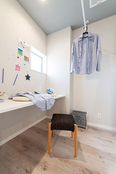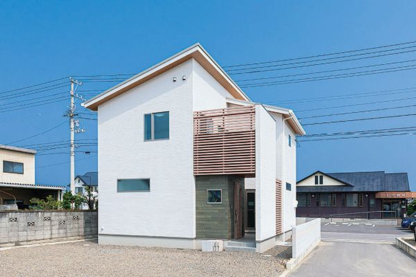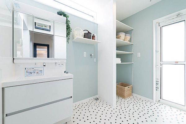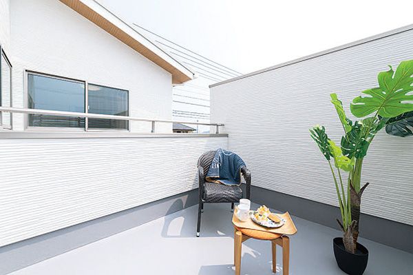 見せ梁やキッチンの天井などに木の温もりをプラスしたナチュラルな邸内。ヘリンボーンやタイルのデザインをあしらったセンスの良いキッチンに奥様のテンションも上がります。家事室や水まわりは淡いブルーを用いて爽やかに。またルーバーで目隠しをしたバルコニーは広々。プライバシーを守りつつ、のびやかに家族の時間を満喫できます。