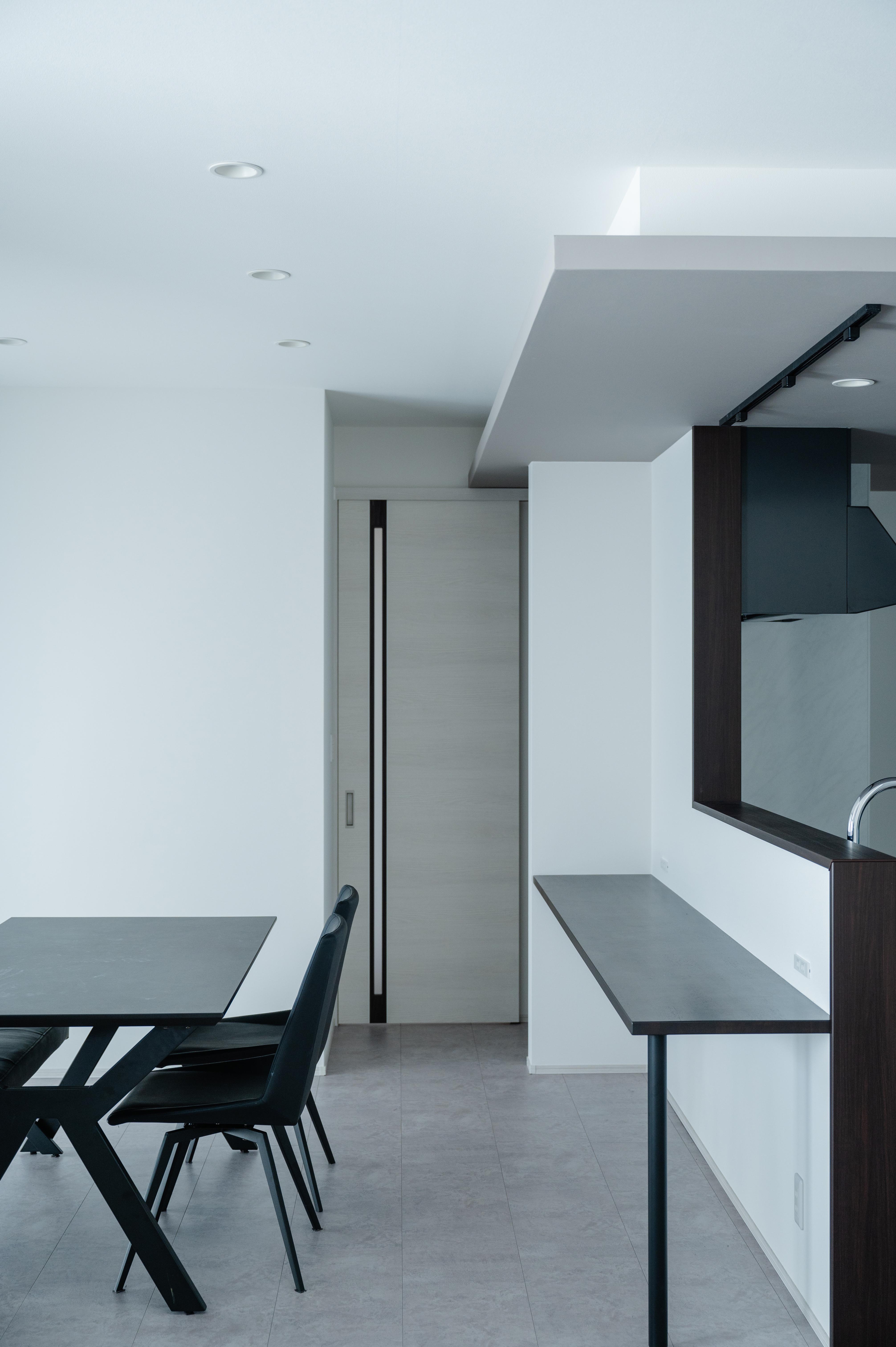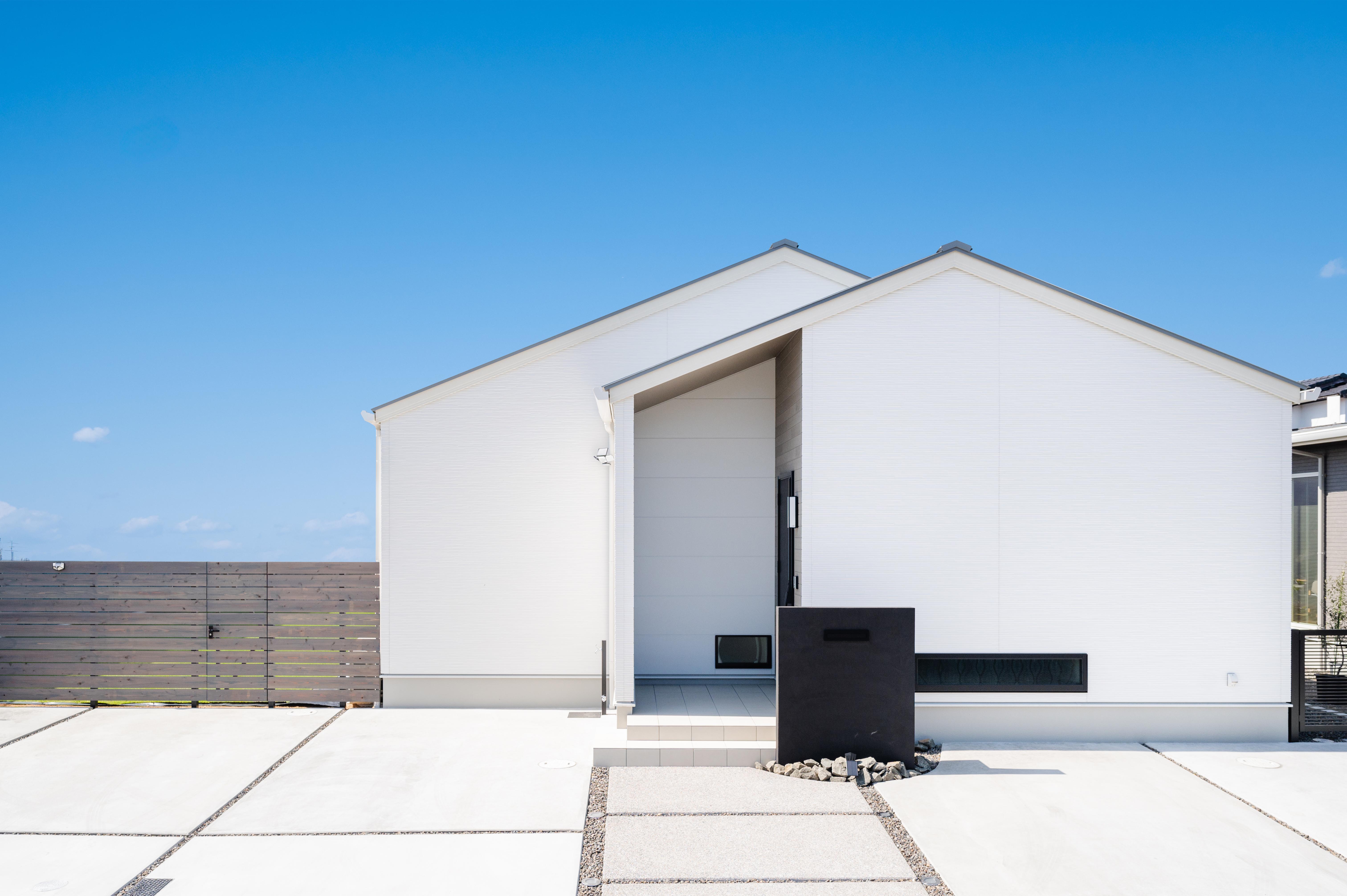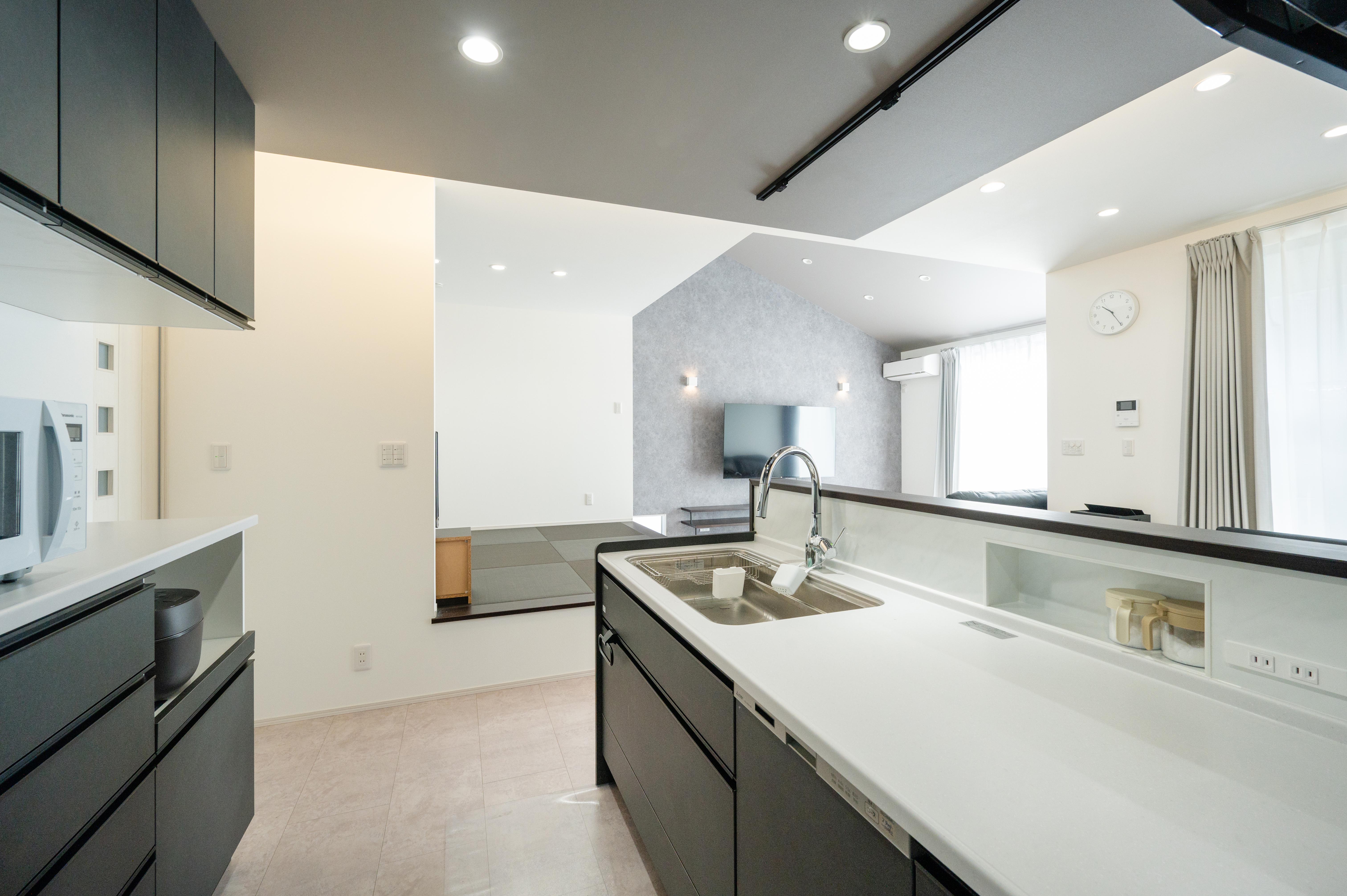 不動産部門と連携したおうちTOWNの対応力に安心感を抱き、家づくりのパートナーに選んだという施主さま。同社が展開する今治市の分譲地を気に入り、将来的に事務所を建設することも視野に入れて2区画を購入。十分な敷地を活かし、家族の希望である平屋を実現した。「ありきたりではない、個性のある家づくりを」という要望に対し、施主さまの好みであるスタイリッシュなデザインをベースにプランニング。タイル調のフローリングやテレビを据えた壁のアクセントクロス、キッチンも黒を選択した。家族や友人など来客が多いため、誰もがゆったり過ごせる空間であることも意識。リビングは天井の勾配を活かして開放感を出しつつ、ダイニングや畳スペースは高さを抑えるという緩急でLDKを感覚的にゾーニング。同じ空間にいても干渉し合うことなく、それぞれ好きな過ごし方ができるように整えた。