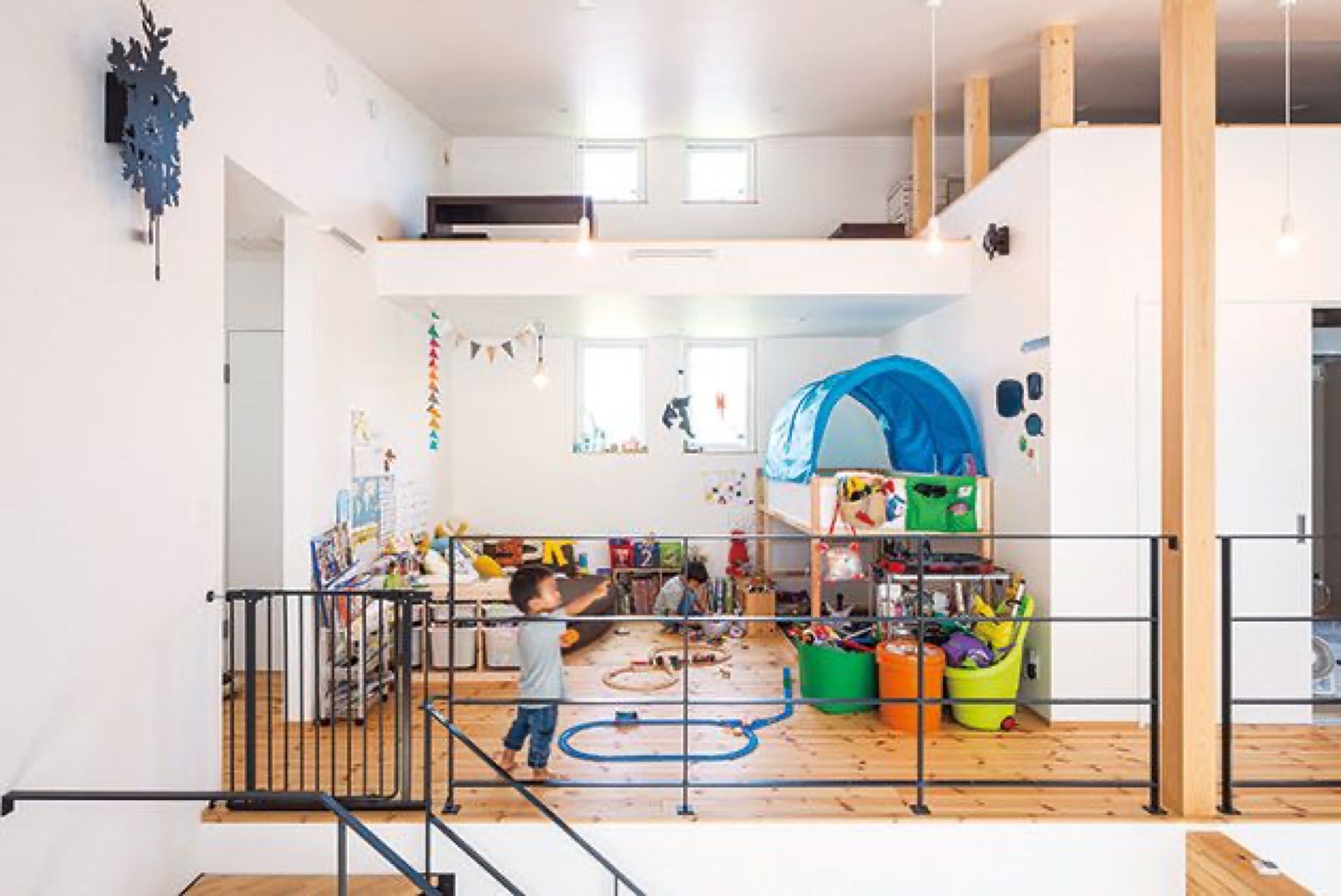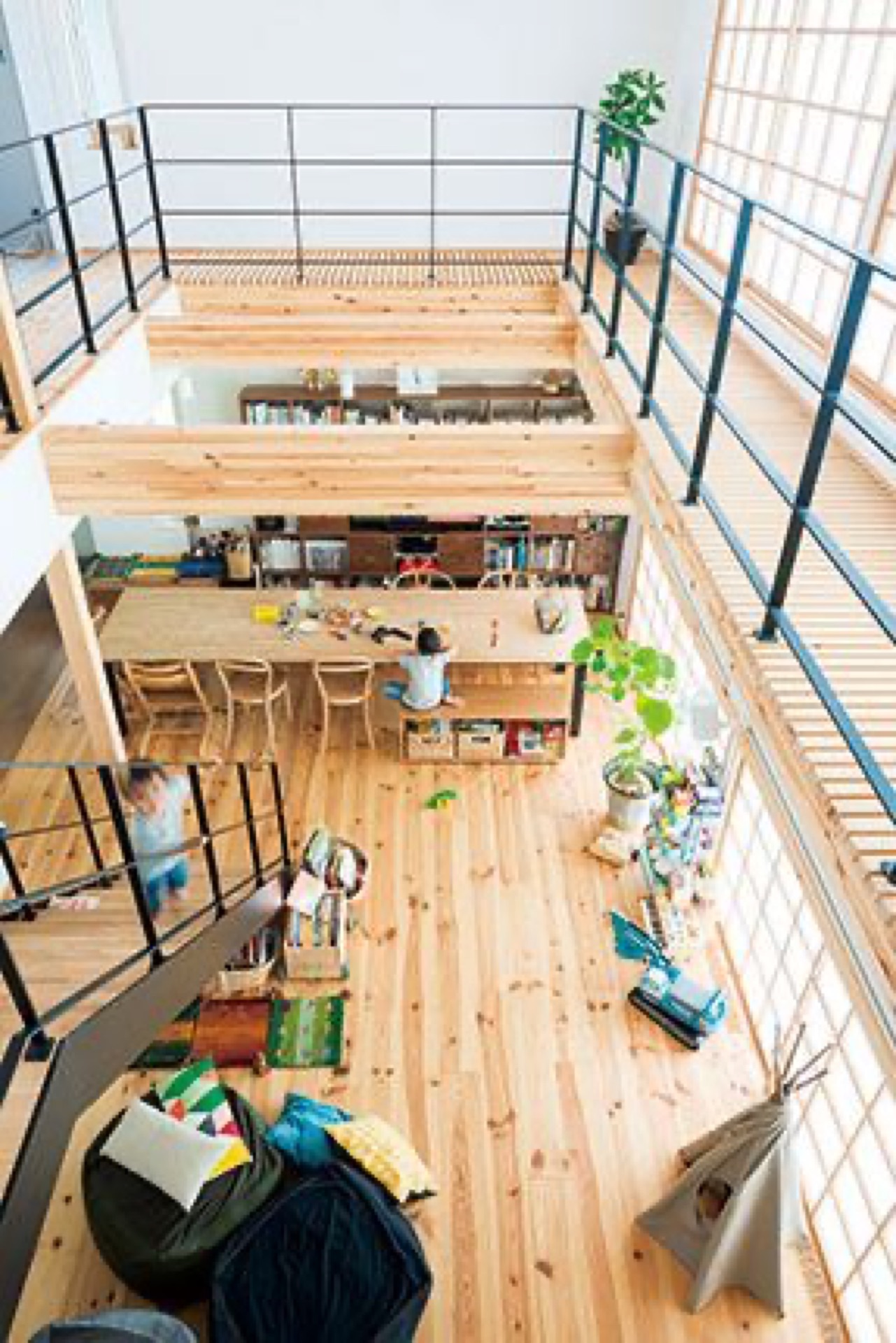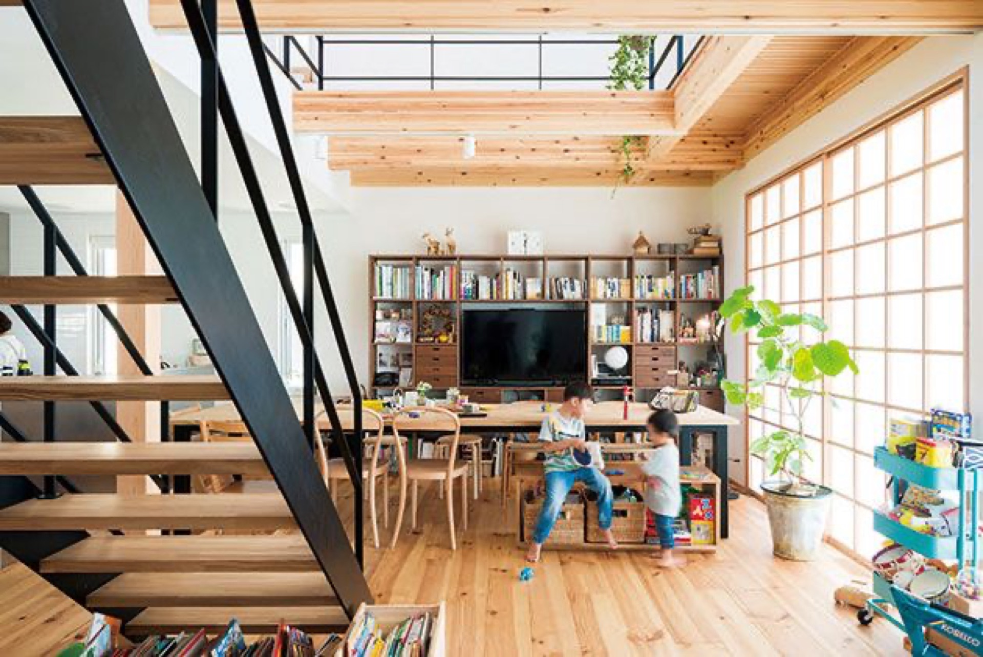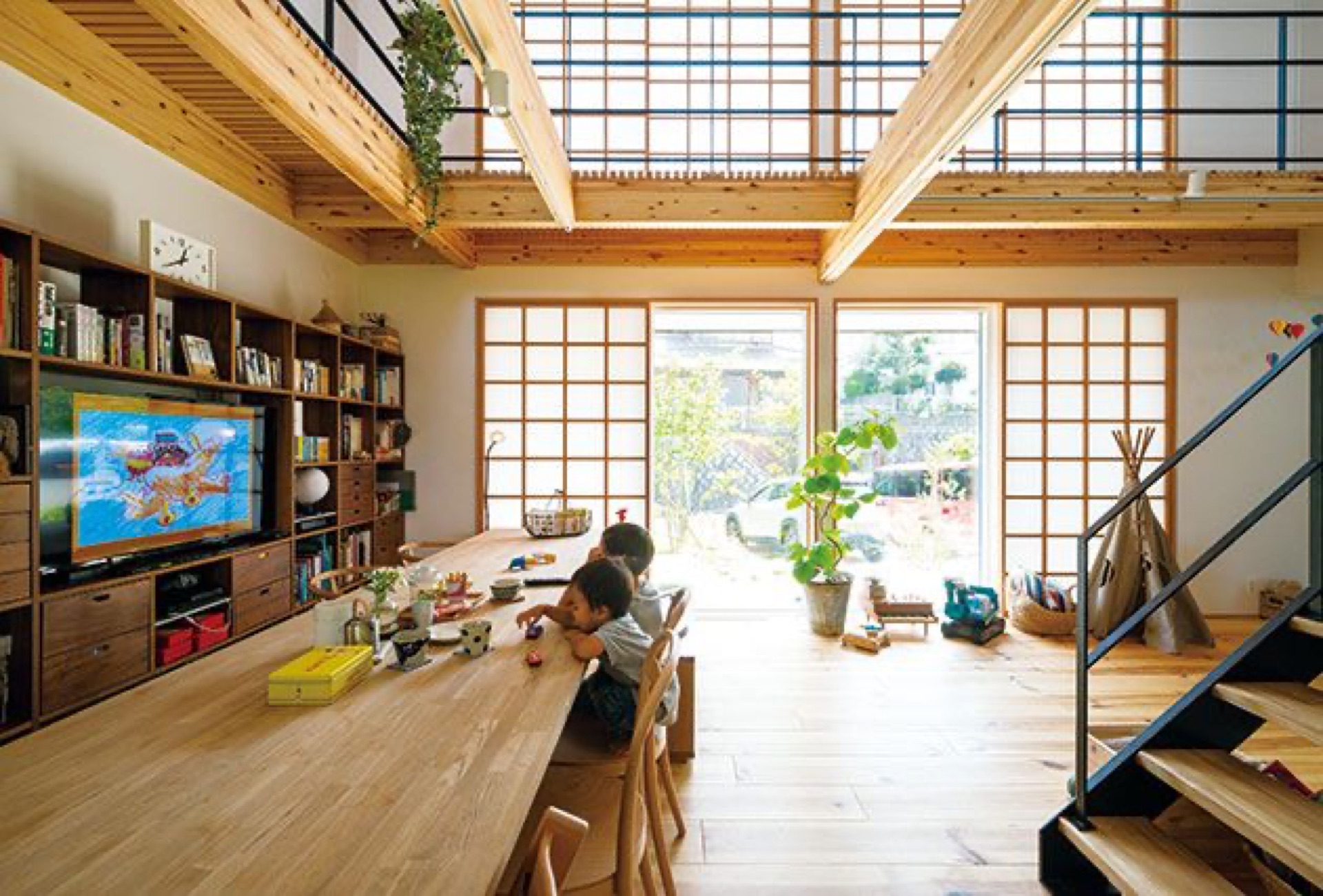 T様邸はパッシブデザインに必要な要素はすべて押さえた省エネで快適な家。高い断熱性、夏季の日射遮蔽、冬季の日射取得、中間期の通風、日中は照明がいらない明るい間取りを設計しました。「広々とした空間で伸びやかに暮らしたい」との想いから、邸内はできるだけ部屋と部屋の区切りをなくし、吹き抜けを設けた大空間に。それでいて真夏も真冬も6畳用エアコン1台でまかなっています。このオープンな空間には、家全体の温度や湿度が一定に保たれ、また、お子さんたちが環境雑音に左右されず、集中力を身に着けてほしいとの想いも託されています。そんなT様ファミリーの暮らしの中心には、3メートルを超えるダイニングテーブルが。食事はもちろん、遊び、勉強、家事、読書などすべてがここで行われます。各居場所がひとつながりになったこの家で、お子さんたちは健やかに成長します。