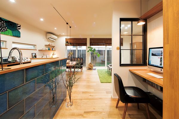 コンパクトな家ですが、スリットの窓などで視線のヌケを生み出したOさま邸。実際の広さ以上のゆとりを感じさせることや、施主さまの好みの色をセンス良く取り入れるようにしました。お手持ちの家具に合わせて造作家具を設計した点もポイントです。