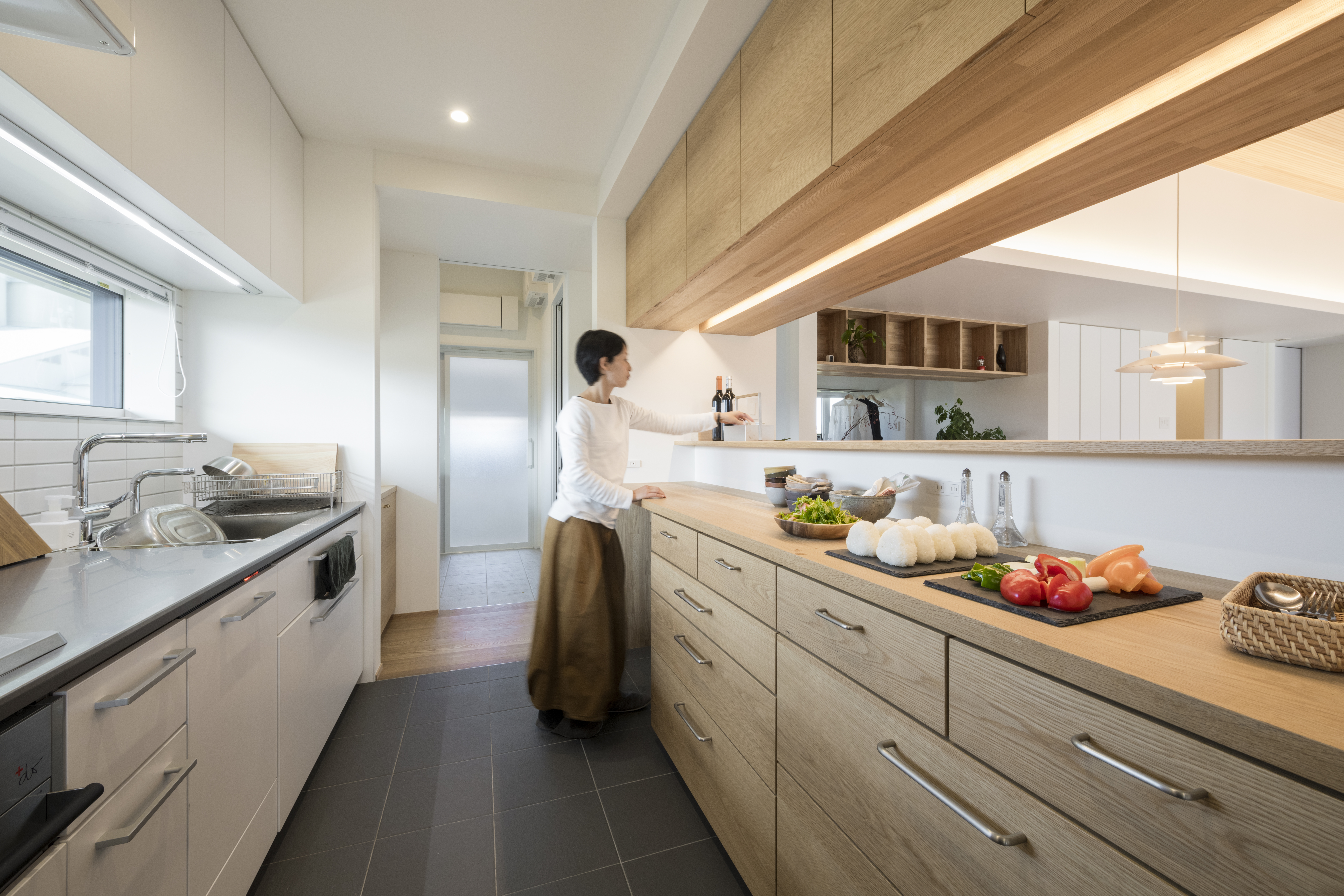 プライベート空間は造作家具でコーディネート。家具が不要となり、シンプルな暮らしを楽しめます。照明は暗めにし、ほどよいおこもり感も演出。