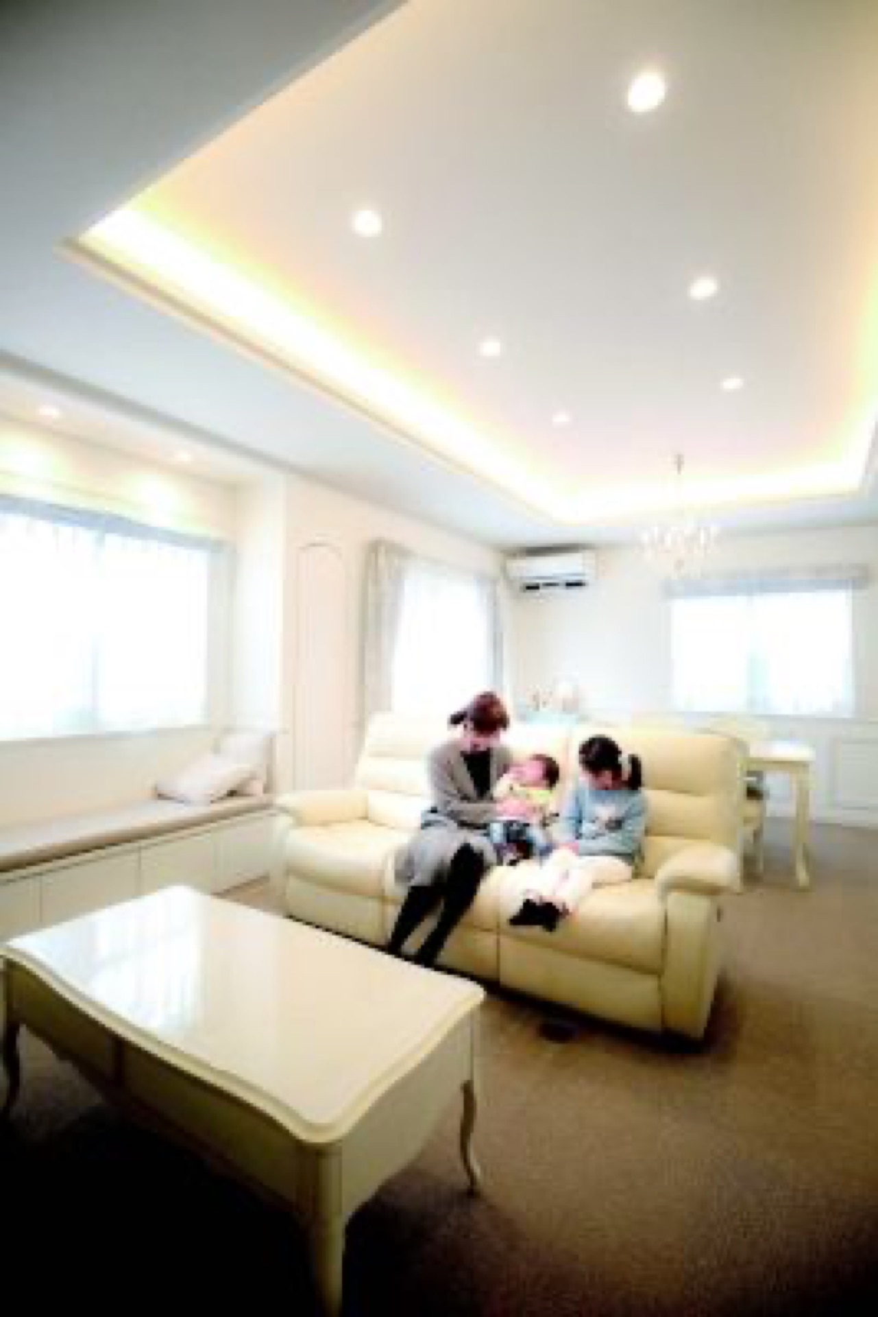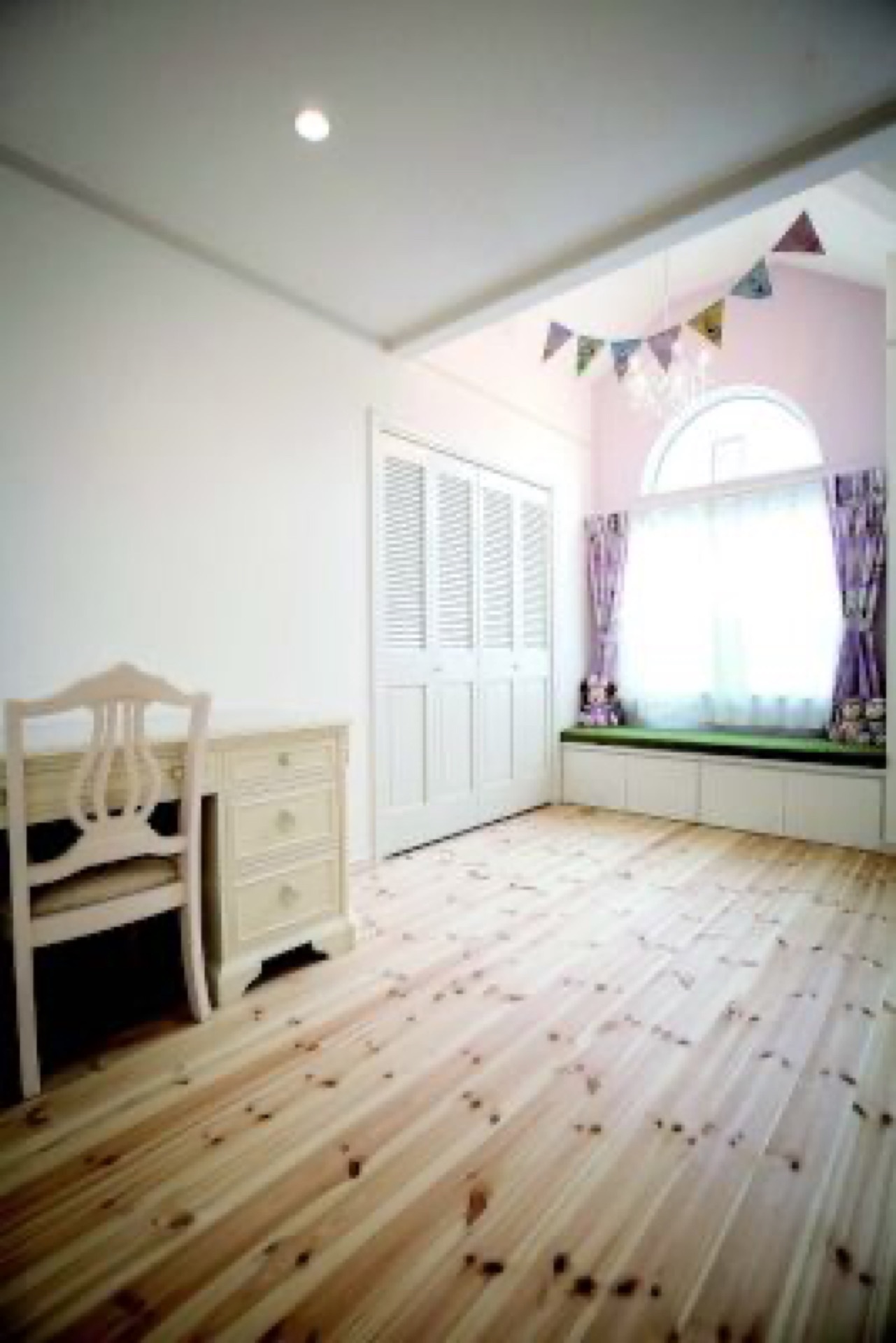 ハーフラウンドの窓をアクセントにした外観は、端整なたたずまいのなかに、かわいらしさを漂わせている。室内もまた外観と同様で、白を基調にアイアンの手摺りや輸入扉など、優美なデザインが取り入れられている。そしてリビングには、施主さまのこだわりだったベンチシートとアーチ型の扉を付けた収納を設置。2階ホールはピアノを置くフリースペースとした。青野さんは、長期優良住宅、耐震等級3、地中熱利用熱交換システムの採用など、安心して快適に暮らせる仕様を提案。キッチン、きれいな空気のなかで洗濯物を乾かせる洗濯室、浴室を一列に配置した家事効率のいい動線や、豊富な収納など、暮らしやすさを実現する設計も特徴。心地よさや便利さが豊かな時間をもたらし、こだわりや要望を形にした空間が心を満たす家である。