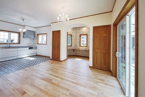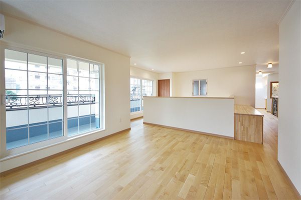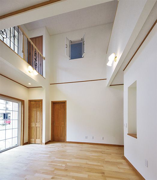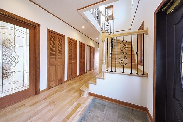白とレンガの2トーンでまとめた外観は、バルコニーのアイアンがアクセントに。施主様こだわりの照明を設えたLDKは、採光を多く取ることで、明るく開放感のある印象になりました。家族が集まる場所で勉強をすることが多い3人のお子さんのため、ダイニングの奥に、オープンな勉強スペースを設置しました。ゆとりをもって設計した玄関ホールには、家族1人ずつのクローゼットルームが並びます。お出かけ前後の動線が効率的になるよう、奥様の希望を反映させました。2階には来客にも対応できるように、4.2畳のゲストルームやセカンドリビングを設置。子ども部屋の引き戸を開けるとひとつづきの空間になります。リビングは吹き抜けでつながりのある空間に。2台のエアコンで家全体の空調をまかなえる高い気密・断熱性を実現しています。