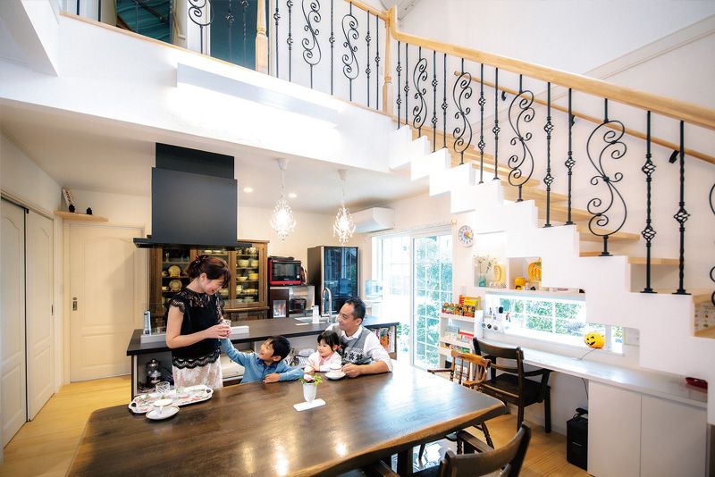 アイアンの手すり階段が存在感を放つ大空間のリビング。「将来は1階のみで生活できるように」と、寝室を1階に設け、クローゼットとユーティリティルームを直接つなげ、回廊動線にするなど、間取りにもご夫妻のこだわりが光る。さらに、地中熱利用の熱交換式換気システムの採用により、家じゅうの空気がきれいに保たれ、快適に過ごしているそう。予算内で期待以上のマイホームが実現できたことに大満足のご夫妻。友人を招くのも楽しみだそう。