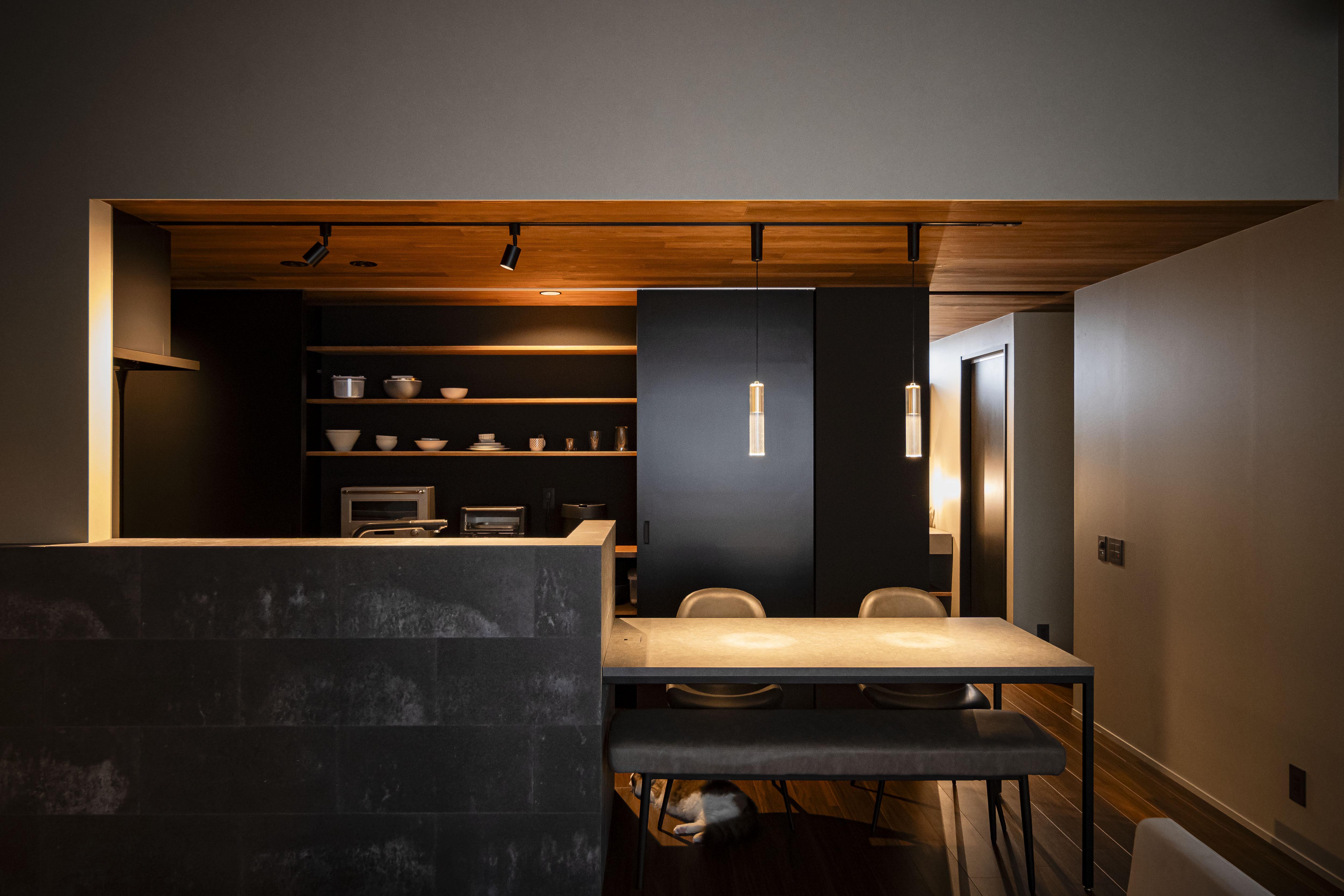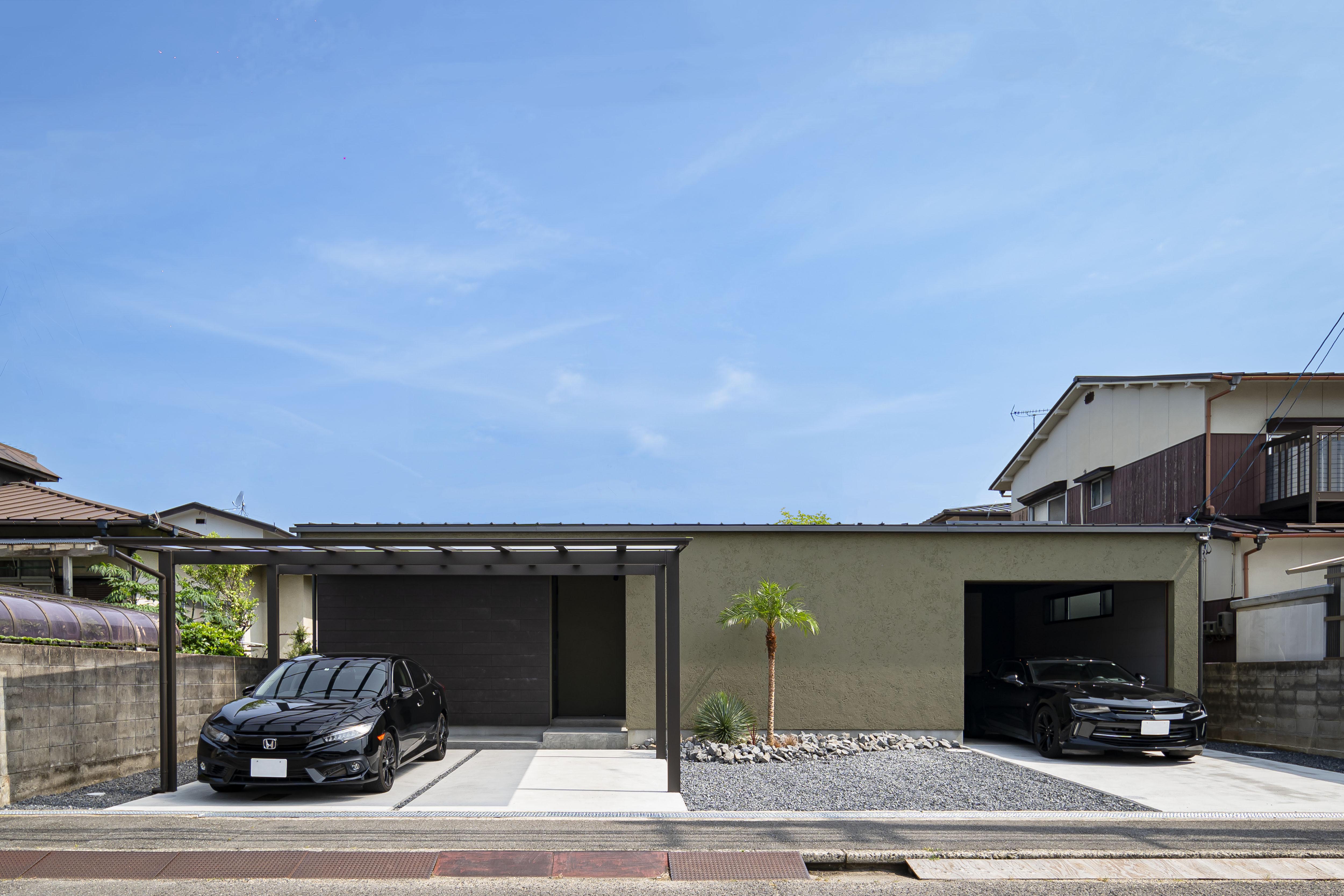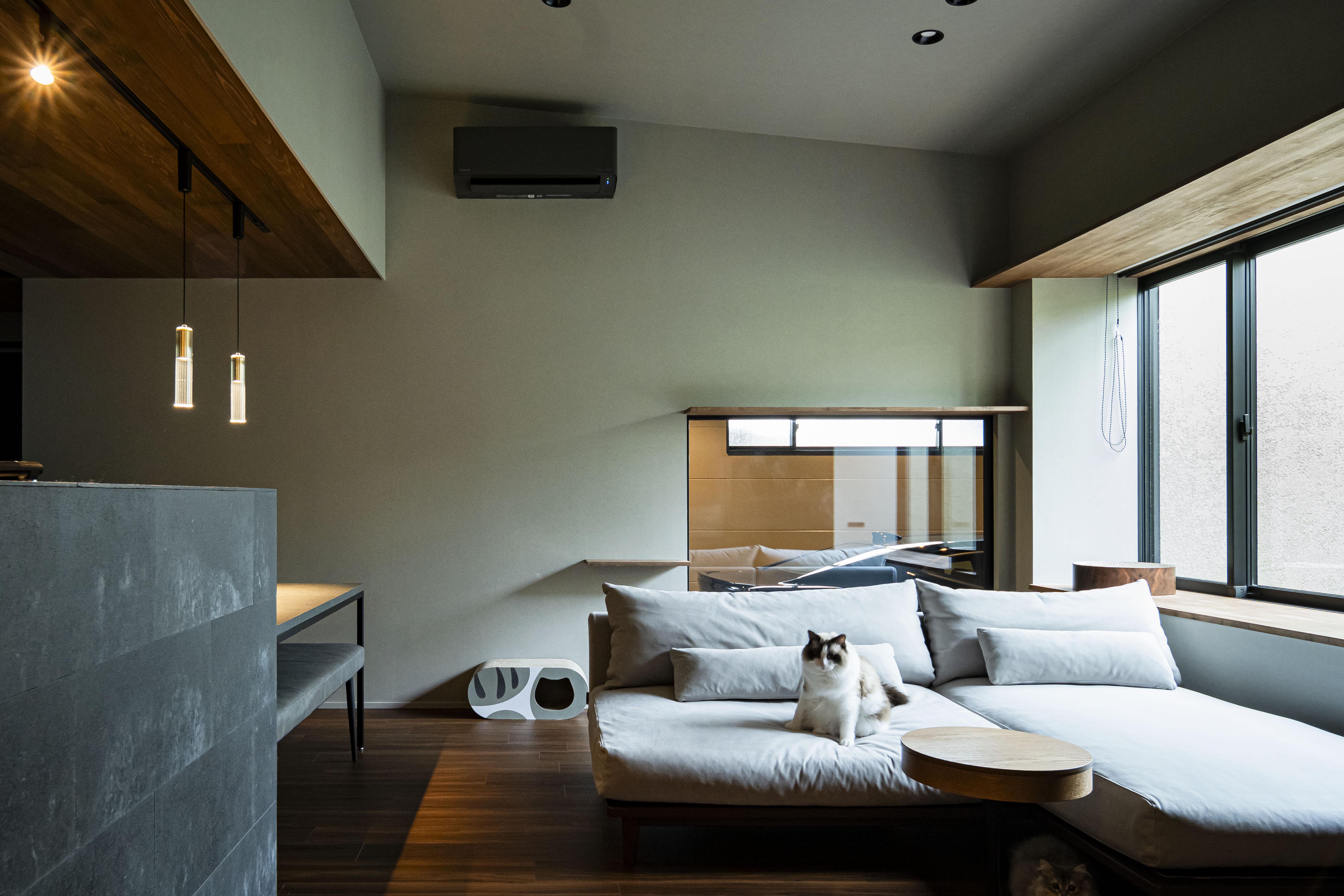 ともに車が好きで、車がきっかけで出会い結婚したご夫妻。ある意味、運命的な出会いでご夫妻と一緒に暮らすことになった美しい2匹の愛猫たち。だからこそ「車と猫と一緒に、快適に暮らせる」が譲れない条件だったという2人+2匹の新しい住まいは、ご夫妻と建築家のセンスがコラボレートした“作品”でもある。室内からいつでも好きなときに車を眺められるインナーガレージ、キャットウォークやキャットドアなど、愛猫がストレスなく人間と楽しく暮らせるちょっとした工夫の数々。微妙にトーンが変化していく巧みな色使い、光と陰のコントラスト、テーマや用途に分けてメリハリを持たせた空間。生活を感じさせないながらも、心から落ち着いてくつろげて、プライバシーがしっかり保たれているからカーテンも不要。年月が経っても変わらず“お気に入りの場所にいる”自分が想像できる場所がある。