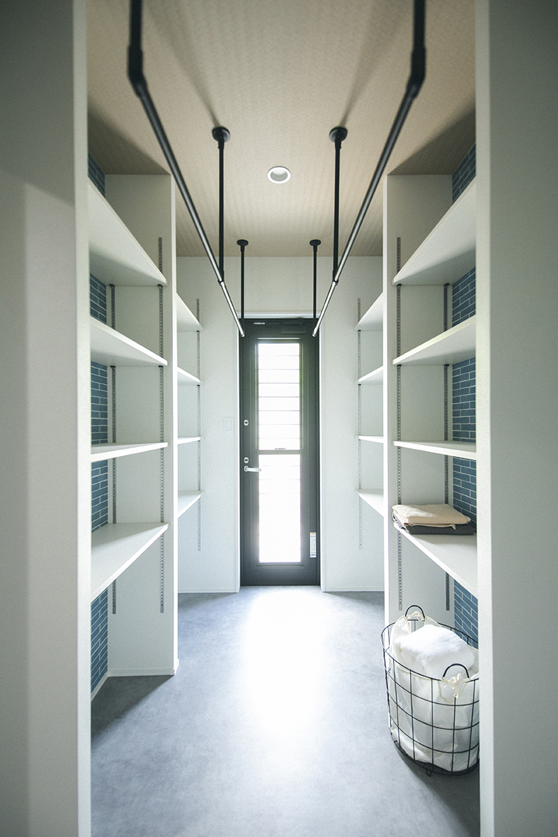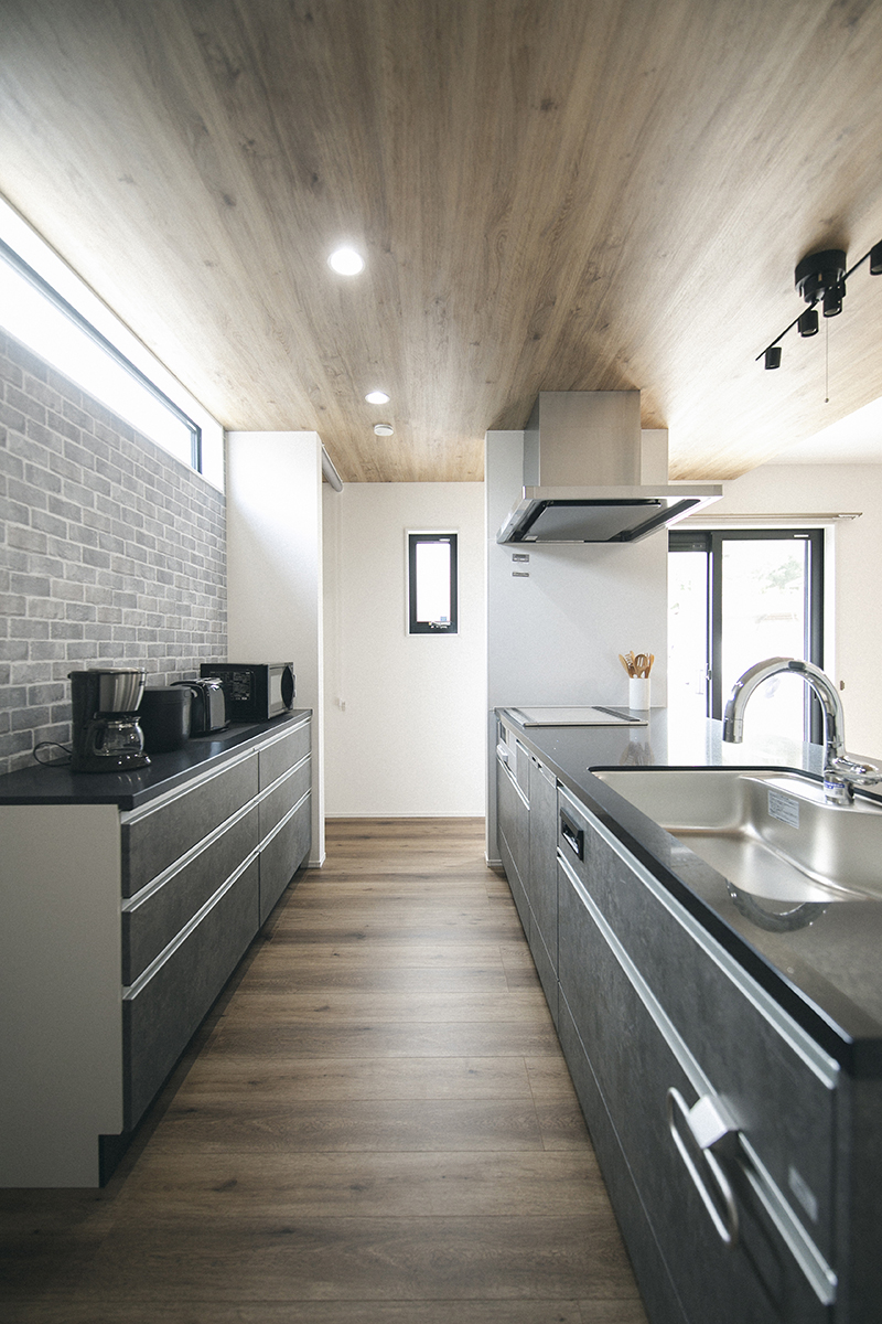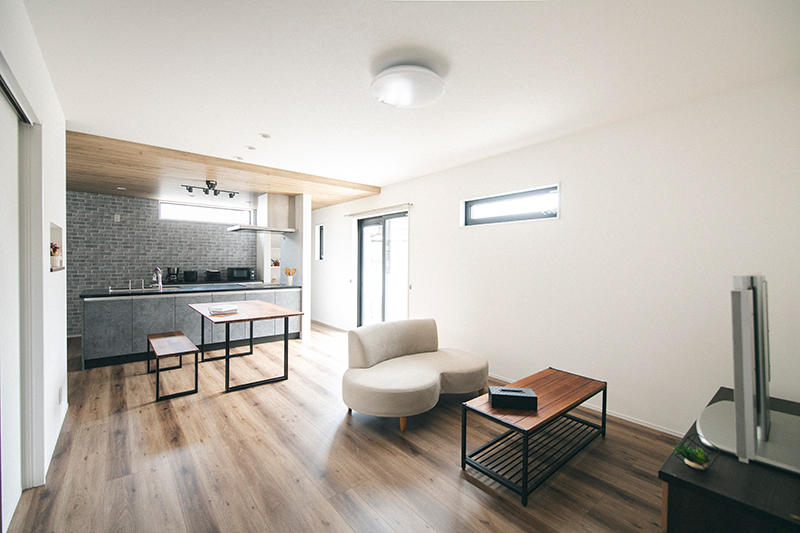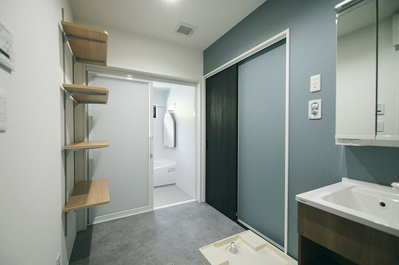 広々としたリビングには折り下げ天井と大きな窓からの光が差し込み、開放感にあふれた空間に。回遊性のあるキッチンや、便利な土間収納を備えた玄関が、日々の暮らしをより快適にサポートします。くすみブルーのアクセントクロスが印象的な洗面脱衣室は、機能性とデザイン性を両立した心地よい空間です。
