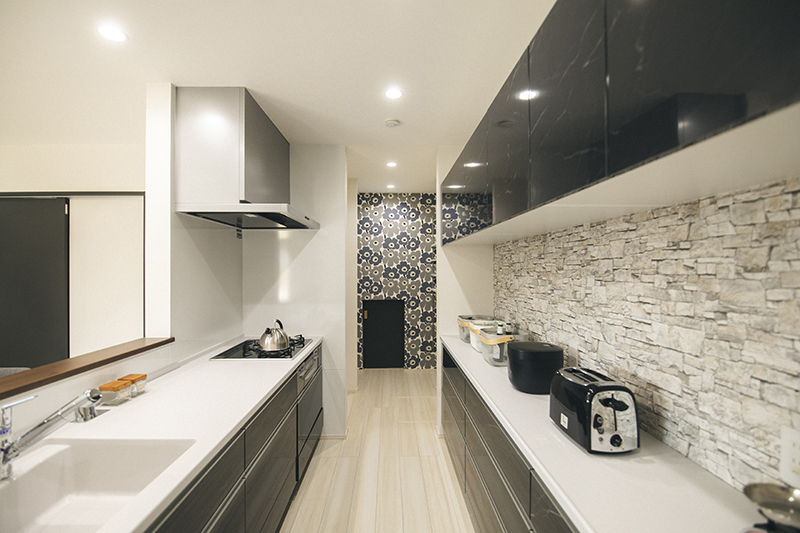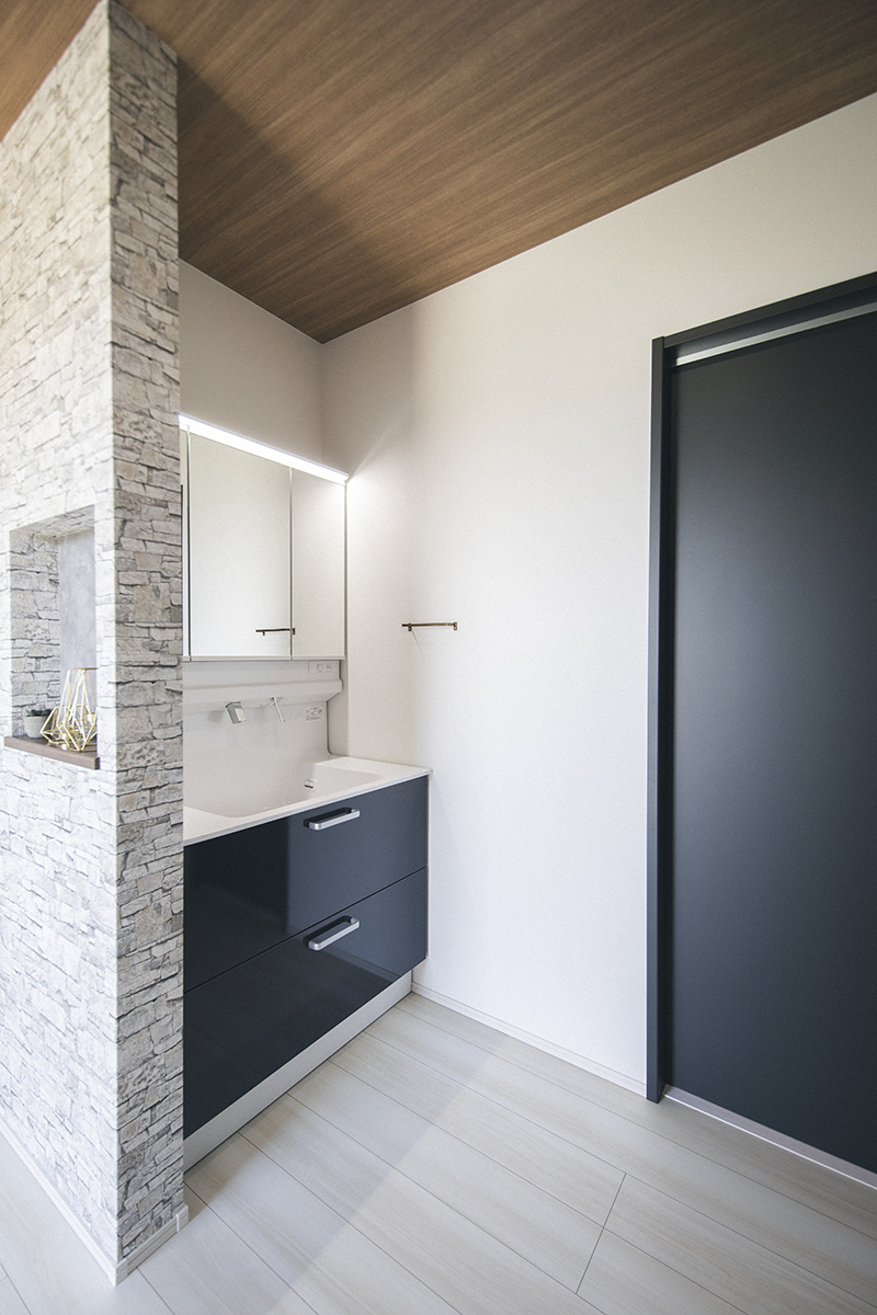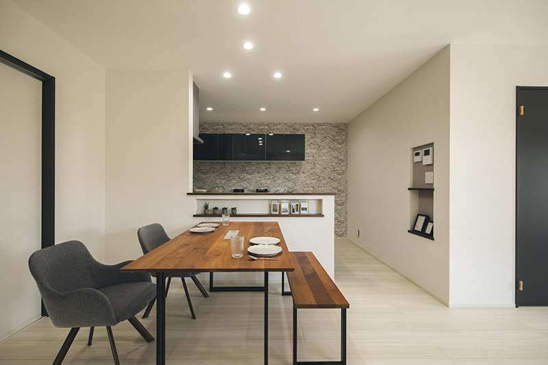 広々とした土間収納は靴やアウトドア用品をたっぷり収納でき、玄関ホールの洗面化粧台で帰宅後すぐに手洗いができる安心設計。土間収納からパントリーに直結した動線や回遊性のある間取りで、毎日の暮らしがより快適に。L字型のLDKは家族の気配を感じながら、程よい距離感が心地よい空間です。