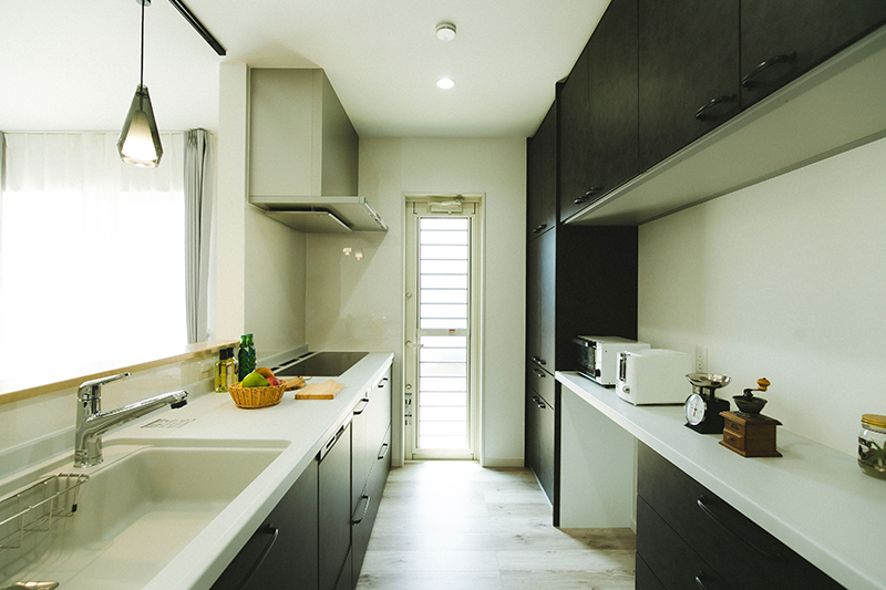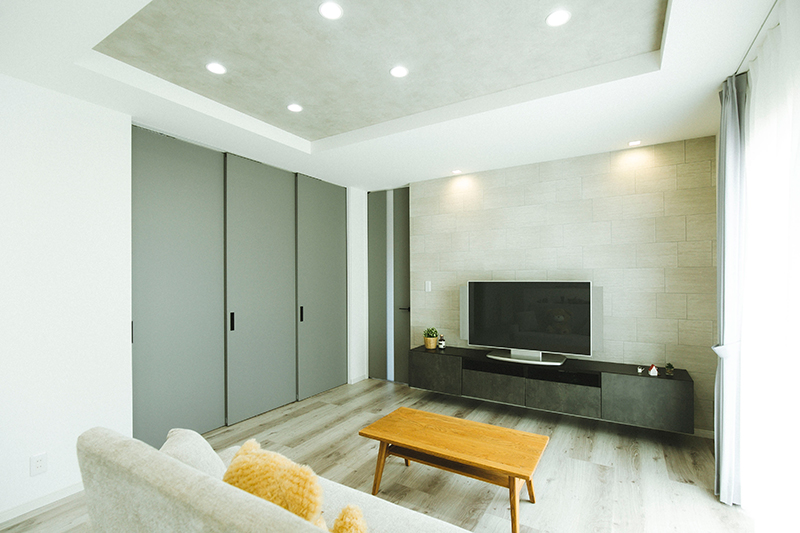 白を基調としていますが、要所要所で落ち着いた色味のアクセントクロスがあることでシックな雰囲気にまとまっています。みんなが使うLDKには視覚的にも広々と感じる工夫がされています。自然と家族が集まる心地の良い空間です。
