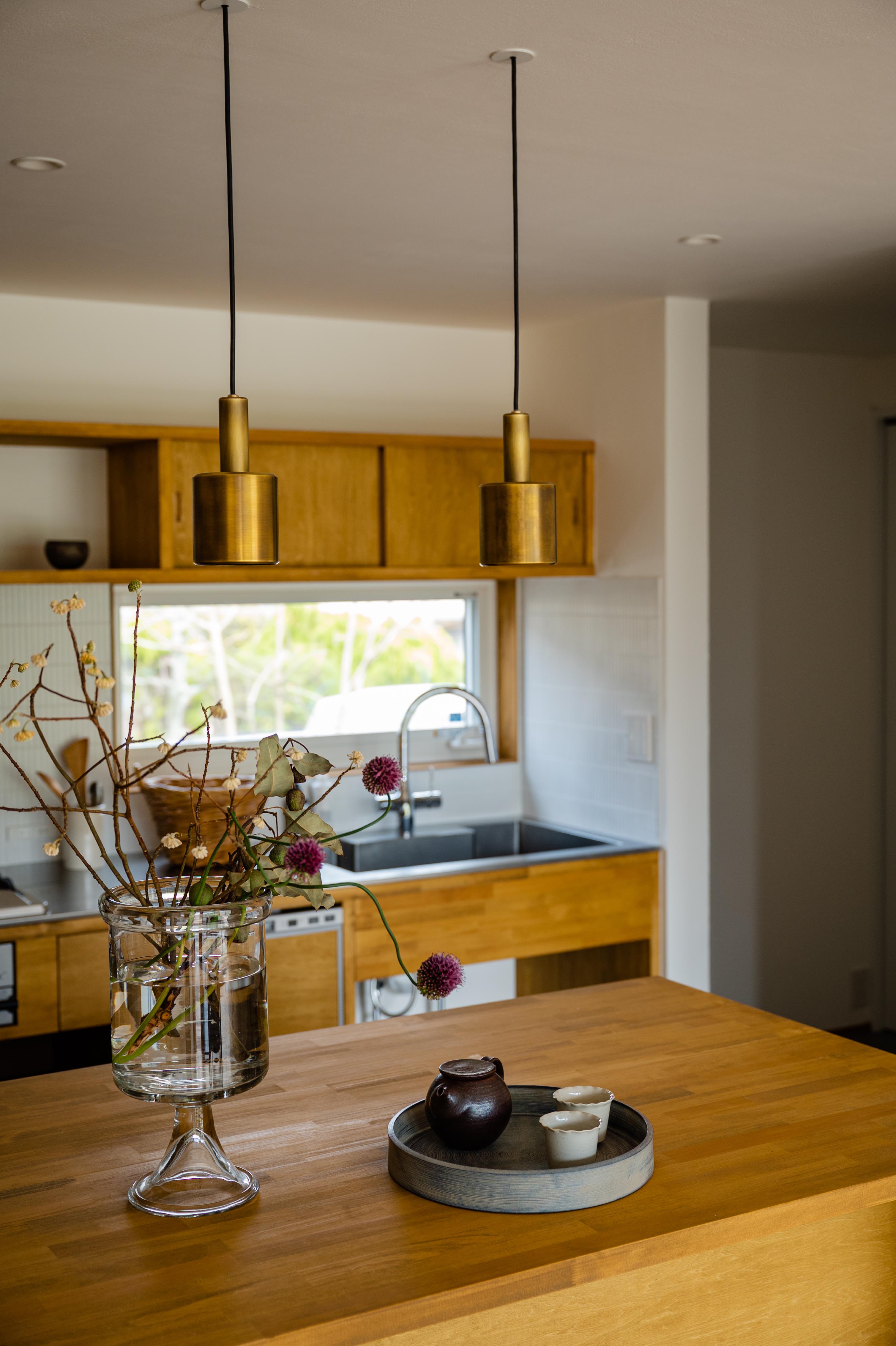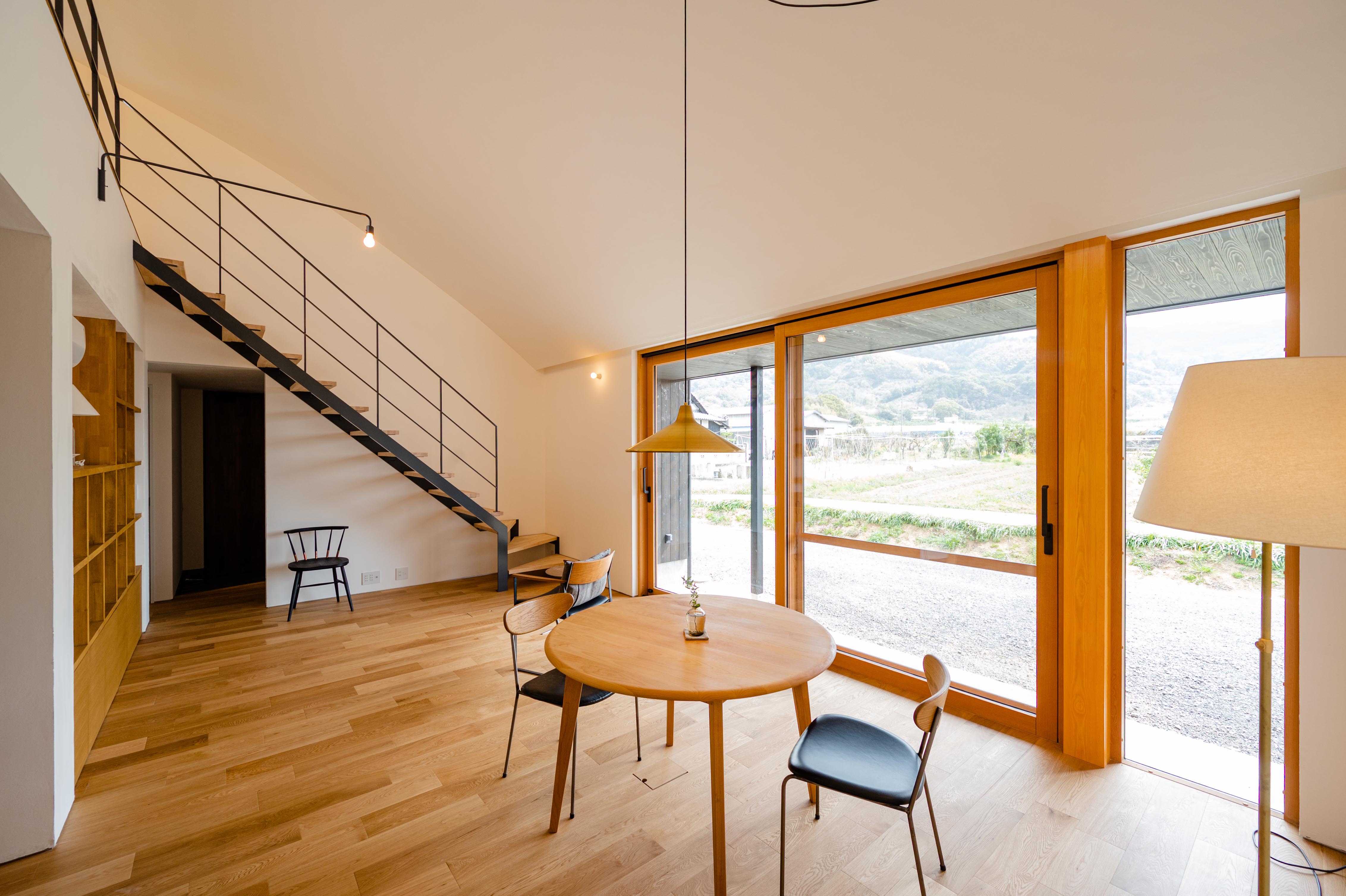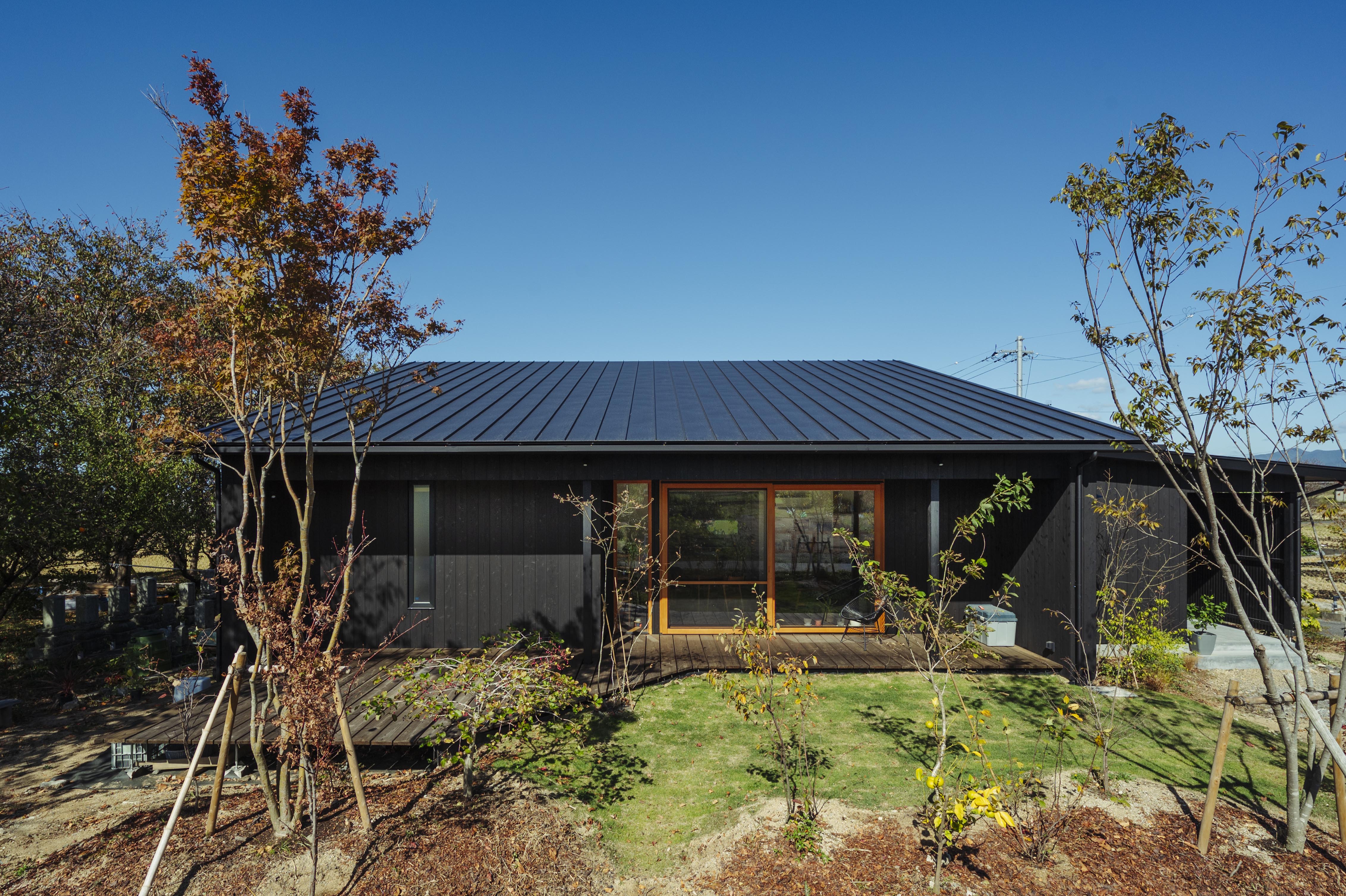 のびやかな田園地帯に計画されたTさま邸。夫のTさまはクリエイティブな仕事に就いており、計画地の準備の間、ラフ設計を自ら描かれた。西村さんは意図をくみ取り、打ち合わせを重ねながらブラッシュアップし、ライフスタイルと敷地の特性を鑑みたプランへと磨き上げた。緑豊かな周辺環境に映えるのは、外壁に施された焼杉のシックな黒。玄関棟・居住棟は、それぞれ流れの向きを変えた片流れ屋根によりリズム感を生み出している。ゆったりとした敷地には、施主さまが植栽されたグリーンが広がり、その情景は開口部の幅3.4mにも及ぶ木製サッシの大窓から邸内へと取り込まれた。深く出した軒は、強い日射を遮蔽するだけではなく、軒下に心地よい空間を生み出す効果も。アウトドアリビングとして、豊かなひと時を演出する。