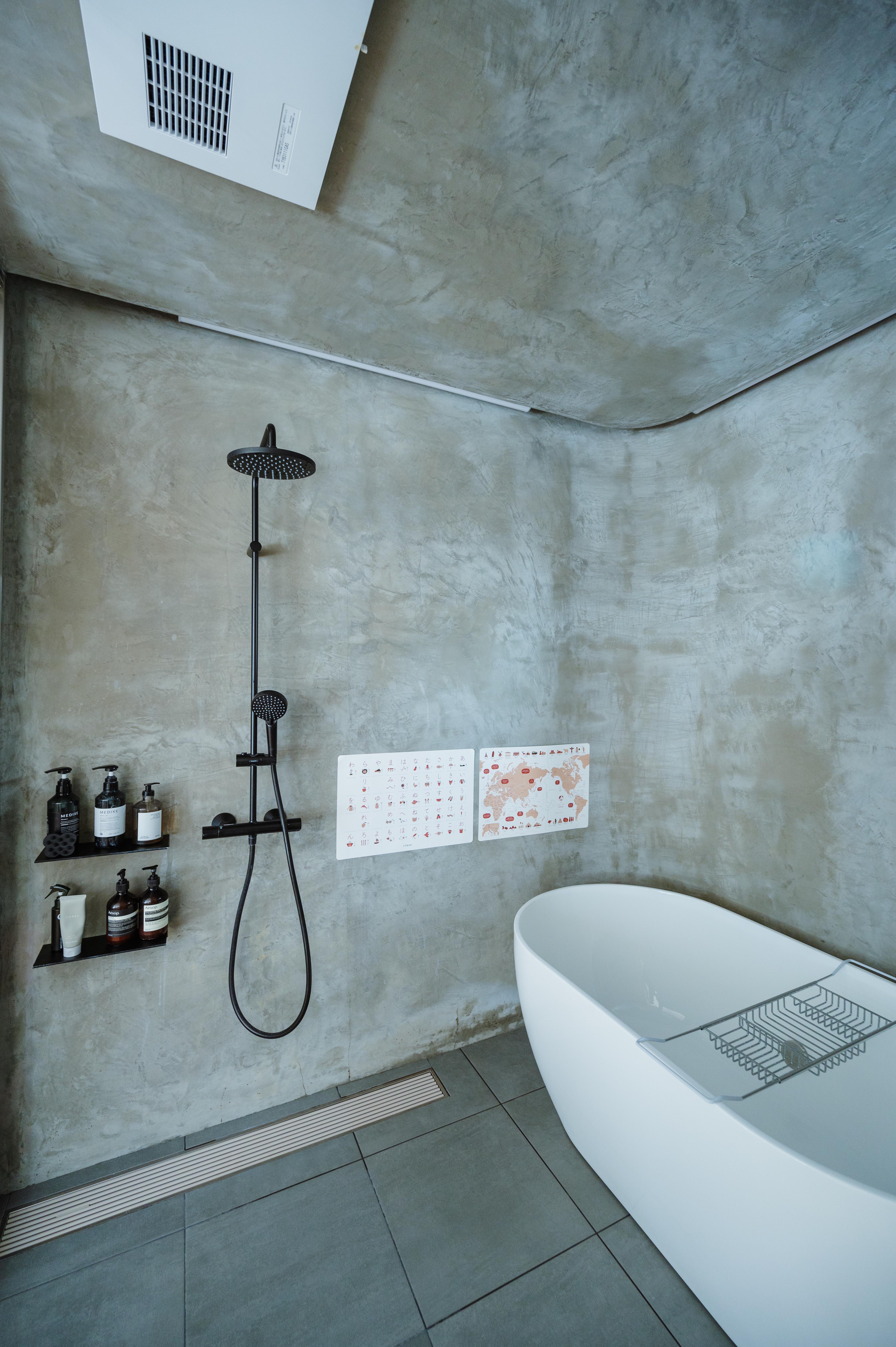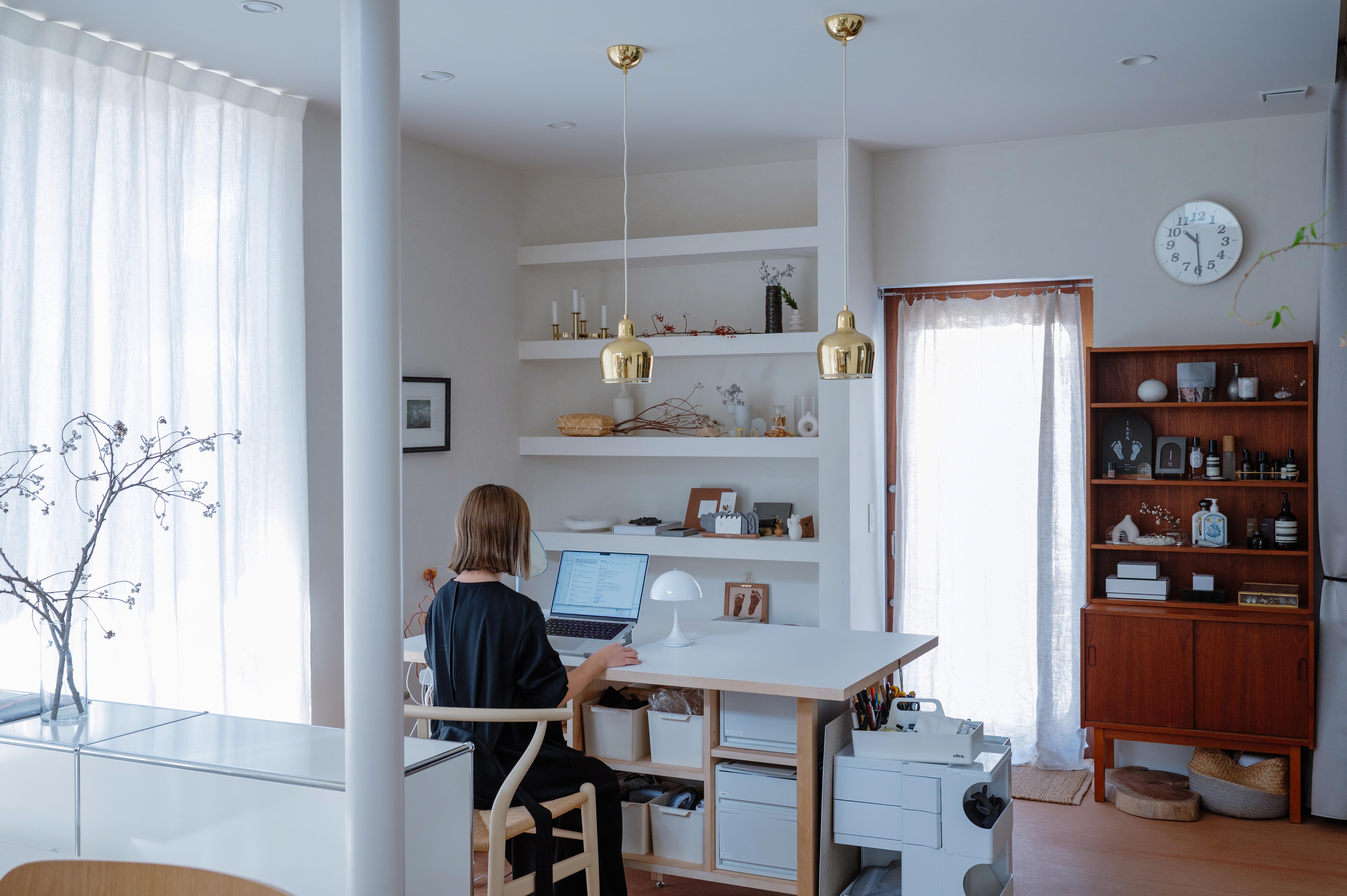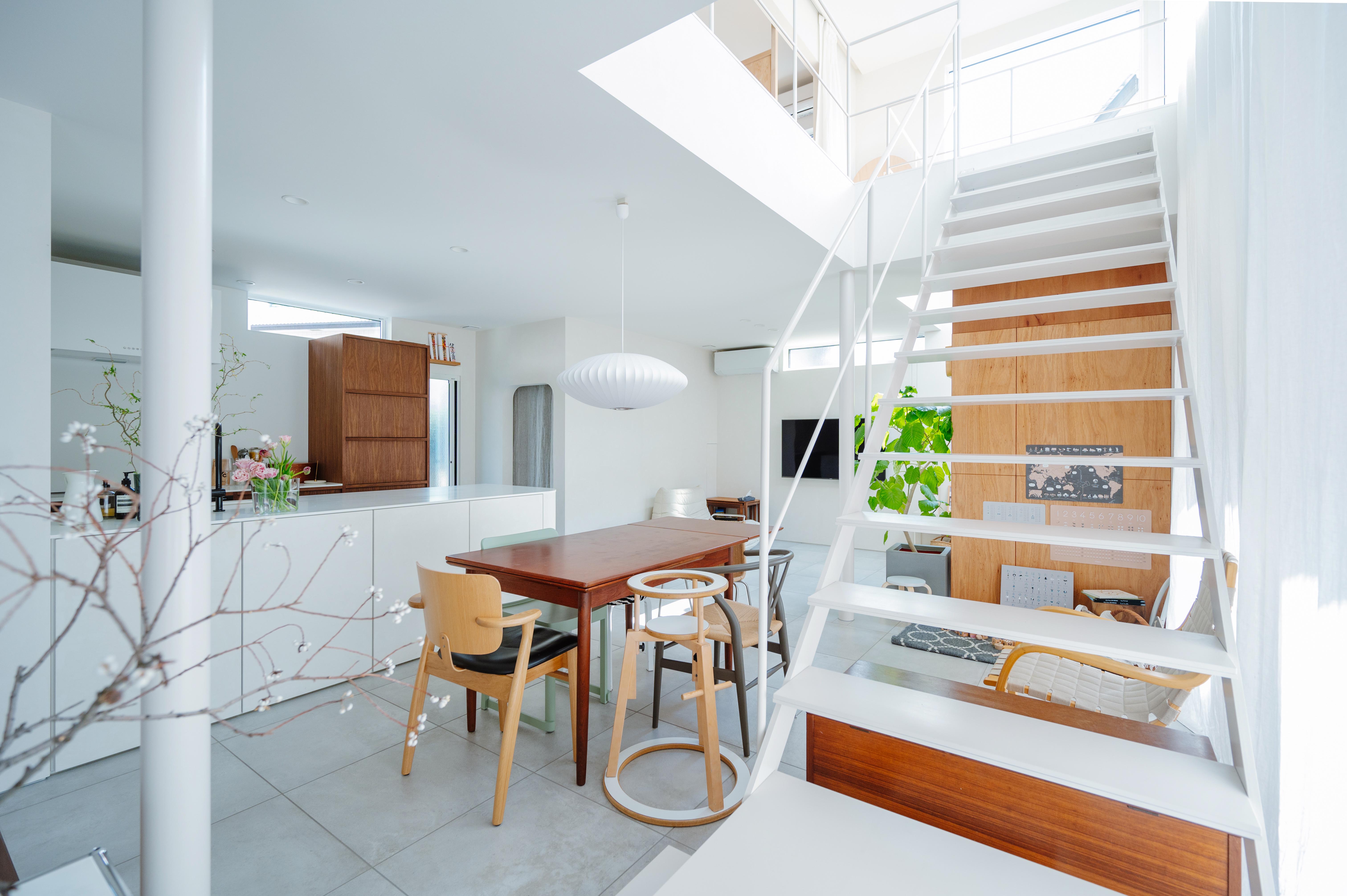 日本的な要素をなくすこと、キッチンやバスなどの設備に既製品を使わないことなどを望まれたIご夫妻。クリエイターであるご夫妻が、間取りの大ラフや、個性的なキッチンについての構想を描き、西村さんと話し合い完成系を求めた。白を基調に各所に取り入れたウッドが、絶妙なバランス。クールになり過ぎず、それでいてどこか近未来的なムードをまとう建物へと仕上がった。建築途中、次々と湧き出てくるアイデアにフレキシブルな対応をした西村さん。その好例がバスルームの壁。本来はタイル貼りで仕上げる予定だったが、「下地の状態がカッコいい」とIご夫妻。「飽きたらタイルを貼ってもいい」と柔軟に受け止め、センスあふれる施主さまが住みながらアップデートできる「余白」のある住まいとなった。