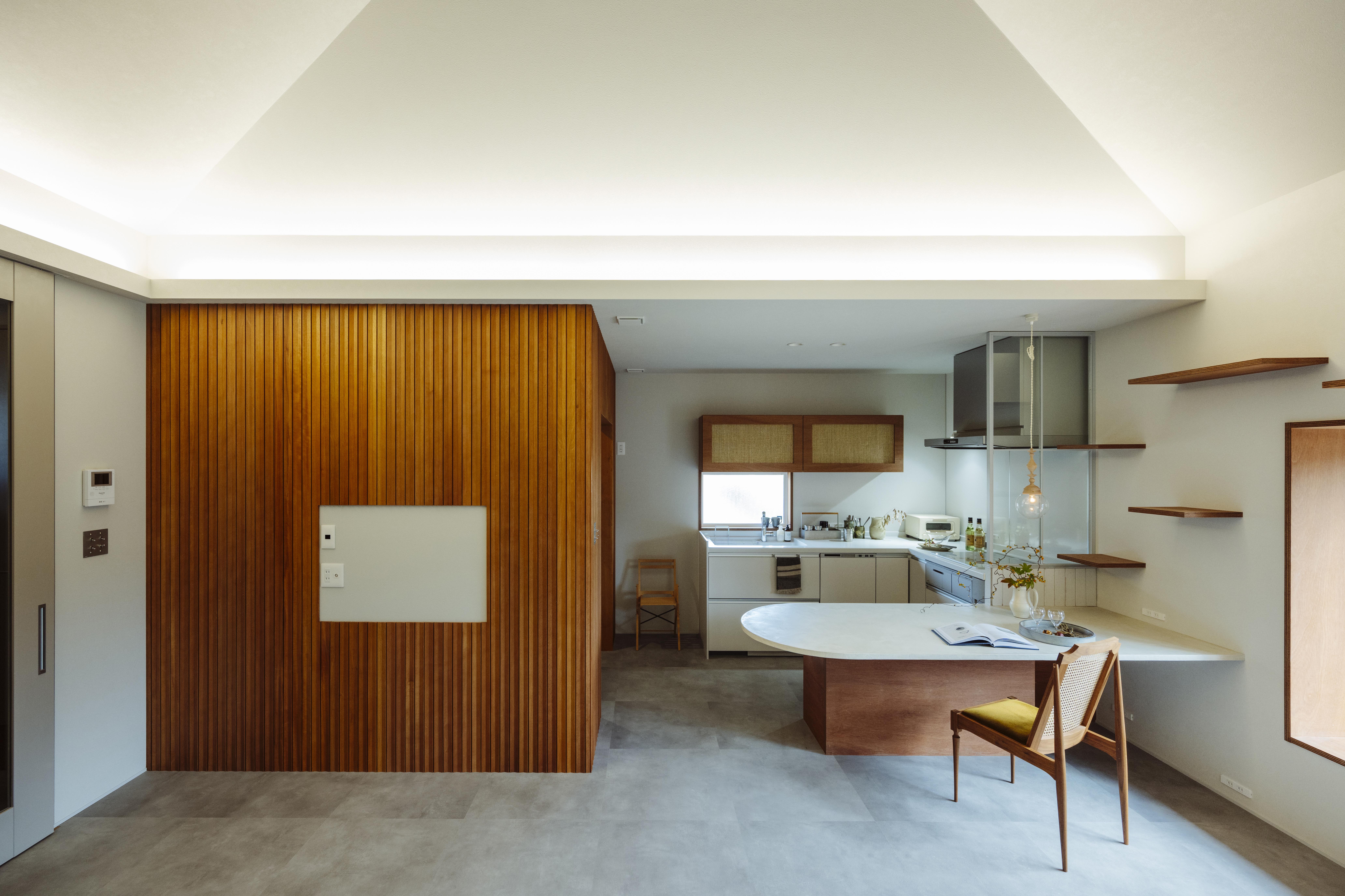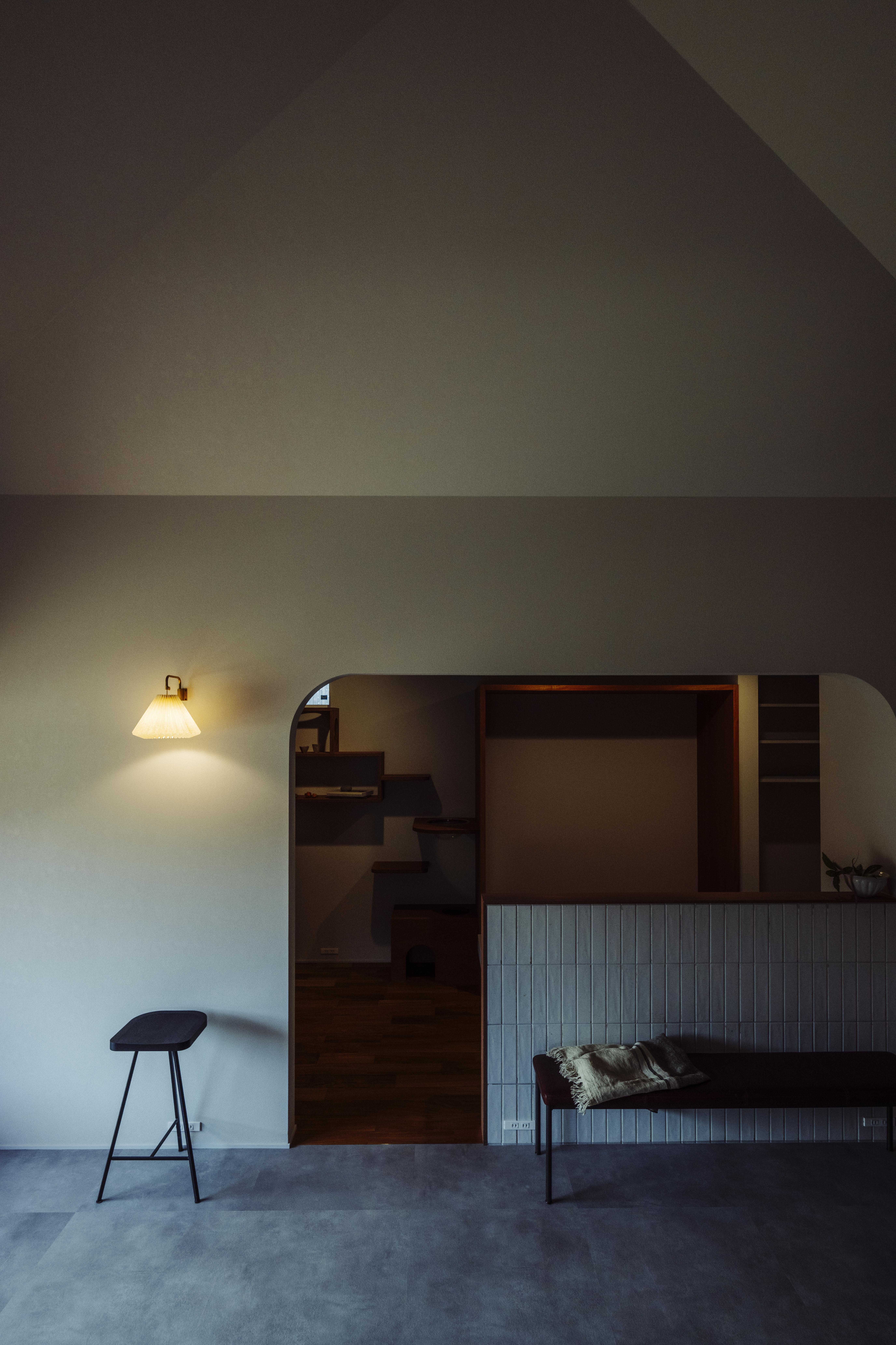 日本の寺院でよく用いられる方形屋根。屋内もその形状を活かし、天井は三角形が頂点へ延びる開放感あるデザインとした。自然光や間接照明が三角形をやさしく照らし、壁や造作テーブルなどに取り入れたRの弧との対比がアクセントに。機能性を保つデザインが活きており、水まわり以外は仕切りを設けず、大型パントリーや腰壁などでゾーニングし、すべてに手が届きやすい。愛猫たちもキャットウォークと通り抜け穴を行き来したり、飛び上がりやすい高さの出窓に座って外を眺めたりして、縦の動きが叶い、のびのびとくつろぐ。スマートな動線を意識した“猫と心地よく暮らす”家は、こんなにも自由だ。