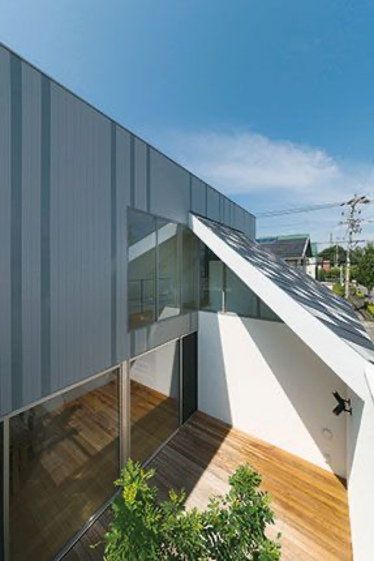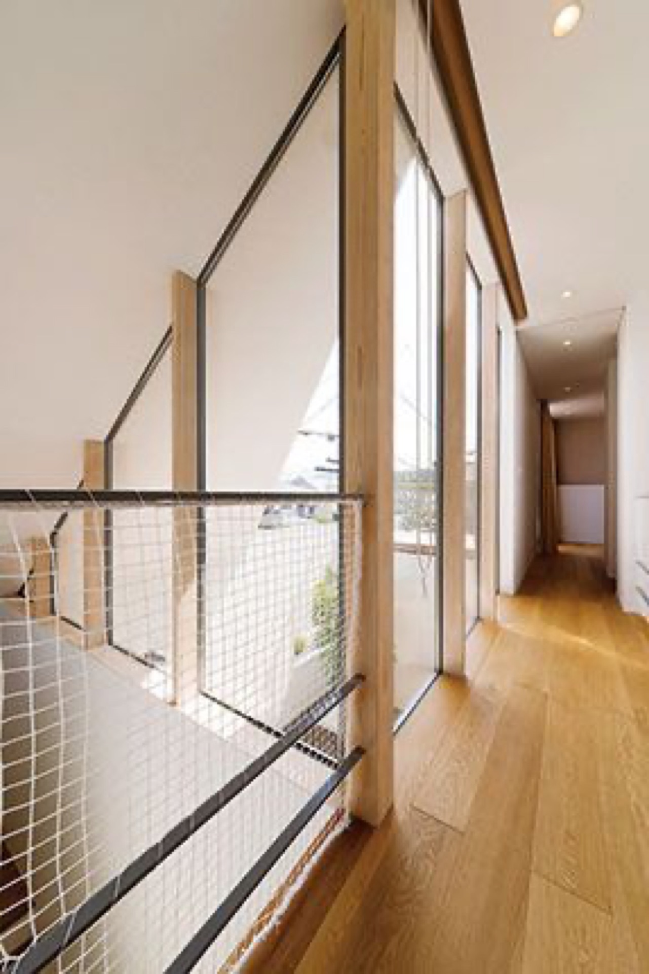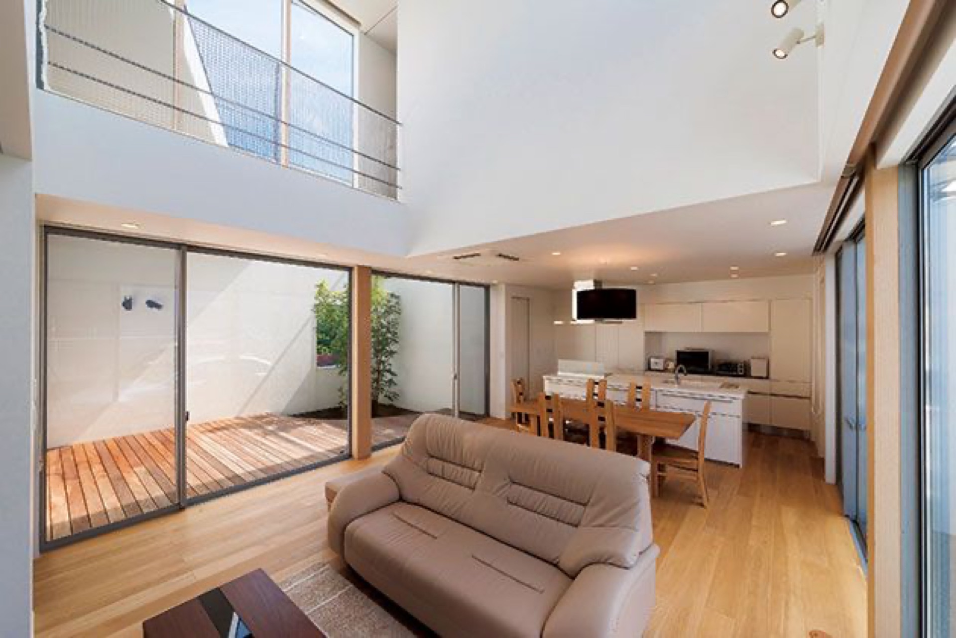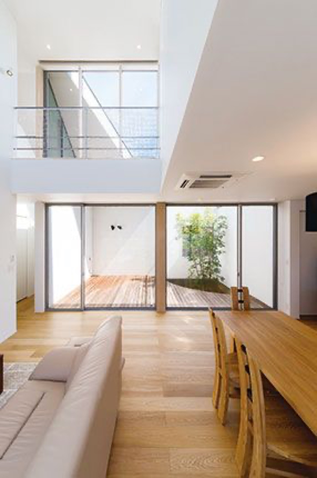 高台の閑静な住宅街の角地に建つT様邸は、美しい鱗をまとったような壁が印象的。ご夫妻が建築家に要望として伝えたのは「邸内の空間すべてがつながっている感じ」でした。1階と2階を大きくつなぐ吹き抜けを設けたLDKに、1階のすべての空間が面する形で配置。引き込み戸を多用しており、それらを引き込めば、つながりの連続性が生まれます。そして大きな開口部が中庭という半屋外空間との一体感や視線の開放をもたらし、つながりと共に体感的な広がりを実現しています。「別々の部屋で過ごしていても、会話できるような一体感があります」とT様。ロールスクリーンを見えないように納める、床の色と合わせた化粧貼り柱にする、障子を両面に張った扉、といった様々な効果で「すっきりと洗練された空間」がつくり出されています。